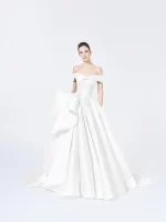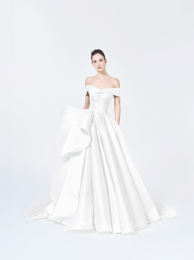 ANTONIO RIVAでは珍しい、オフショルダーデザイン。生地をバイアスカットし、しなやかな仕上がり。ワイドスカートが上品な雰囲気を引き立てます。(こちらのドレスは、当社エクスクルーシブデザインです。)