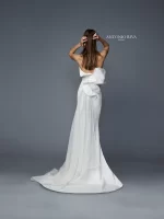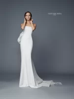 2017年コレクションをお客様のご要望に合わせて迎え入れた一着。とろみ感のあるジョーゼットクレープ生地がボディラインに添い花嫁の美しさを際立たせます。バックスタイルは、ANTONIO RIVAらしい立体感をシルクオーガンジーとジョーゼットクレープを組み合わせて表現。