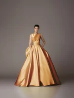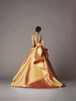 優雅で細部まで計算された構築的で上品な一着。 ボートネックのデザインは、首回りがすっきりしていて、クラシック且つ高貴な印象に仕上がります。 イエローは当社のために生地から染めたオリジナル。滑らかな光沢を放つ、華やかでエレガントなカラードレスです。