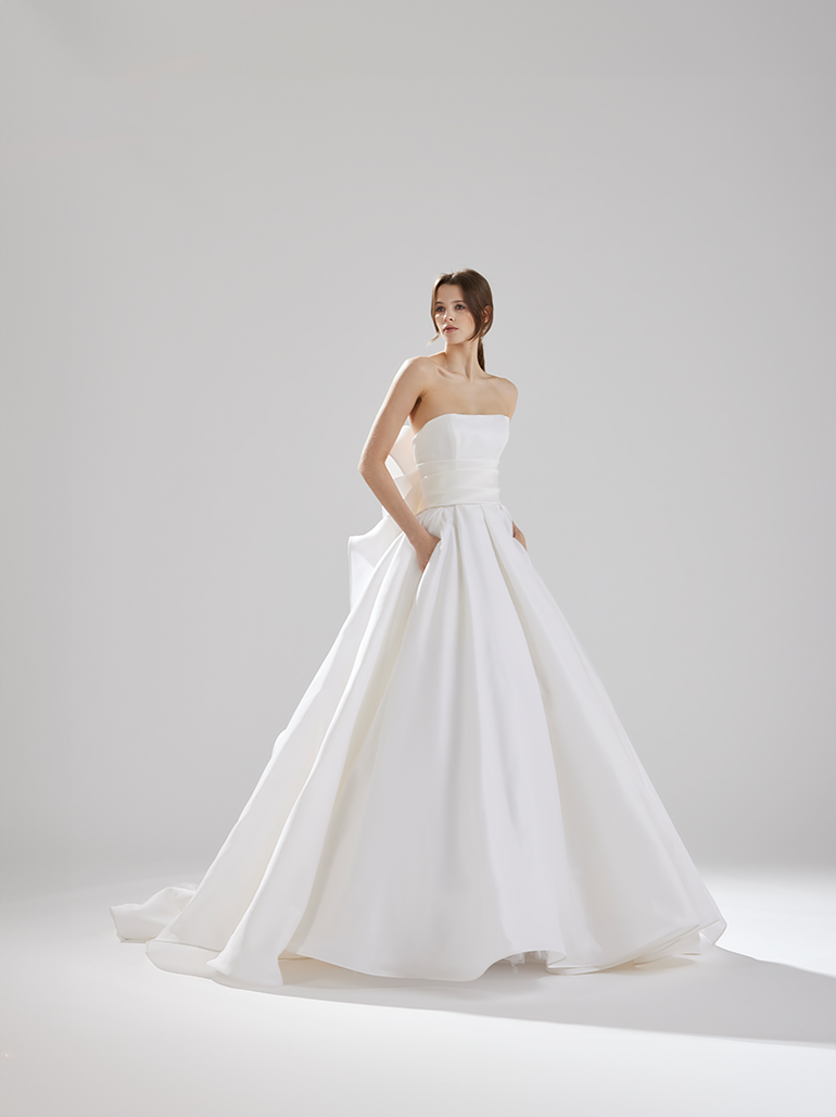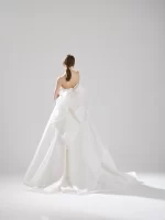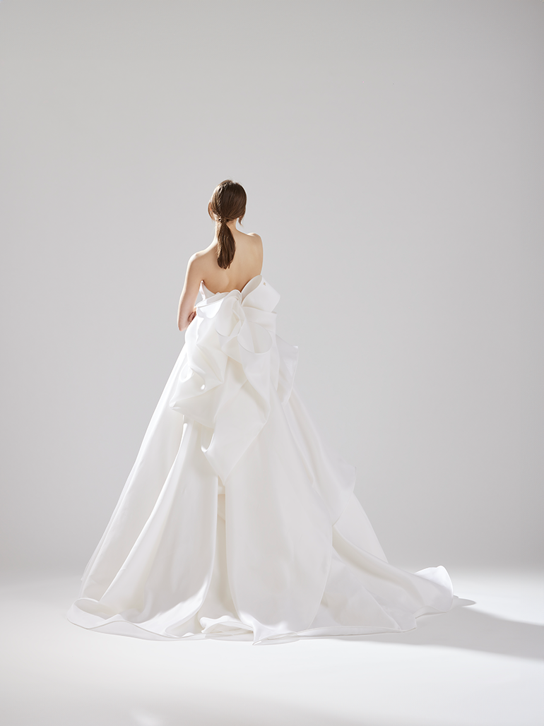 シルクガザ―ルという独特のハリ感ある生地がふっくらとしたスカートのシルエットを作り上げています。蝶々が羽を広げている様にも見えるバックモチーフが、シンプルなドレスに華やかさを加え、可憐な花嫁像を創り上げます。