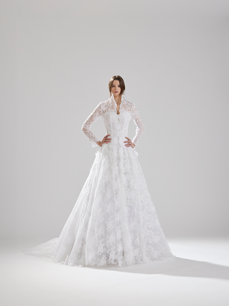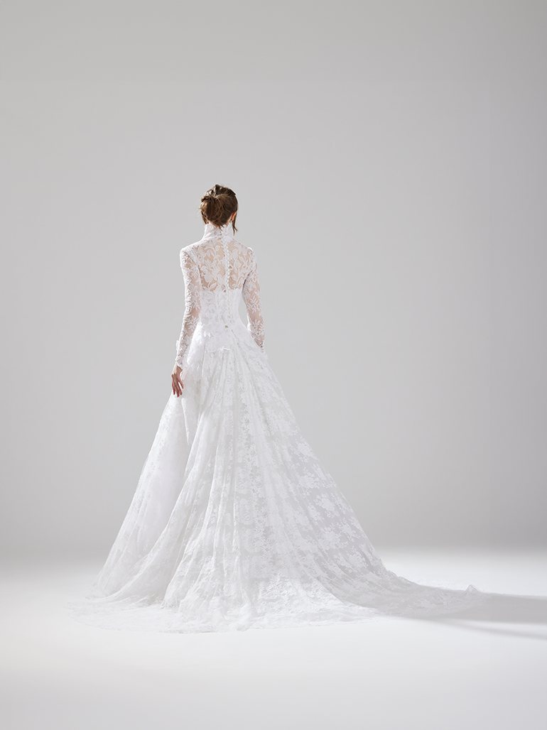 ANTONIO RIVAには珍しい総レースデザインですが、ANTONIO RIVAらしいシンプルなデザインでレースの美しさを際立たせています。レースモチーフの形状を活かしたハイネックデザインは、お顔回りを優しく包み込み、エレガントな印象に仕上げています。