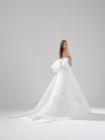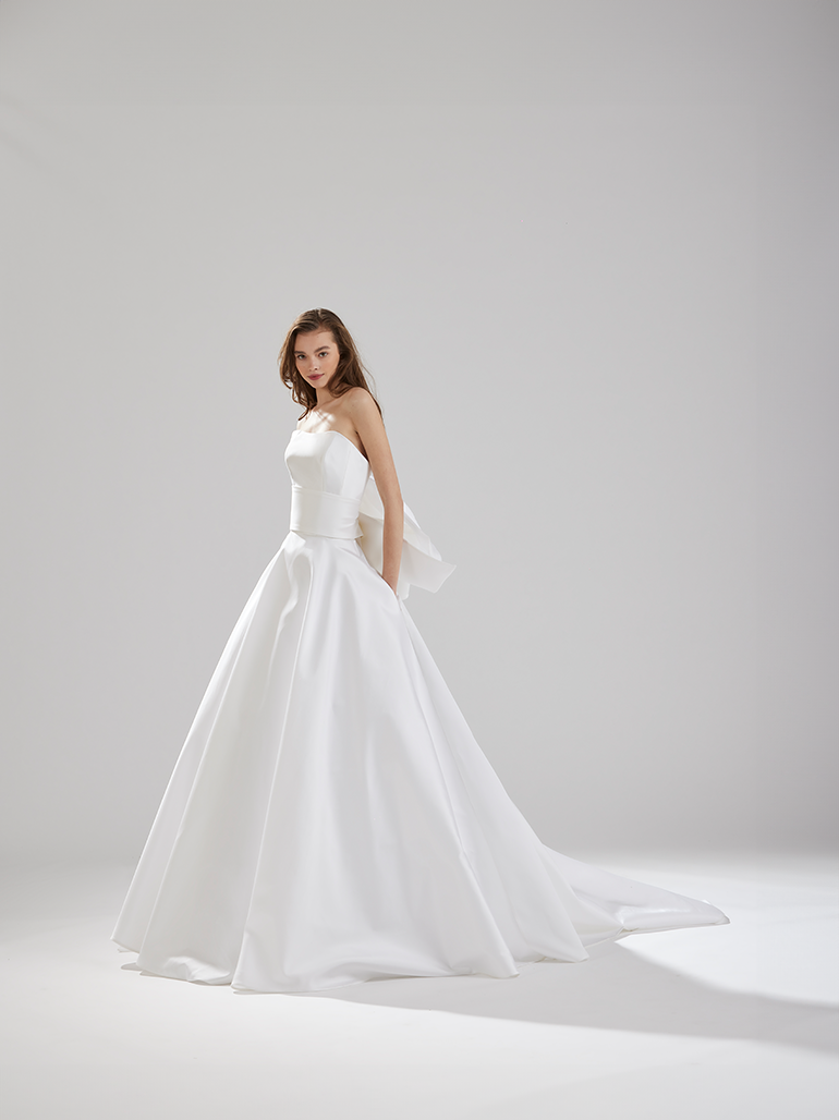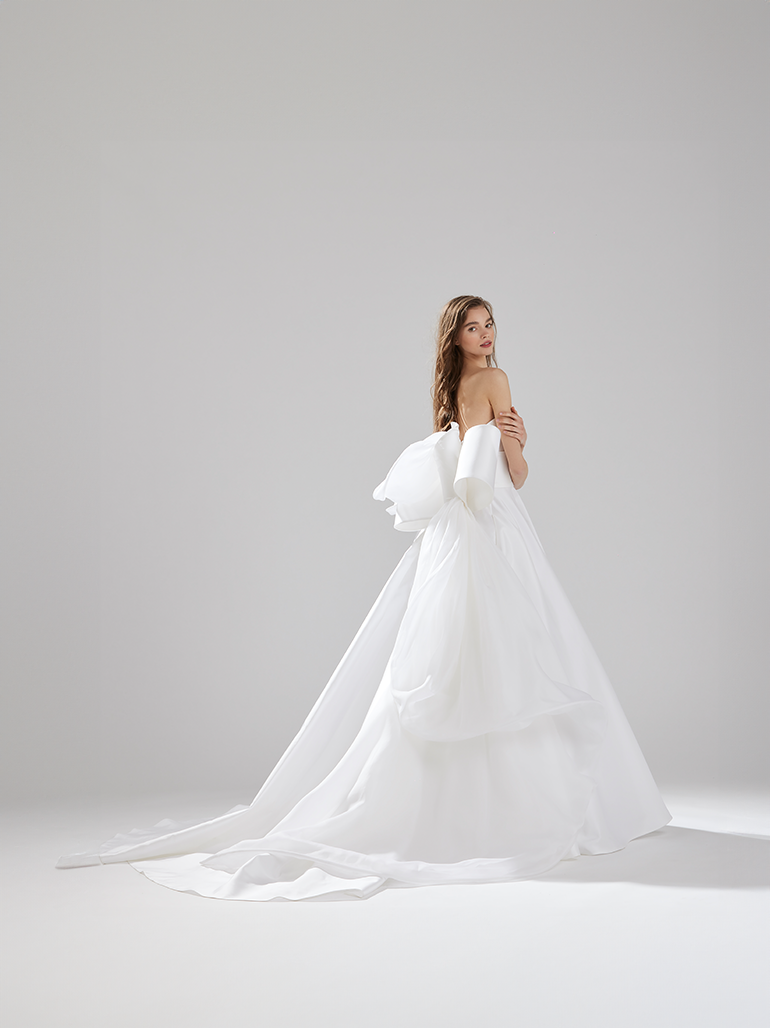 コンパクトなトップスと対照的に、しっかりと広がるスカートのシルエット。シンプルなフロントスタイルだからこそ映えるシルエットの美しさがあります。 着物の帯を連想させる様なモチーフにシルクサテンオーガンジーを組み合わせて柔らかさを演出しています。