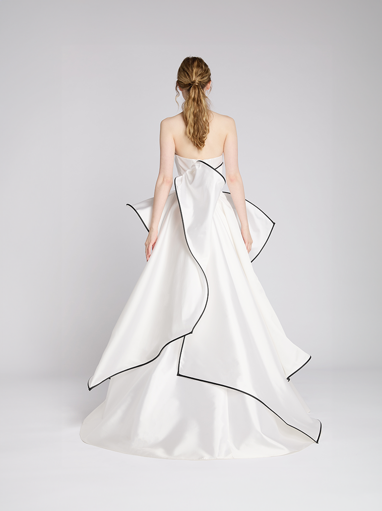 花びらをイメージした、美しい生地の流れが特徴的なスタイル。ブラックのパイピングを施すことで、より美しいラインを強調し、シンプルの中にもANTONIO RIVAのこだわり、アトリエのテクニックがつまった1着です。