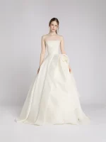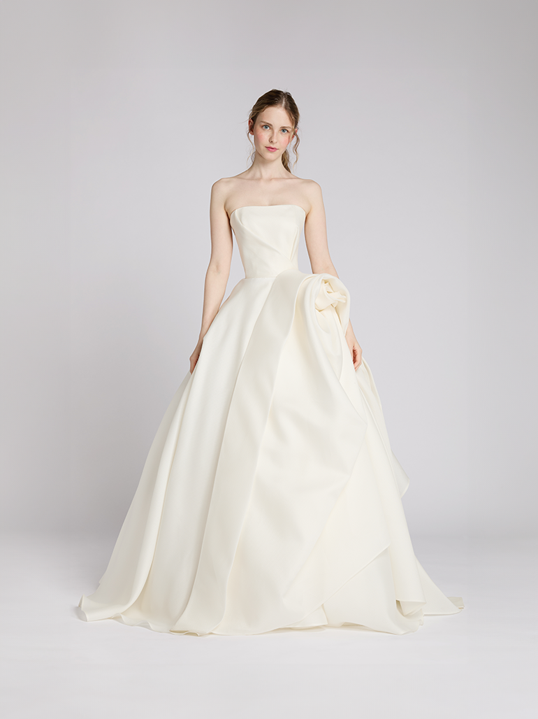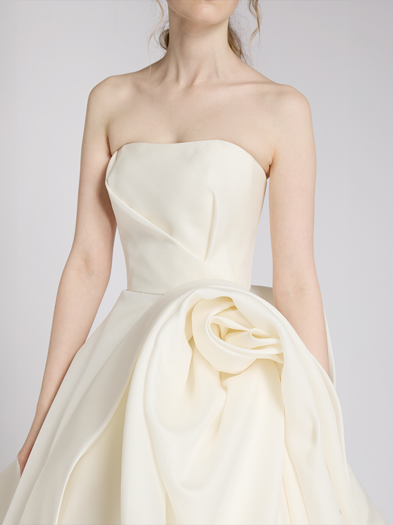 素材の柔らかさと、唯一無二のハリ感、動きを活かし作り上げた1着。どの方向で生地を使うと、どんな丸みが作り出せるのか、流れるような動きを演出できるのか。素材と向き合い、インスピレーションを得るANTONIO RIVAならではのデザインです。