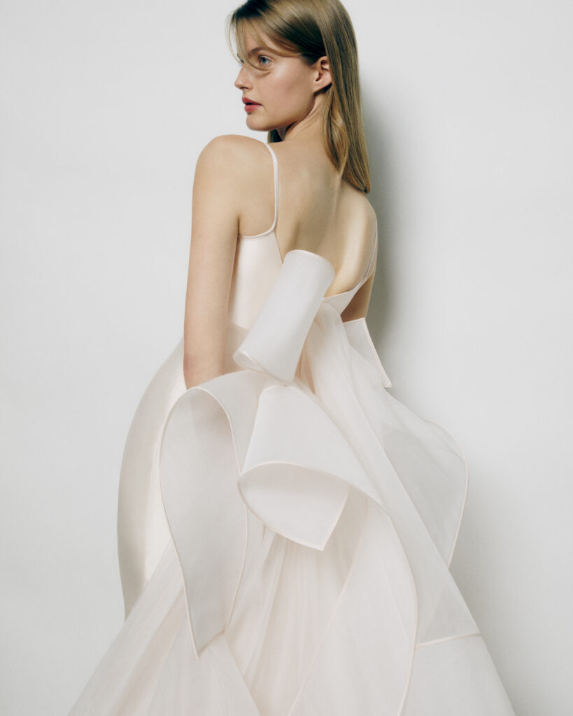 PRONOVIASのチーフアーティスティックオフィサー、Alessandra Rinaoudo(アレッサンドラ・リナウド)は、イタリアの彼女の母親の経営するウェディングドレスブティックの繊細かつ丈夫な生地、レース、テープメジャー、はさみに囲まれて育ち、ロマンチックなシルエットの中で育ちました。