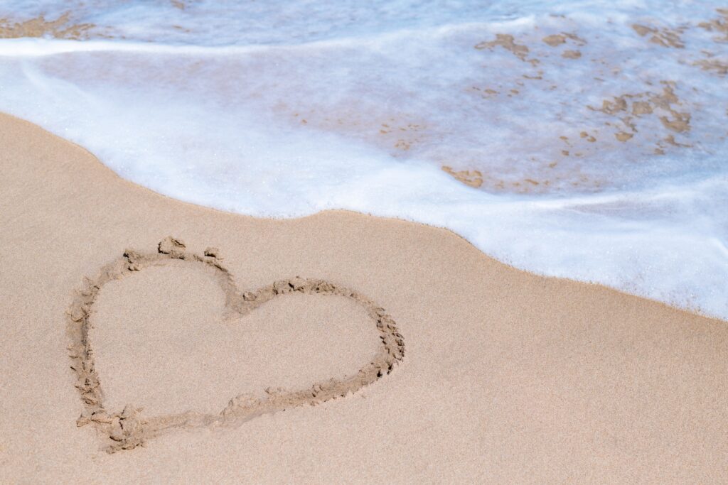・砂浜に大きなハートマークや「LOVE」の文字を描いて空撮