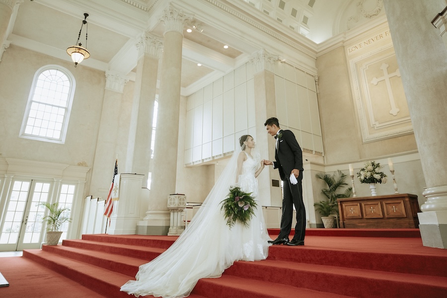 アーチ型の高い天井、左右の大きな柱、まっすぐ空に向かう尖塔が印象的な大聖堂には、パイプオルガンの音色が響き渡ります。祭壇に掲げられた大きな十字架まで、すべてがきれいなシャンパン色で統一され、花嫁の美しさをよりいっそう際立たせます。地元の花嫁からの人気も高く、ロイヤルウエディング風の格調高いセレモニーを実現します。