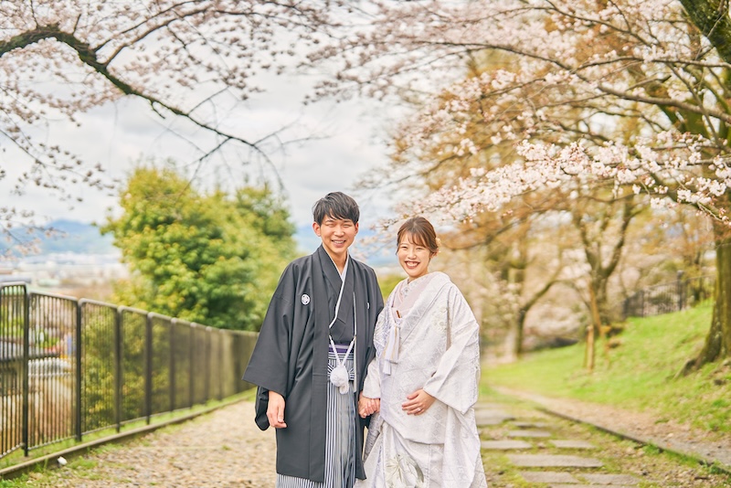 風格ある石垣の上で、ふたりが交わす特別な誓い。淡く揺れる桜の花びらが優しく包み込み、まるで時を超えた物語のような光景が広がります。和装が映えるこの場所は、京都の文化財にも指定されており、古き良き時代の趣を感じながら未来への一歩を刻むことができます。