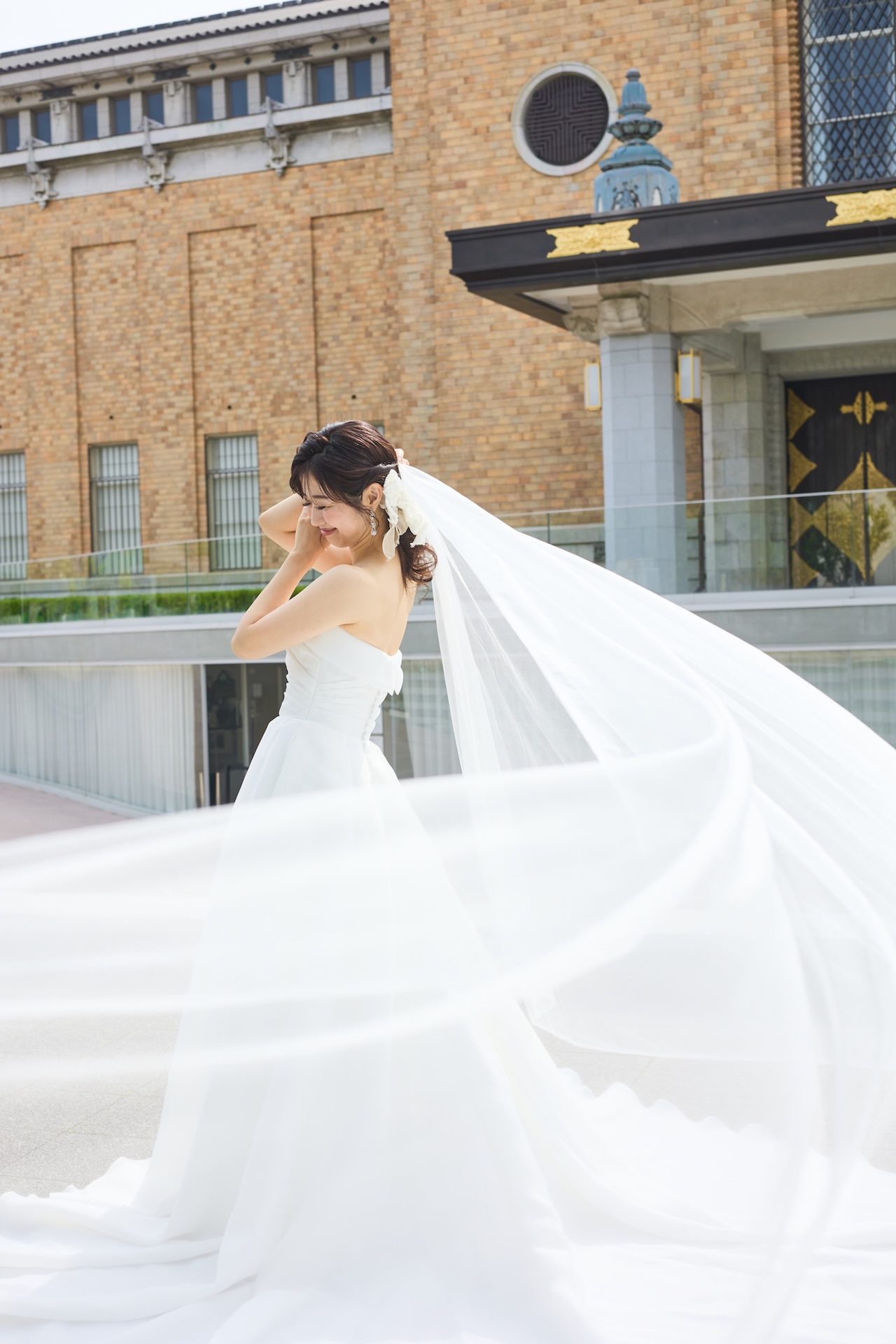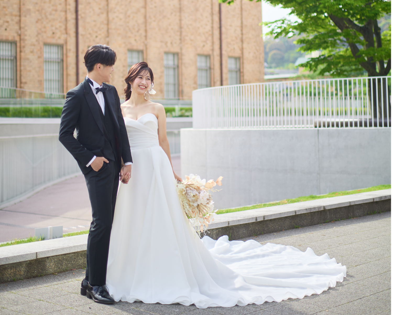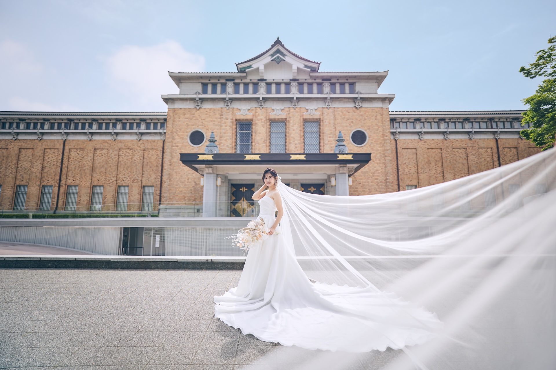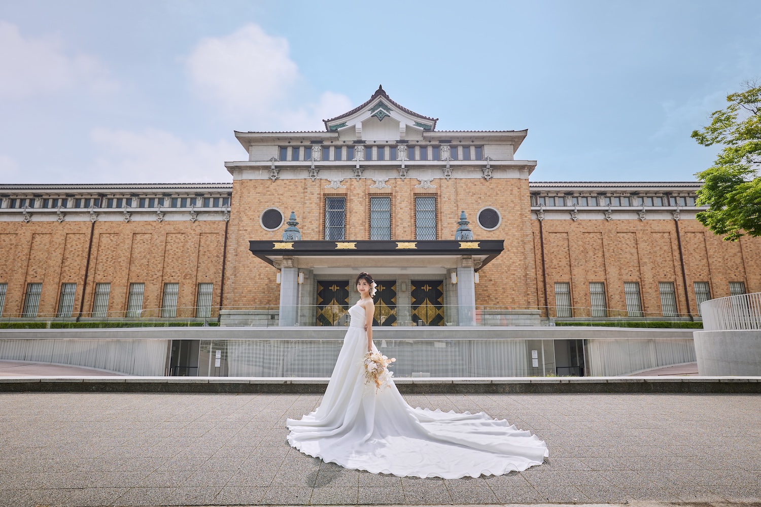 京都の豊かな歴史と美しい現代建築が自然に溶け合い、心地よい雰囲気の中でゆったりとロケーション撮影を楽しめる特別な場所です。美術館ならではの上品で落ち着いた空間で、洋装でも和装でも、お二人らしい素敵な表情を引き出してくれる京都らしいウエディングフォトスポットです。