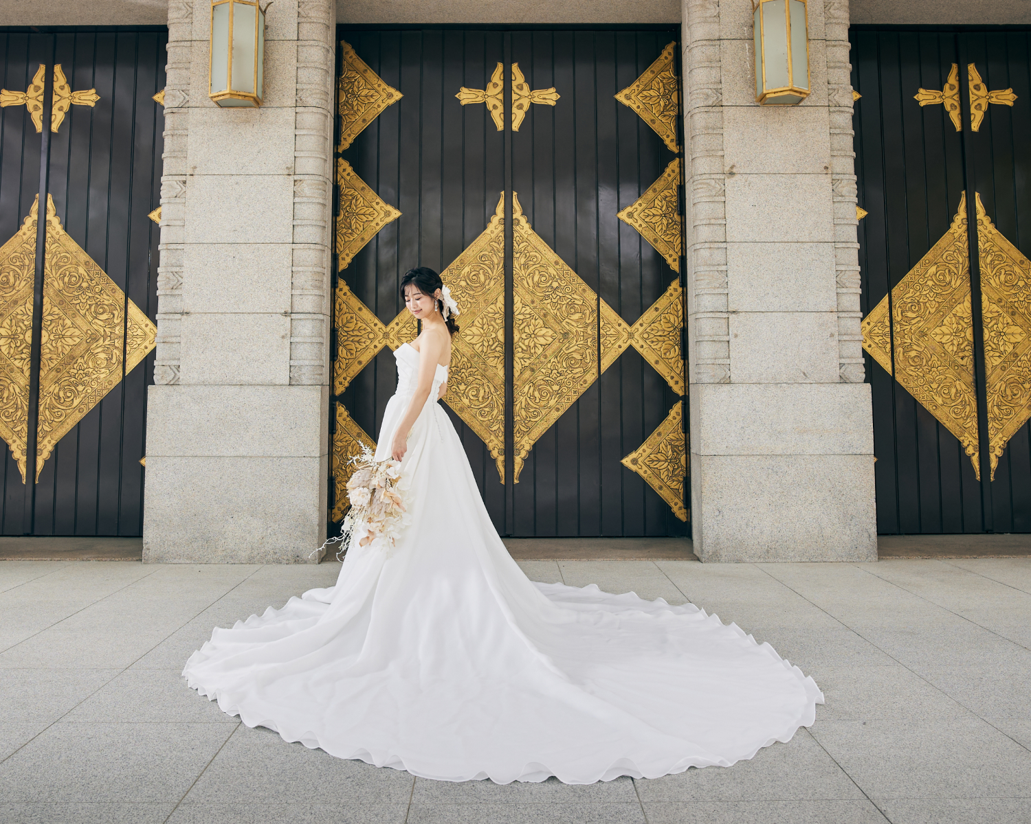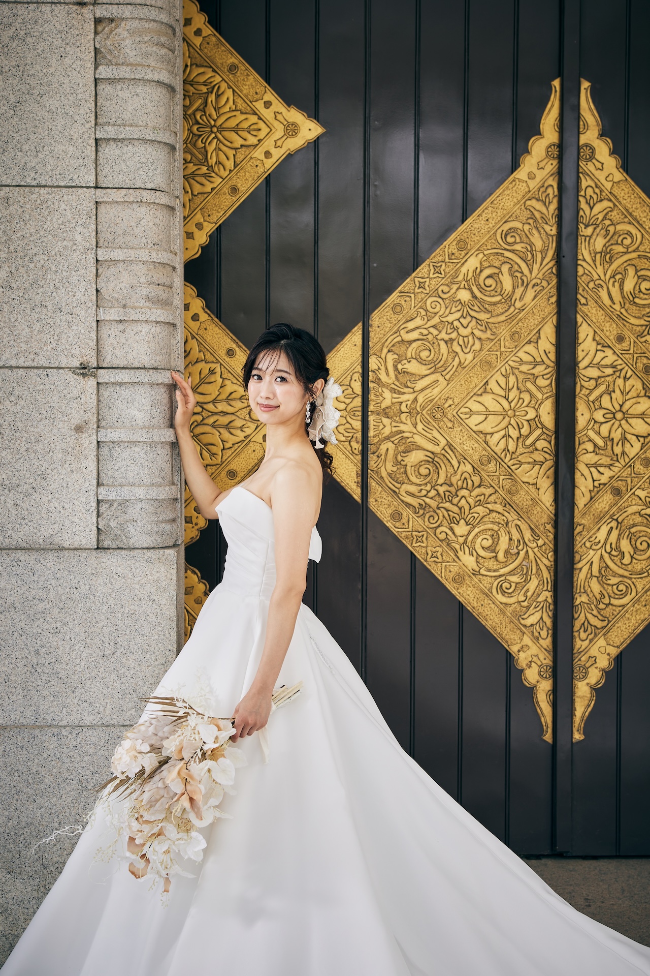 正面入り口の絢爛豪華な金の装飾扉は、特別な撮影にピッタリなおすすめのフォトスポット。細やかな細工が施された美しい扉の前で、ウエディングドレスでの撮影はもちろん、白無垢や色打掛での和装撮影もとても映えます。京都の歴史ある美術館の上品な雰囲気の中で、和の美しさと洋の美しさの両方を表現した、心に残る特別なブライダルフォト撮影が実現できます。
