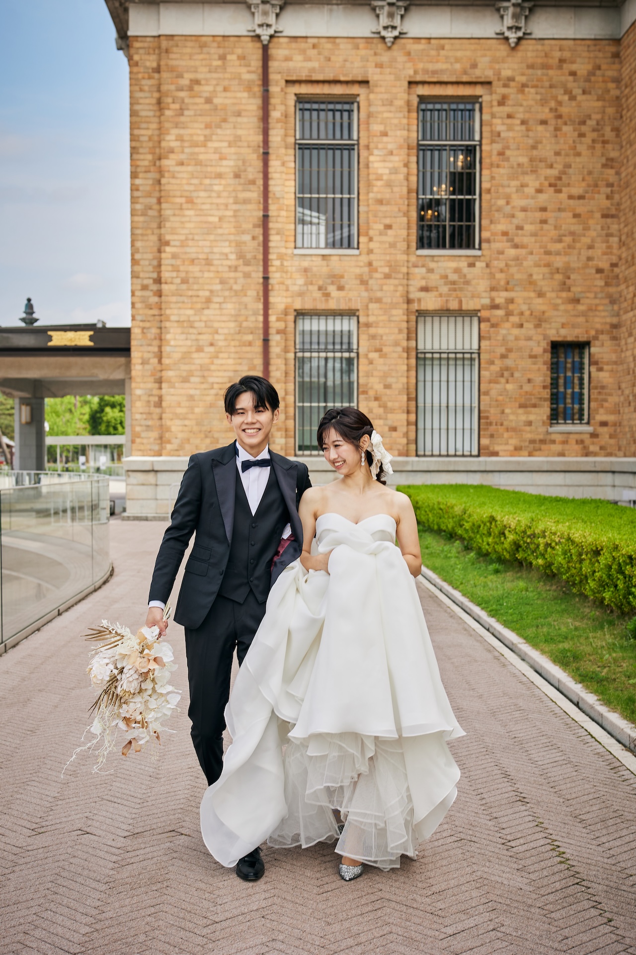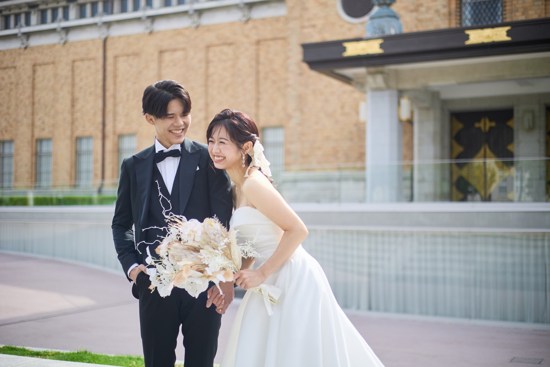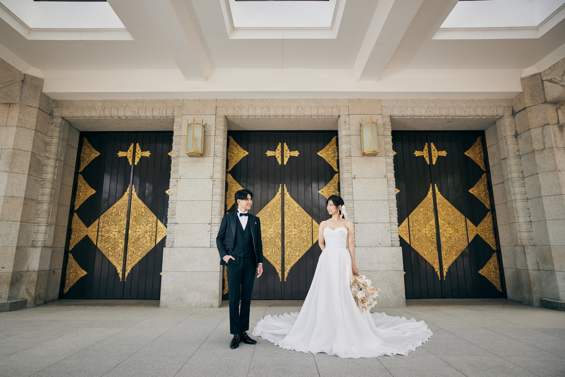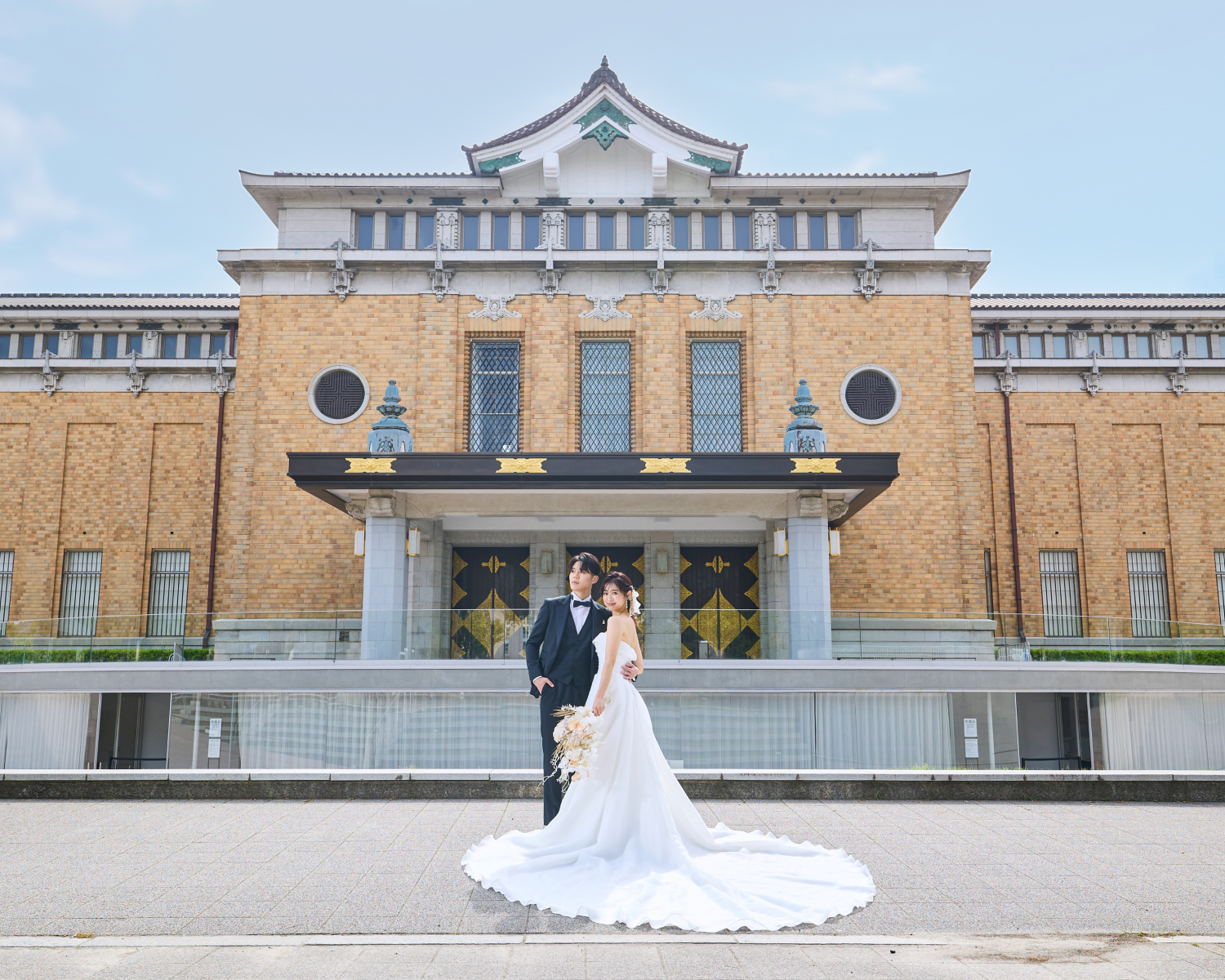 京都市左京区岡崎の芸術・文化・歴史エリアに位置する京セラ美術館は、1933年開館の国内最古の公立美術館建物で、国の登録有形文化財に登録されています。帝冠様式の荘厳な建築造形とアクセスの良さから、京都のウエディングフォト撮影で人気の高いロケーションです。スロープ状の広場「京セラスクエア」や歴史的な館内で、上品で洗練されたブライダルフォトを残すことができます。