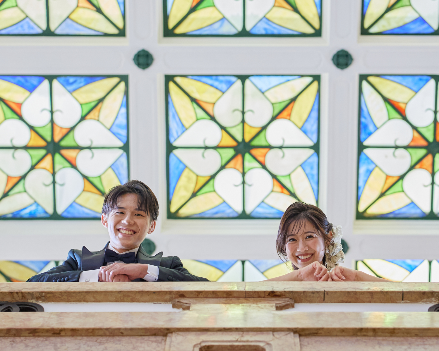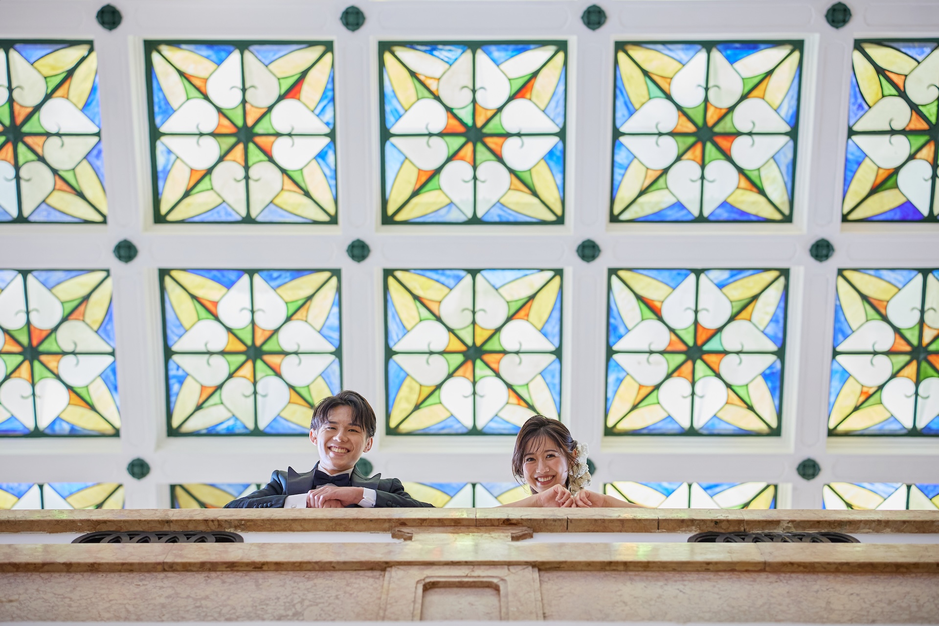 西広間の天井を彩る美しいステンドグラスは、日本の伝統的な格子天井に洋風のガラス装飾を組み合わせた、京セラ美術館ならではの特別な空間です。色とりどりの光が室内に差し込み、この美しいステンドグラスの下で撮影するウエディングフォトは、和と洋の文化が調和した京都らしい優雅さを表現でき、お二人の大切な記念写真として永遠に輝き続けます。