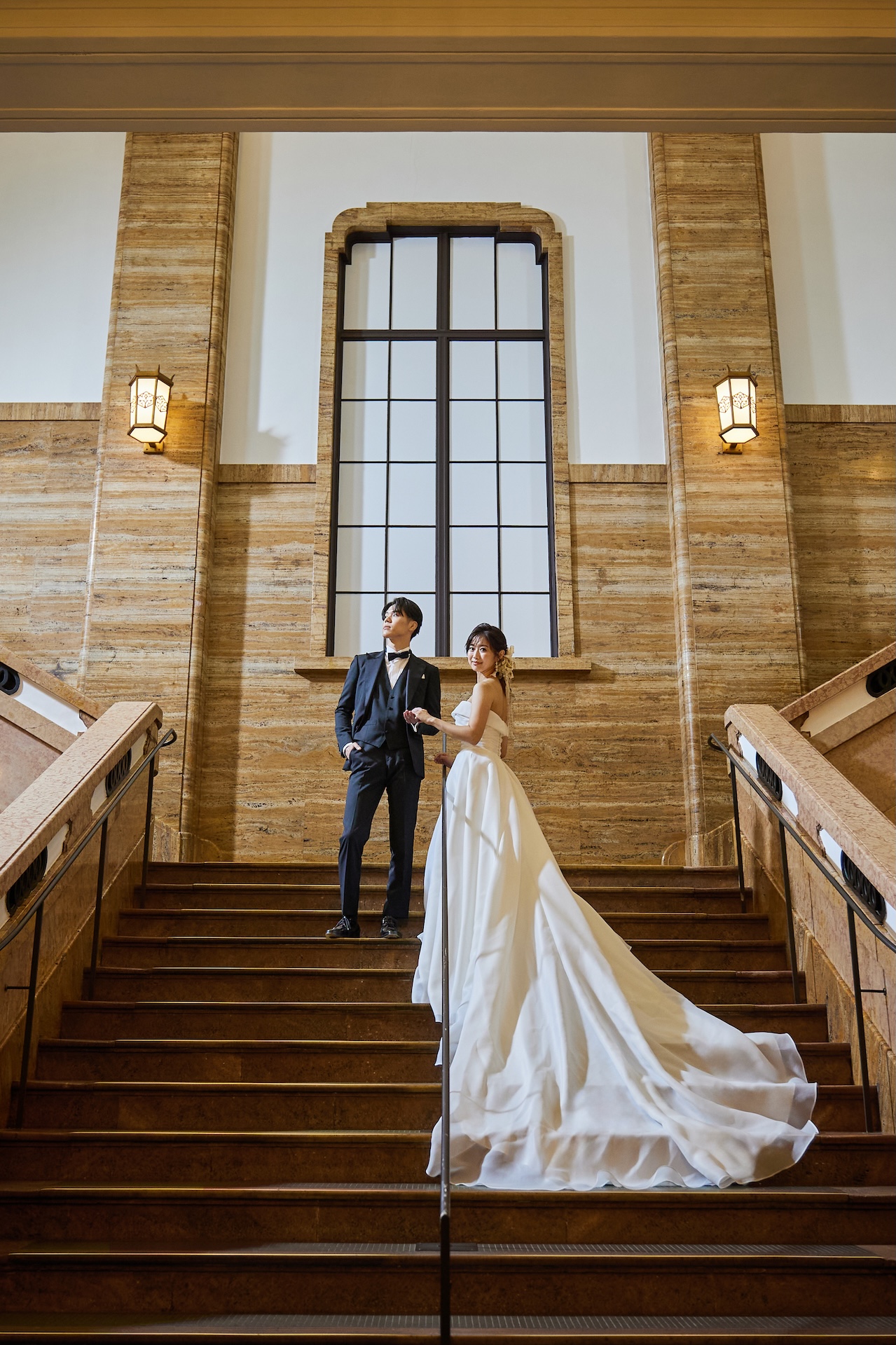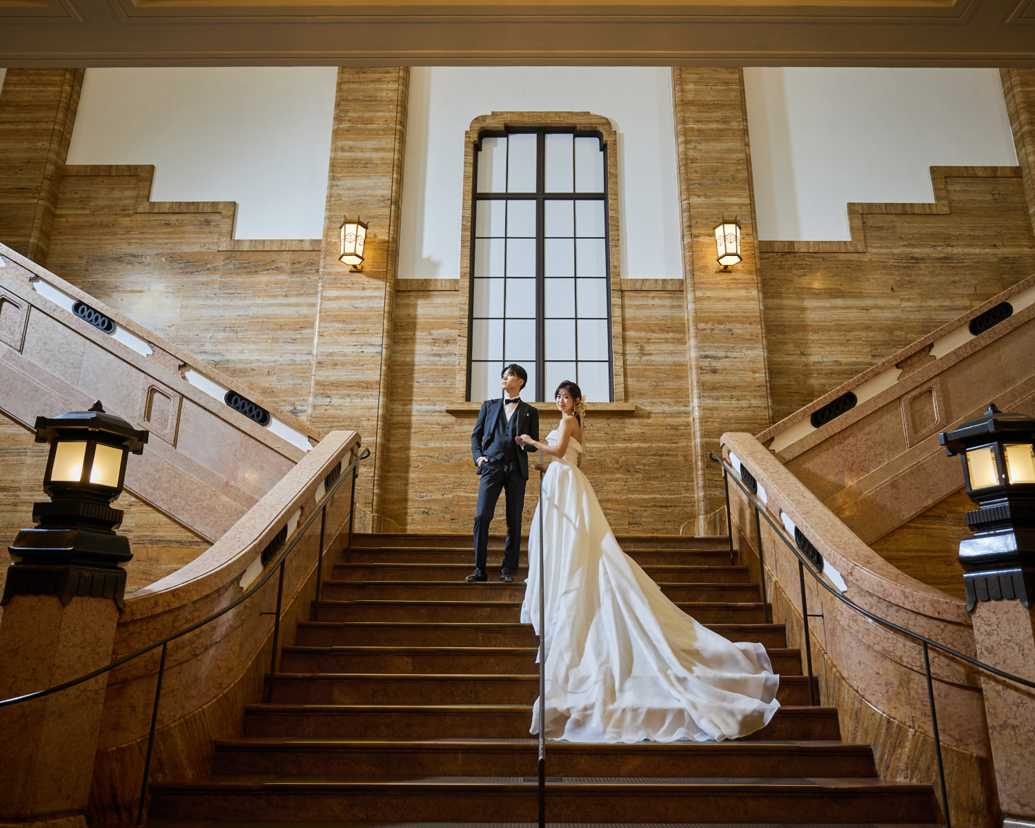 まるで宮殿で撮影したかのように、優雅な写真が撮れる旧正面玄関の階段。ドレスの美しいシルエットを活かした立ち姿や、新郎新婦の感動的なシーンまで、さまざまなアングルから魅力的な写真を撮ることができます。映画の主人公のような特別なウエディングフォト撮影を楽しめ、京セラ美術館ならではの格調高い雰囲気が、より一層フォトジェニックな写真に引き立ててくれます。