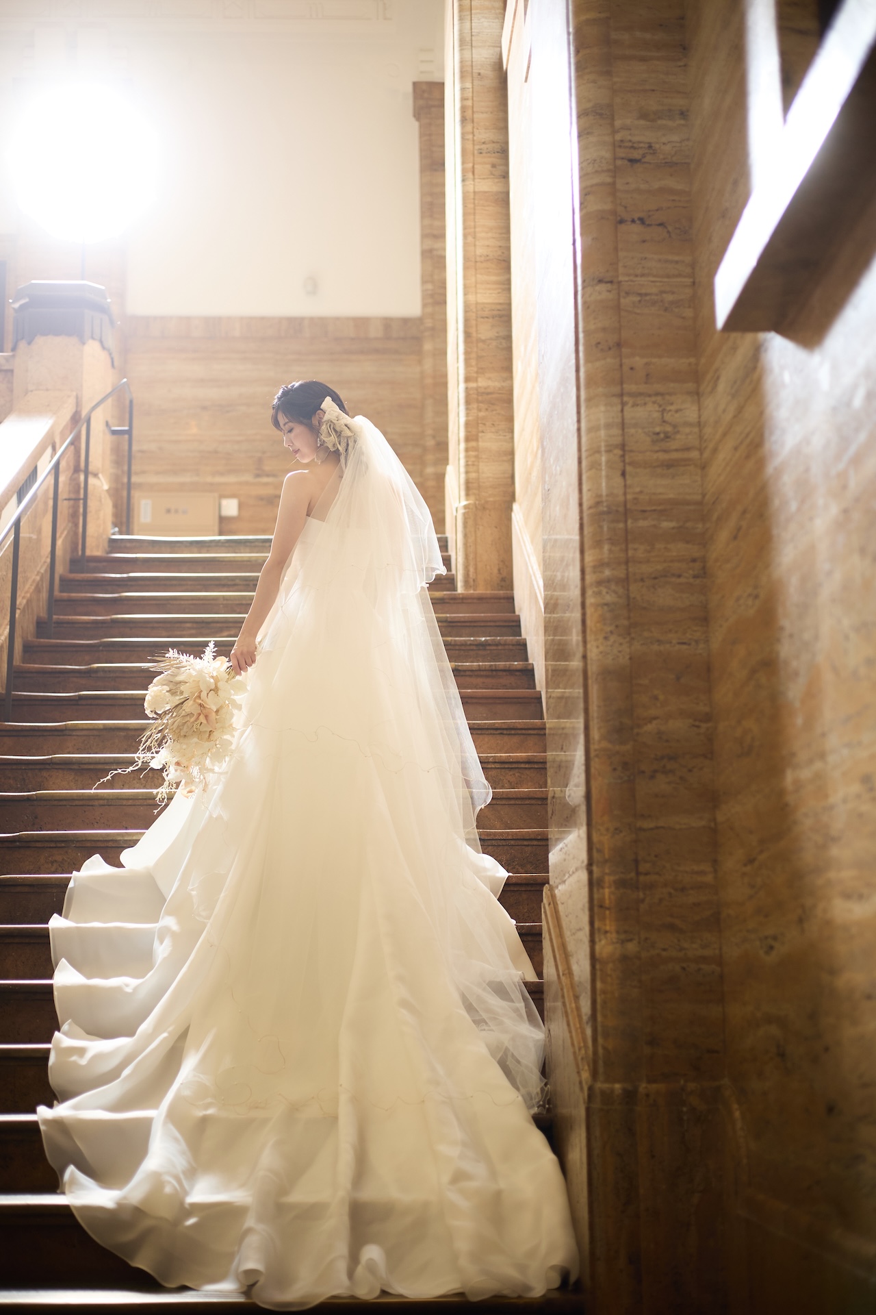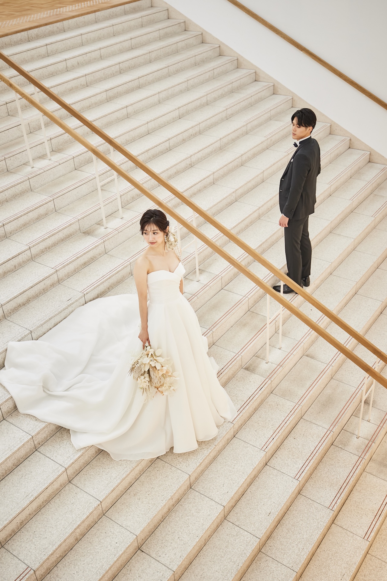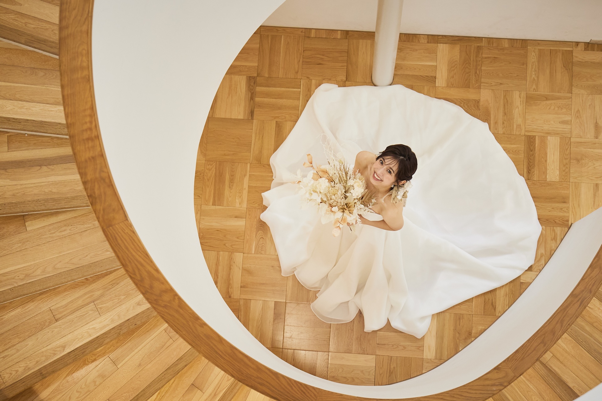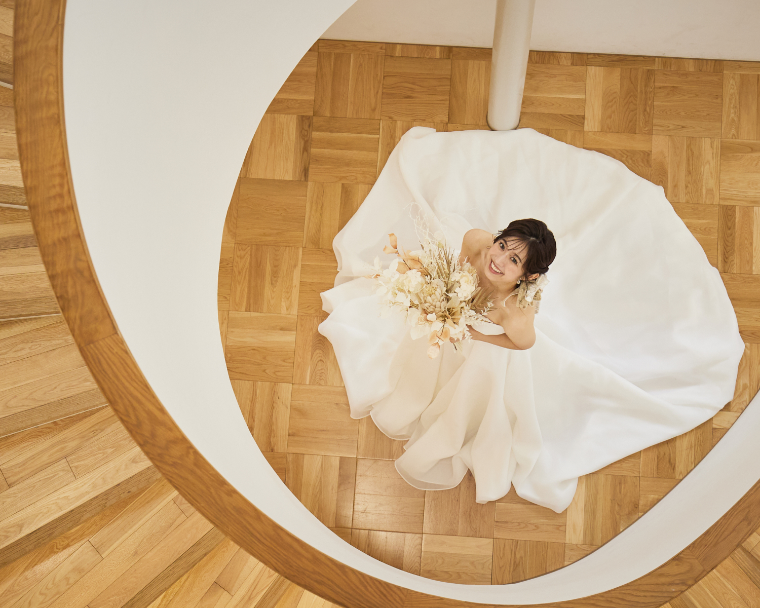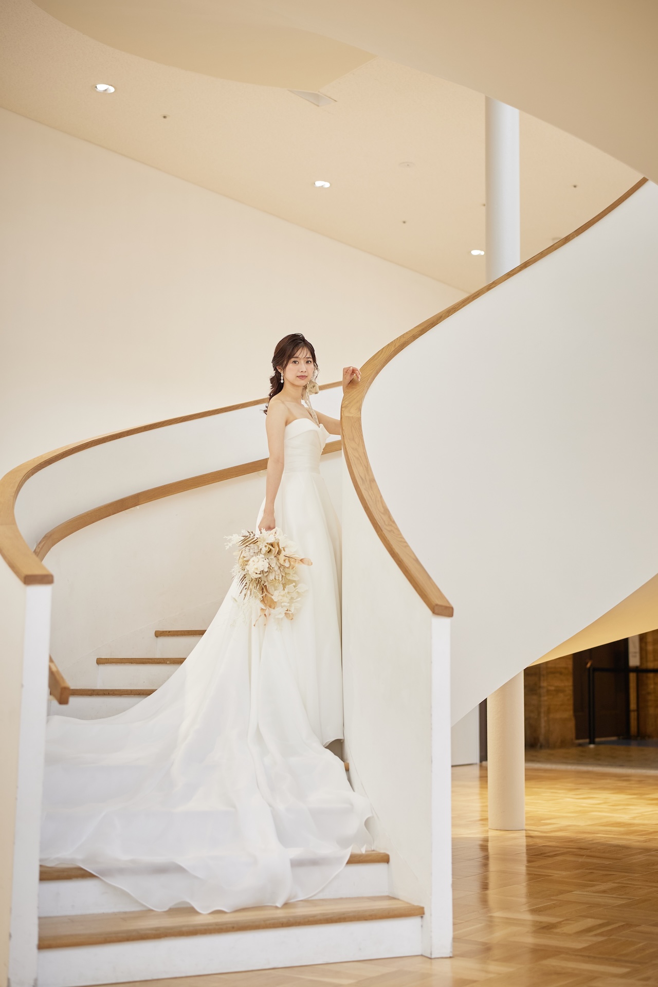曲線美と木の温もりが調和した、中央ホールの美しいらせん階段。上から見下ろすアングルでは、ドレスが花のように美しく広がり、まるでアート作品のような一枚に仕上がります。優雅な曲線を描く階段の洗練されたデザインが、モダンで上品なウエディングフォトを演出します。他にはない特別な構図で、印象的な写真を残すことができます。