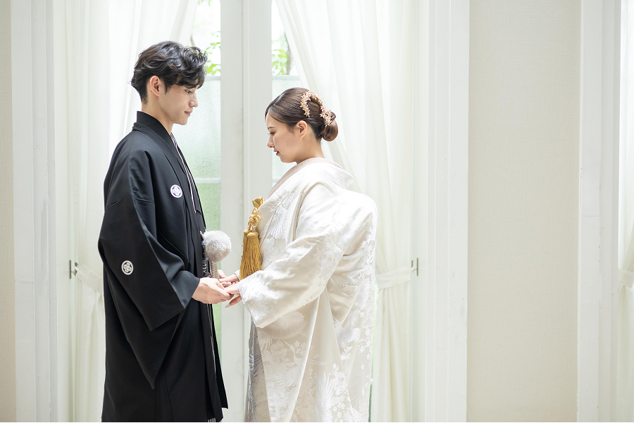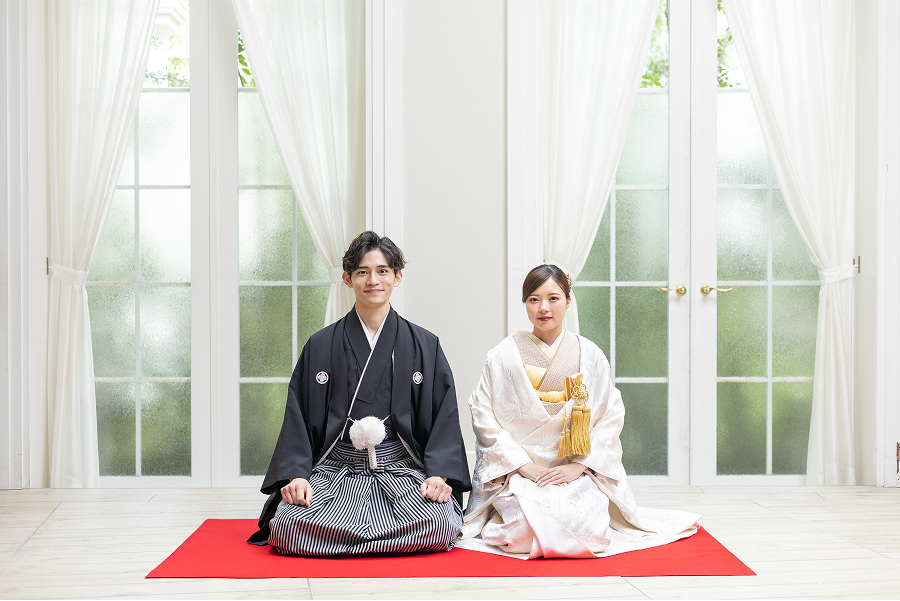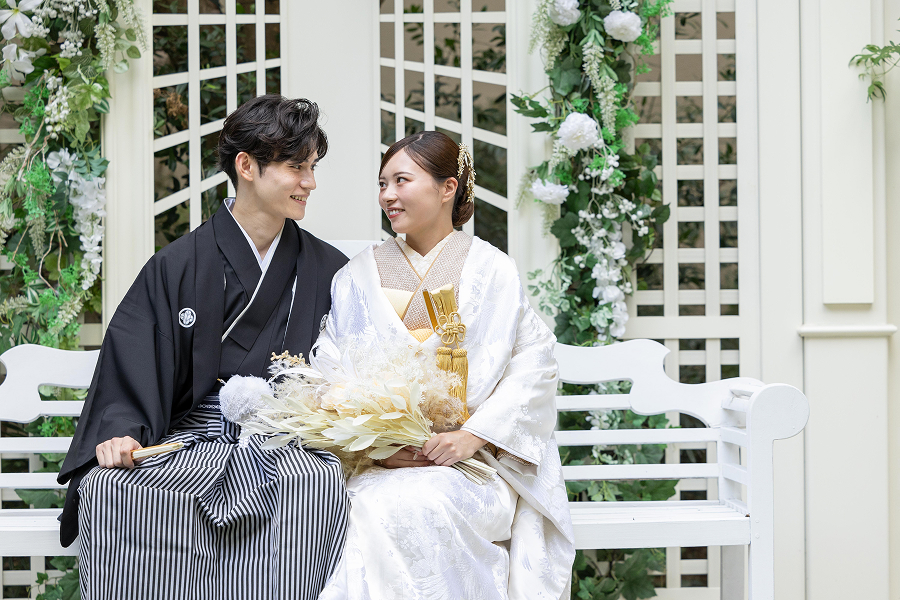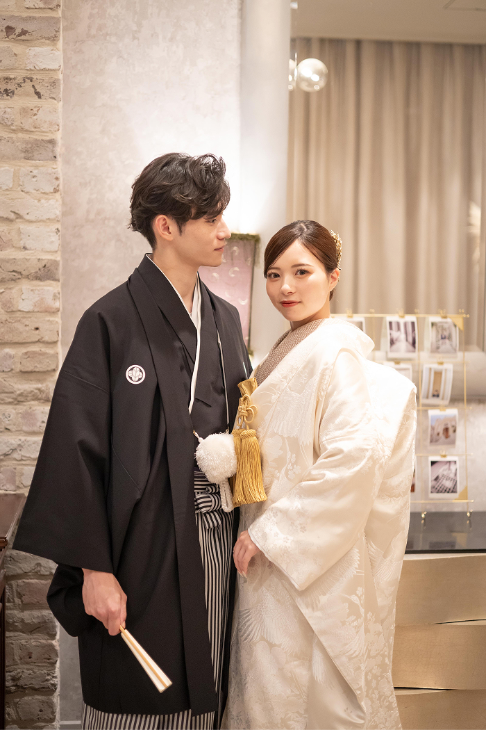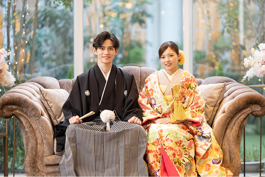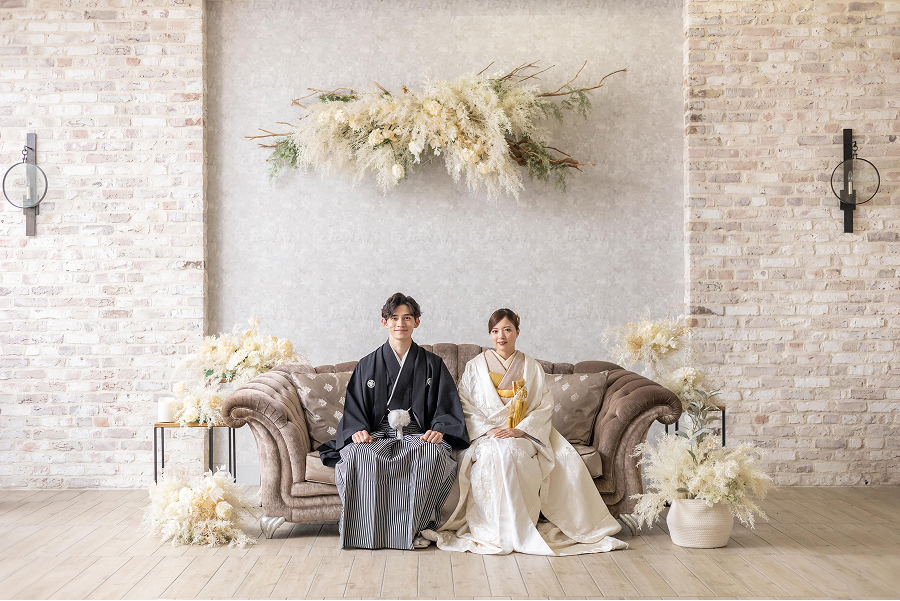 洗練されたソファに腰かけ、和装姿でリラックスした自然体の表情を。広々としたスタジオ内には撮影スポットが満載。館内を巡りながらありのままのおふたりらしさが感じられる写真を残せます。