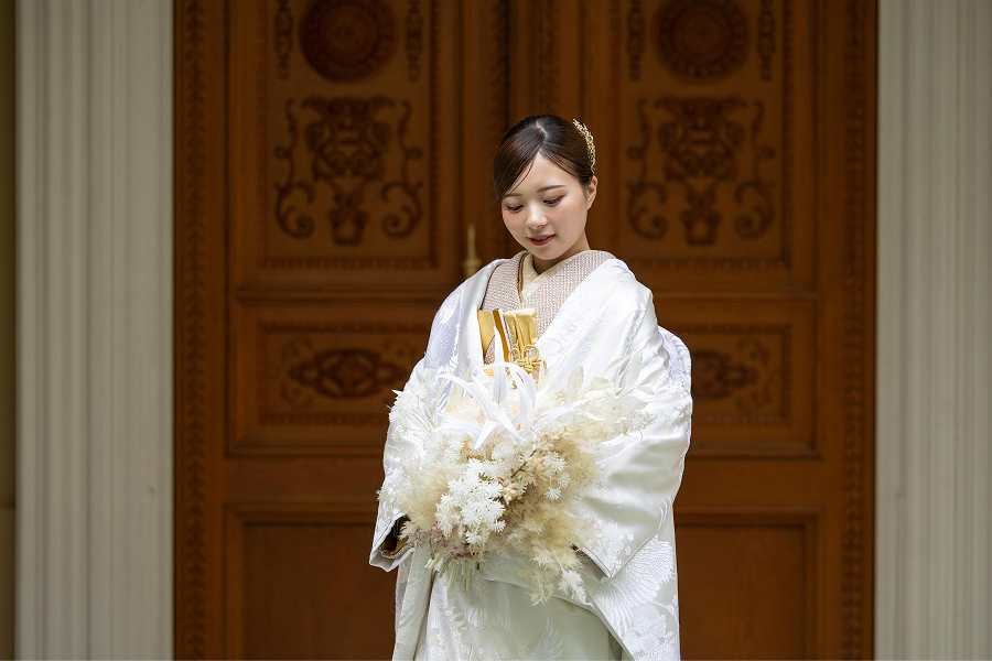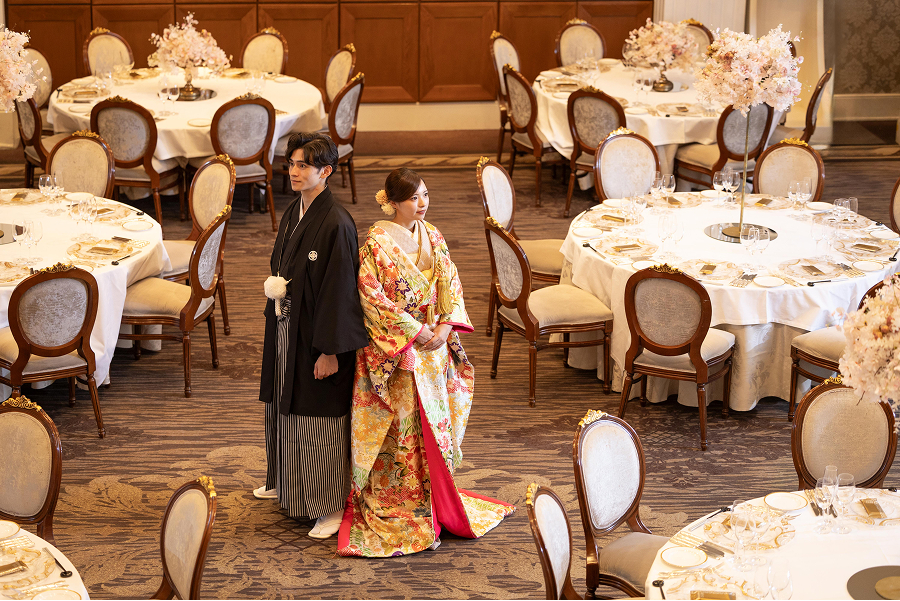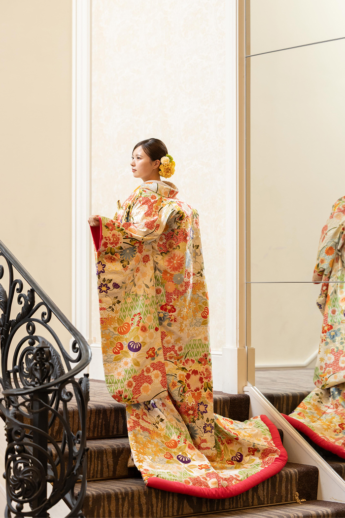 曲線が美しい階段は色打掛の華やかさとスケール感を最大限に引き出します。立体的な構図で写真に迫力を与え、記憶に残るドラマチックな一枚を演出します。