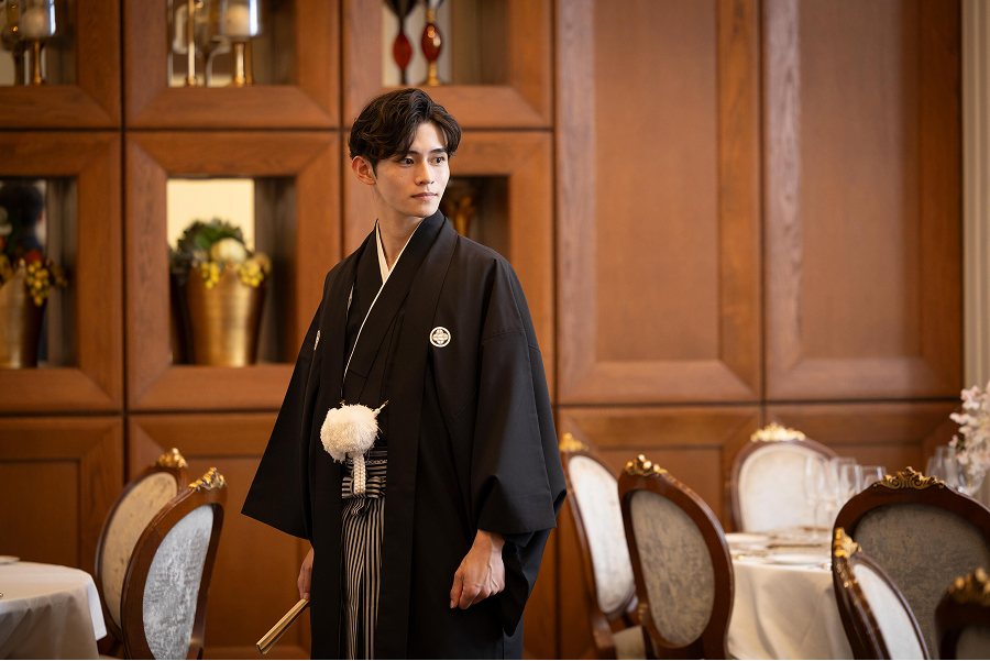洗練された現代的な空間に和装が優しく馴染む、フォトジェニックなワンシーン。伝統とモダンが引き立て合う上質な時間を演出します。