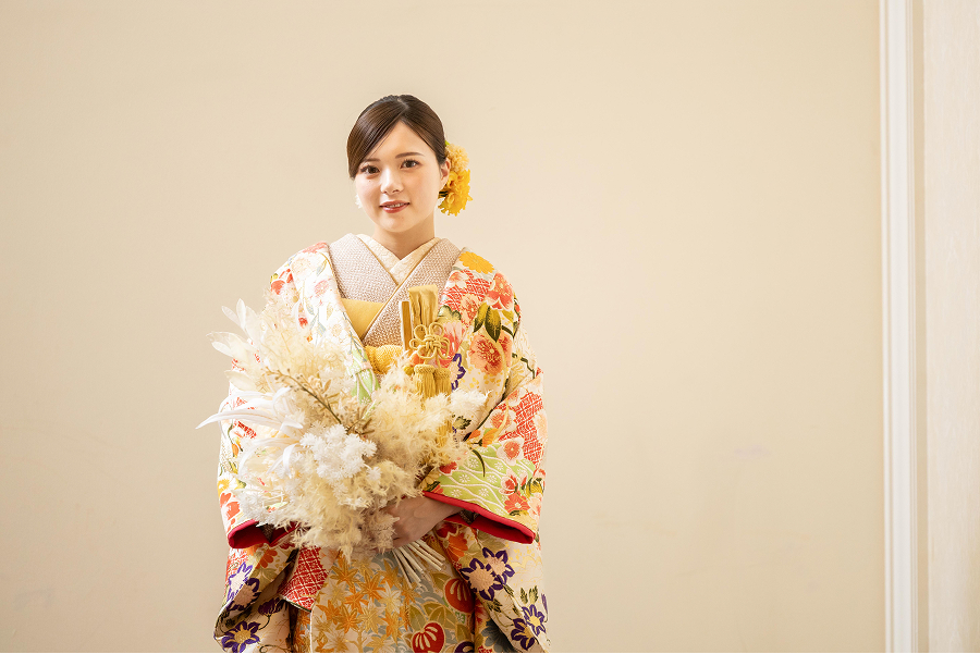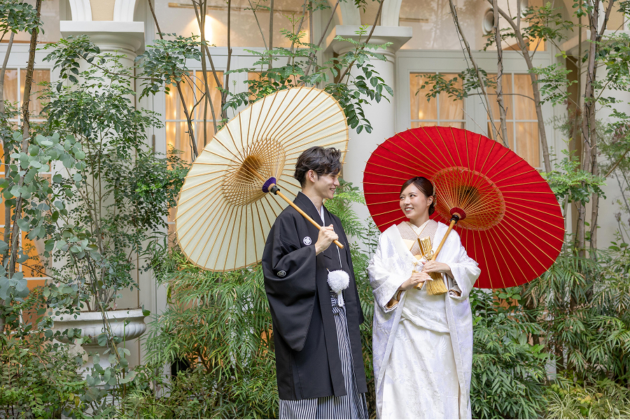 鮮やかな美しい濃緑が和装の華やかさをより一層引き立てます。和傘などの小物を使用して、特別感あふれるフォトシーンを演出します。