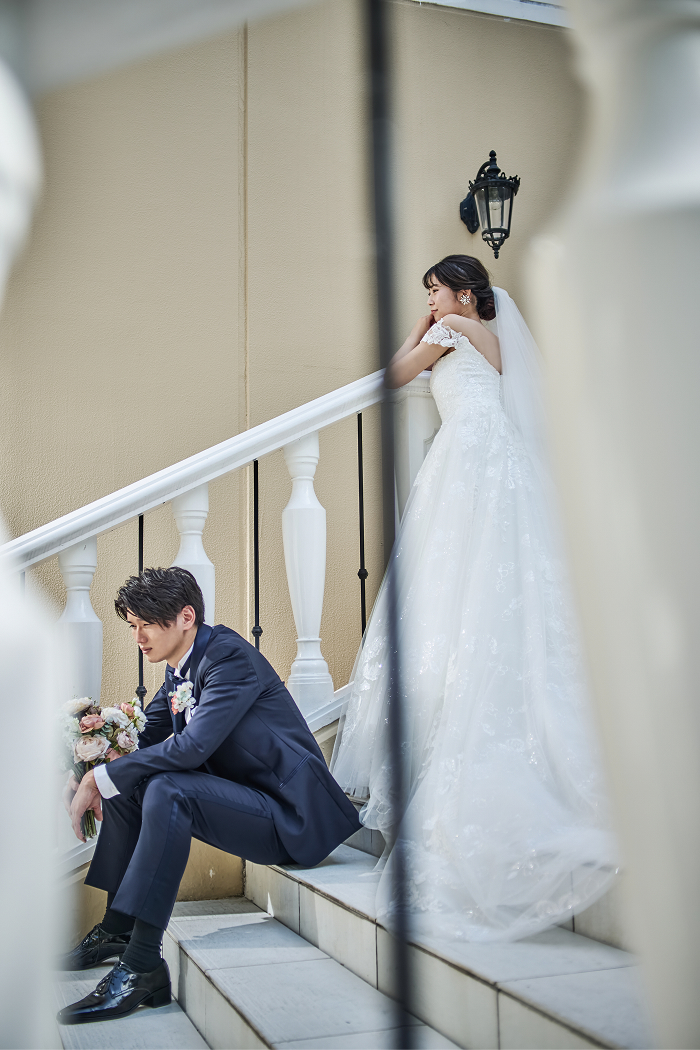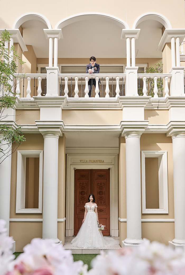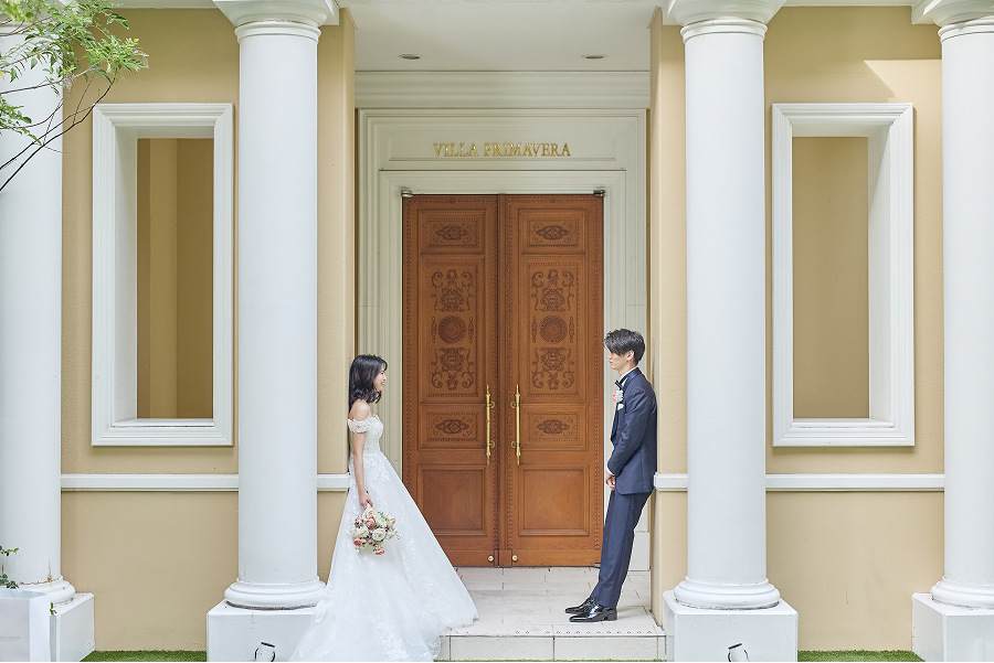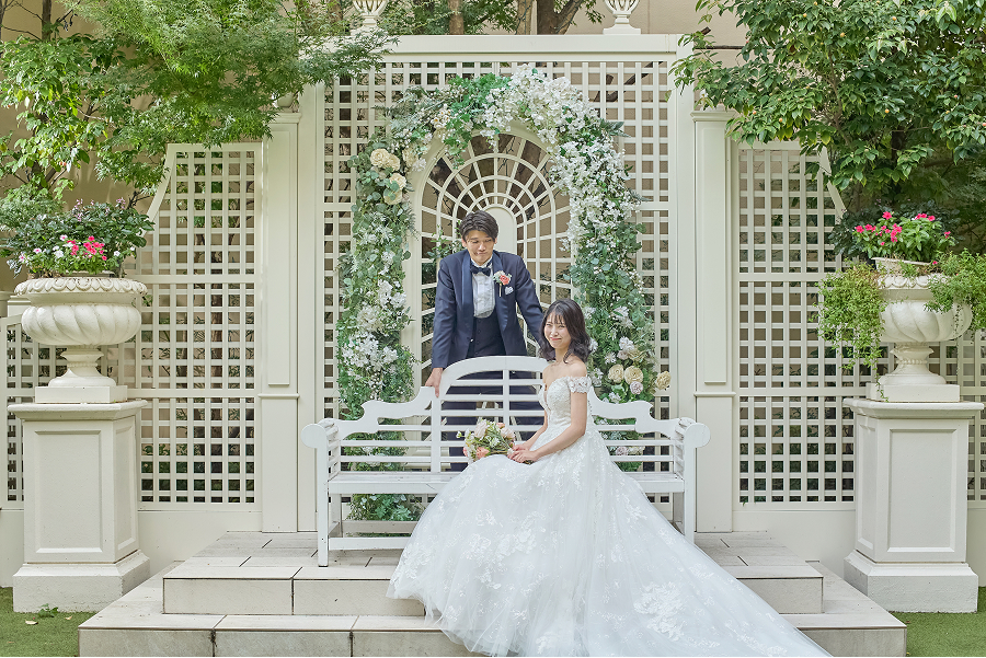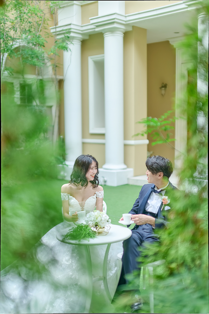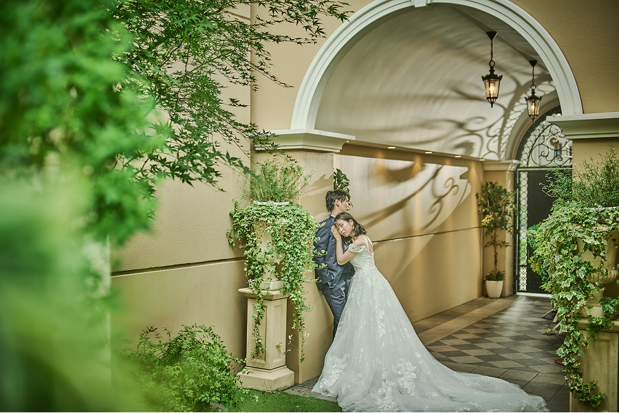 豊かな緑が広がる邸宅ガーデンでは、おふたりの自然体の表情が引き出されます。館内だけでなく屋外でも楽しめる、開放感あふれる撮影が魅力です。