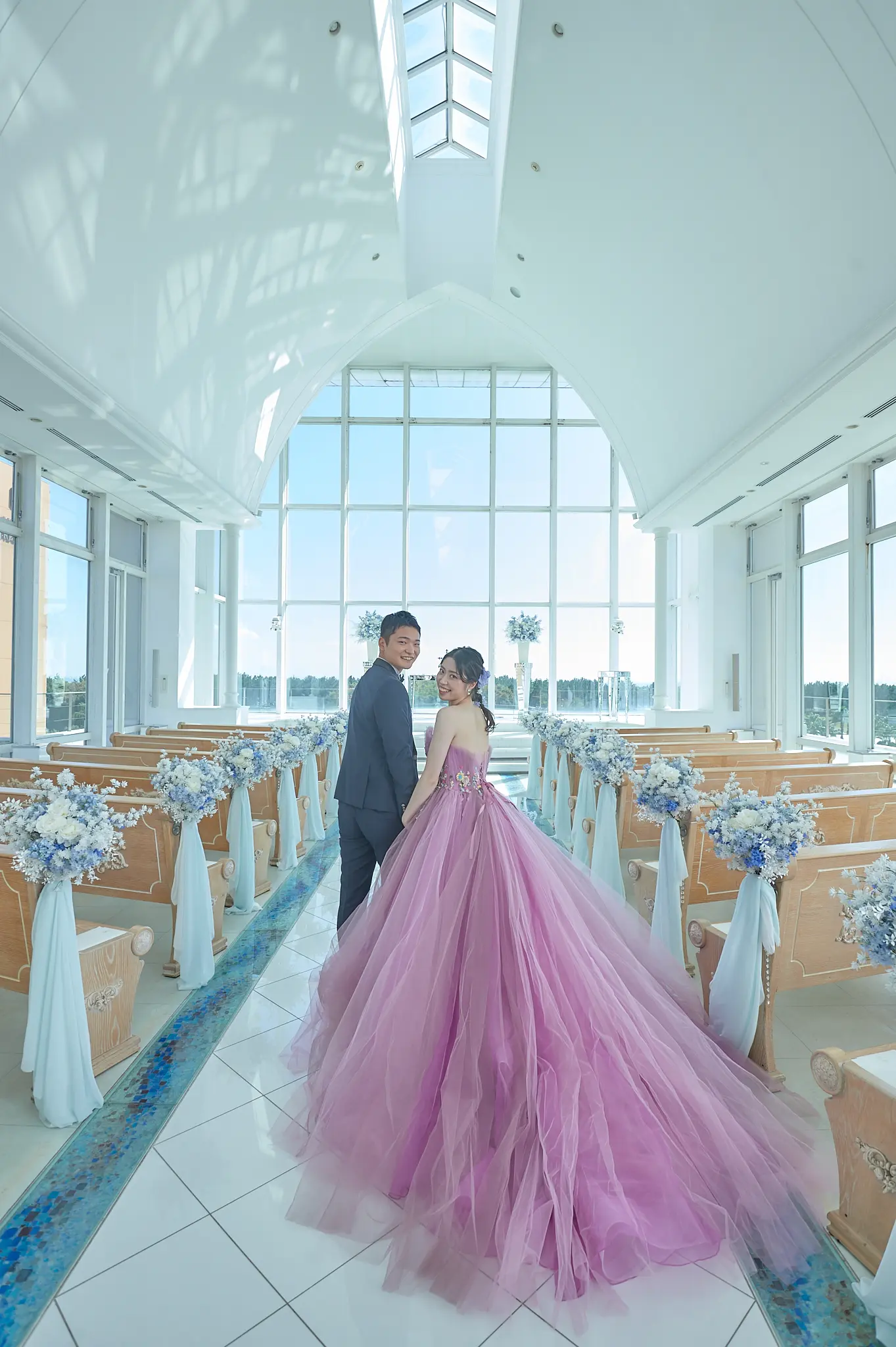 正面、左右はガラス張りで天井高12mものチャペルは、とても開放的でまるで天空に浮かぶかのよう。リゾートのように海と空に抱かれたチャペルは、自然光がたっぷりと降り注ぐ。