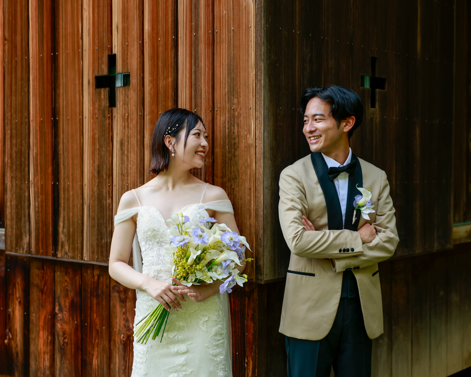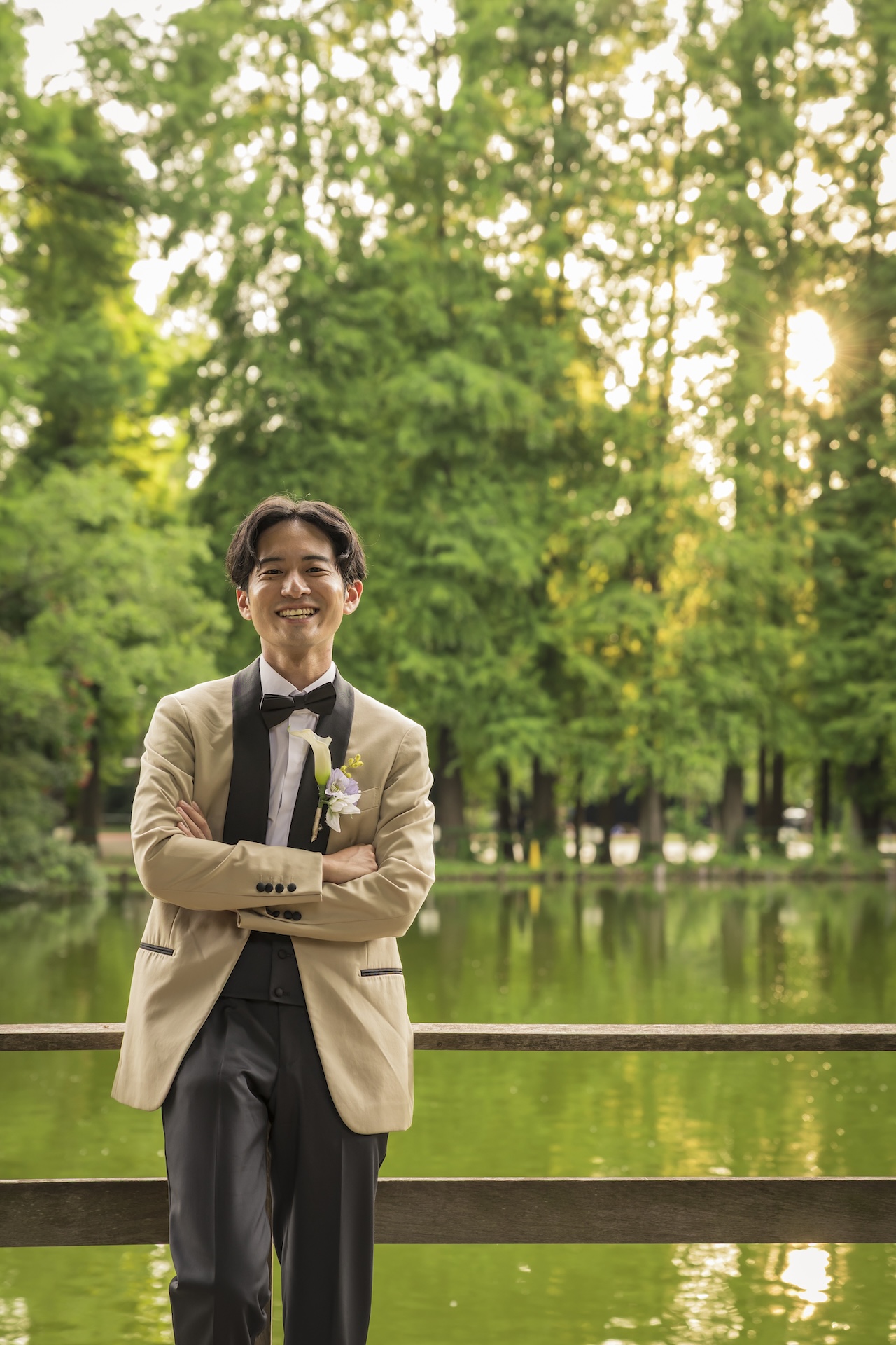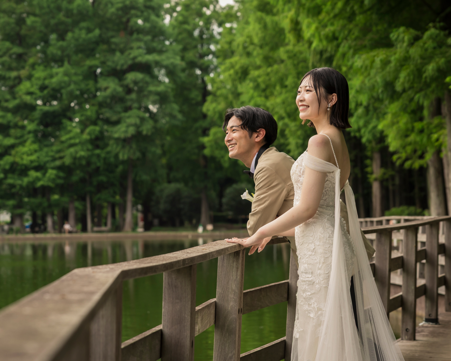 鏡のように静かな別所沼の畔に佇む木製の橋は、ロマンチックなフォトウェディングに最適なスポットです。季節を彩る花々が水辺を彩り、純白のドレス姿を一層引き立てます。自然の柔らかな光に包まれながら、心が通い合うような自然体の瞬間を、格別な思い出として永遠に切り取ります。