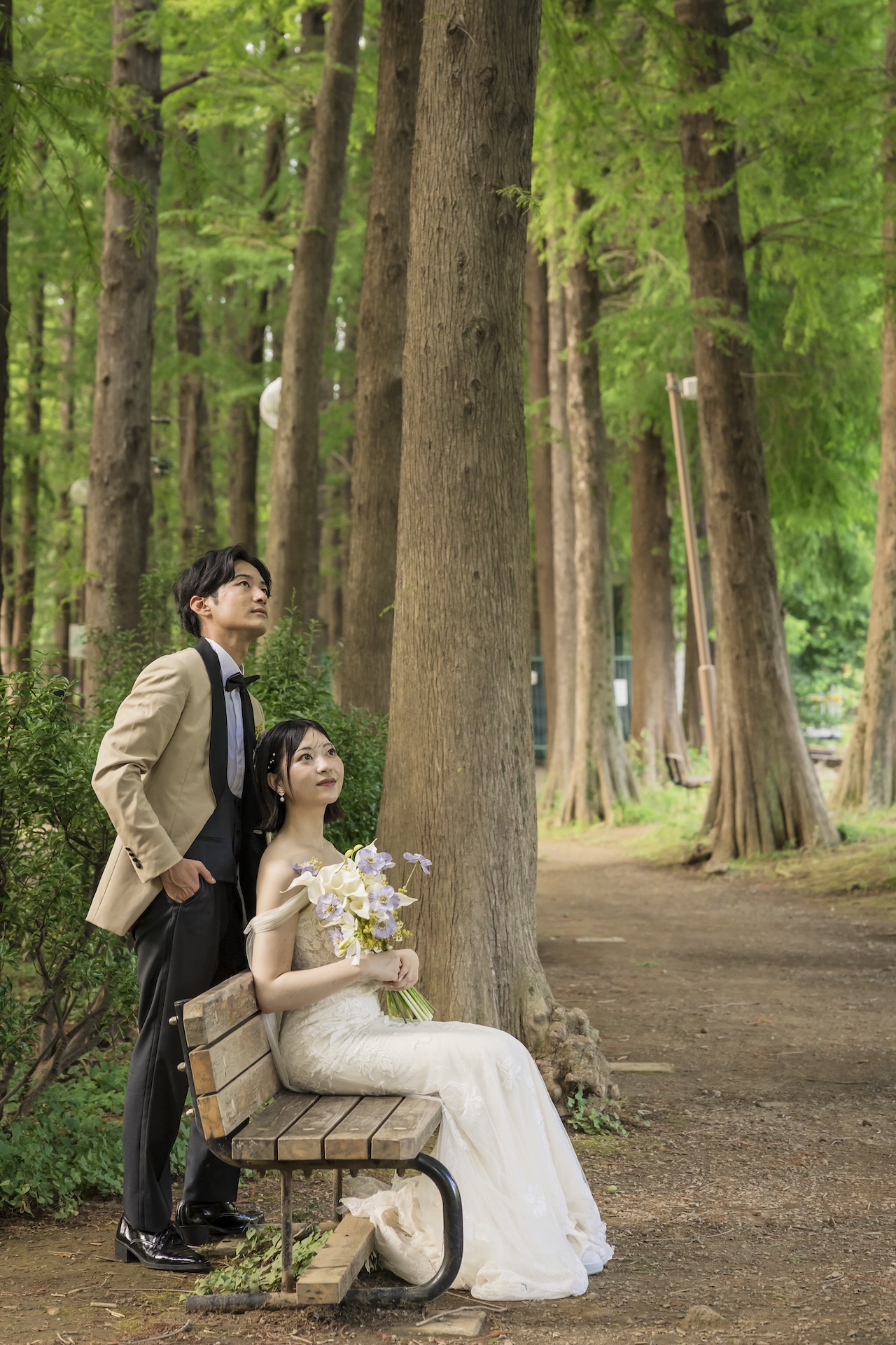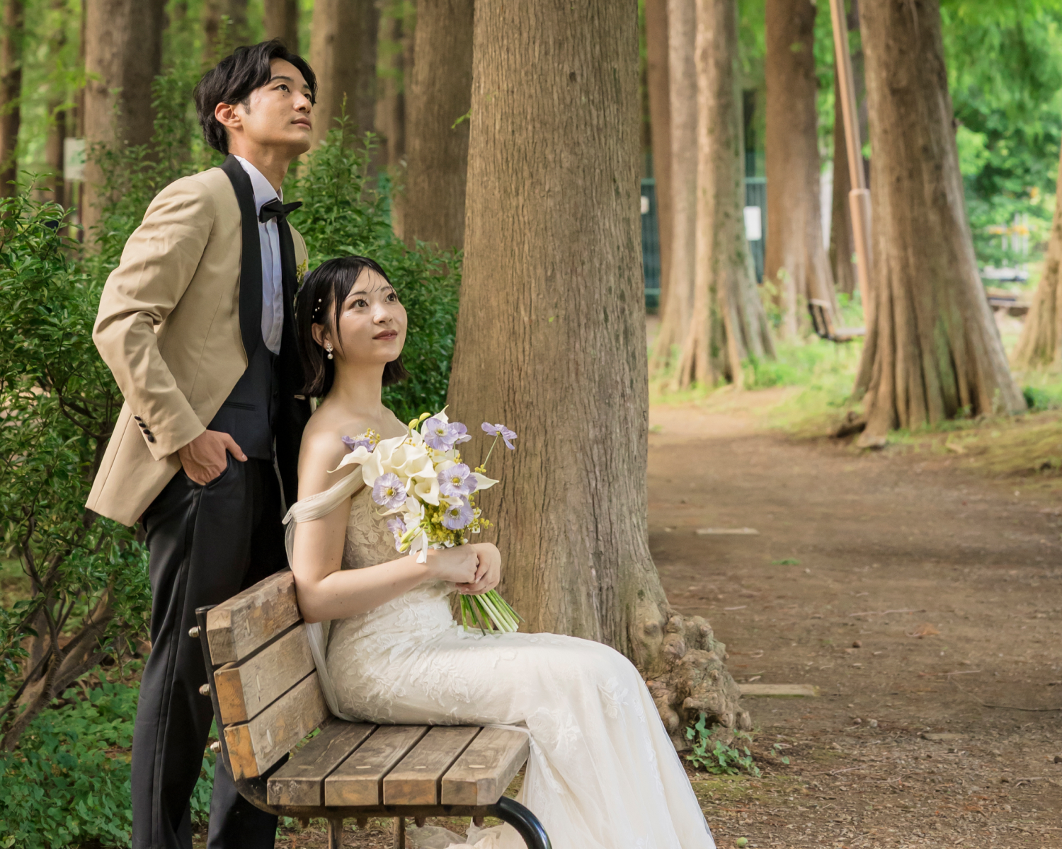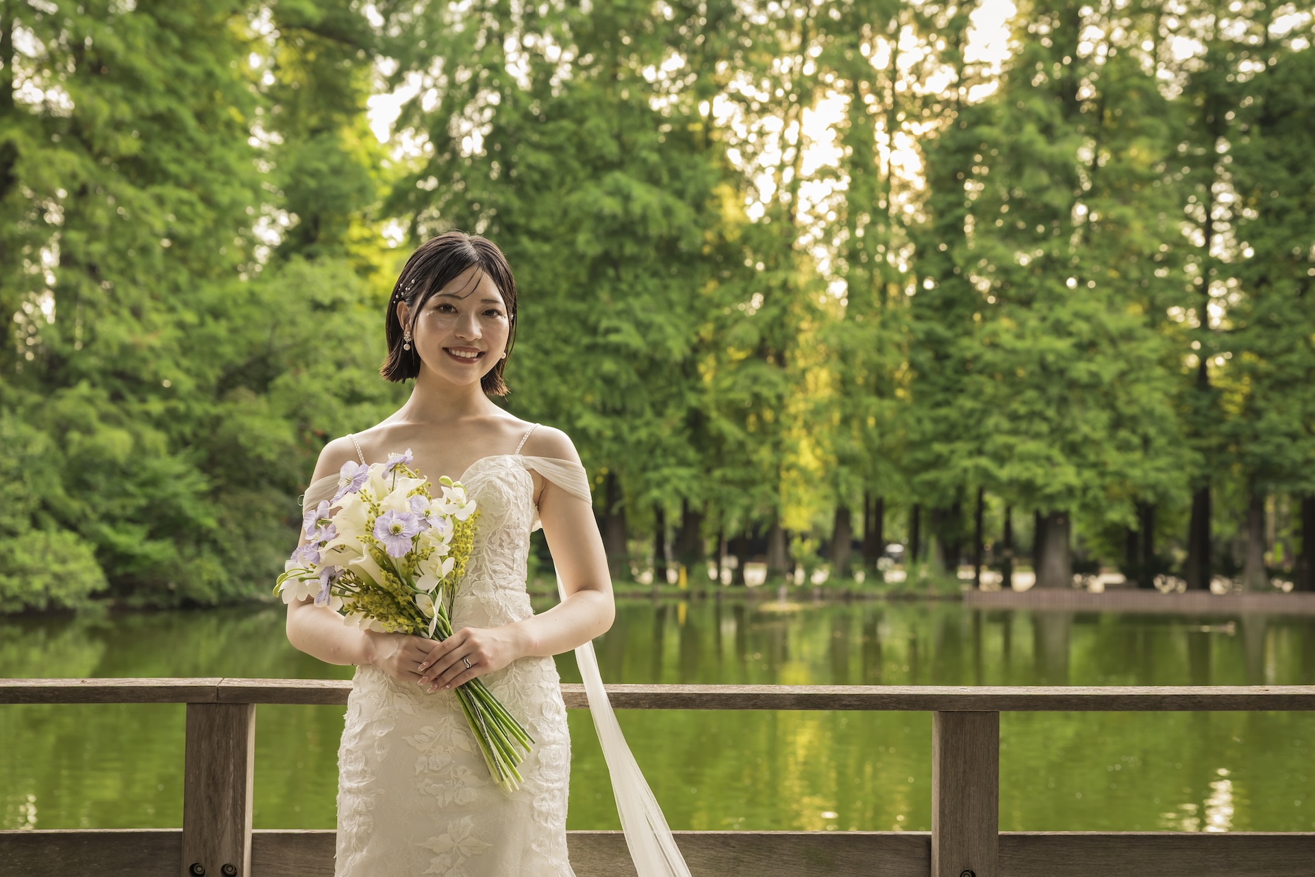 高く伸びる巨木の並木は、息をのむような美しい構図を生み出します。優しく降り注ぐ木漏れ日は、純白のドレスを一層輝かせ、最高の表情を引き出します。長いトレーンが広がるエレガントな姿は、まるで映画のワンシーンのよう。別所沼公園の並木道が、格調高い特別な一枚を約束します。