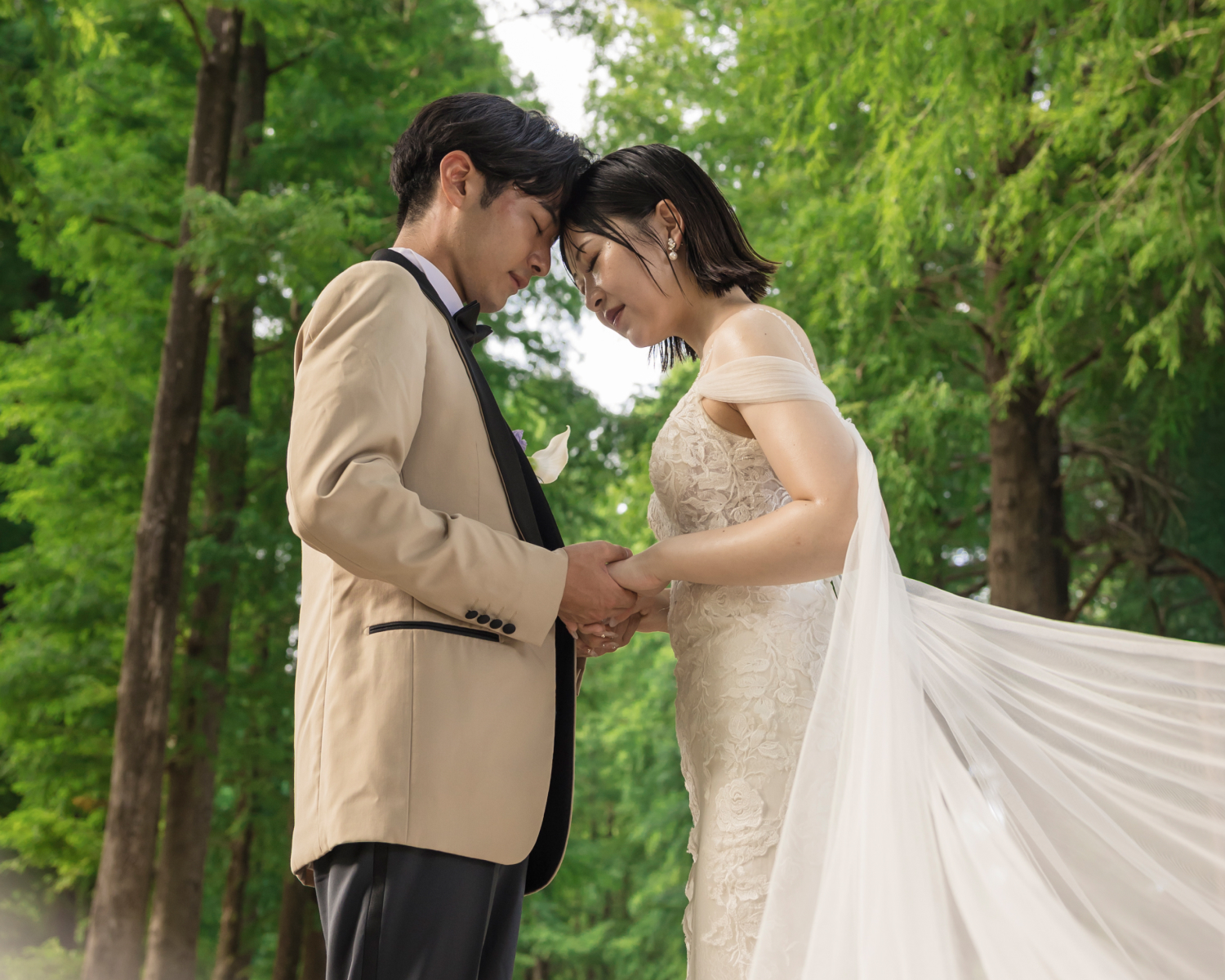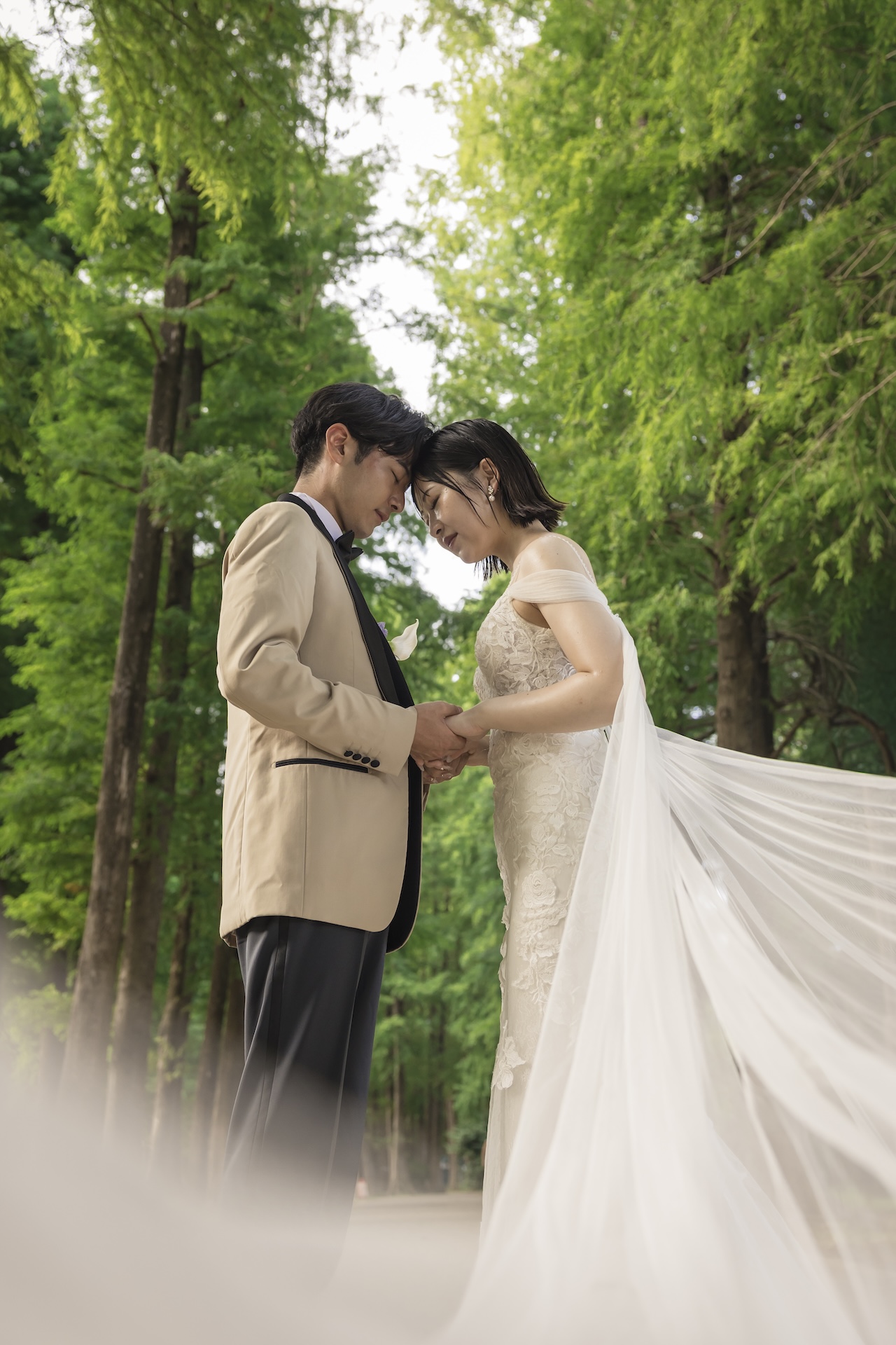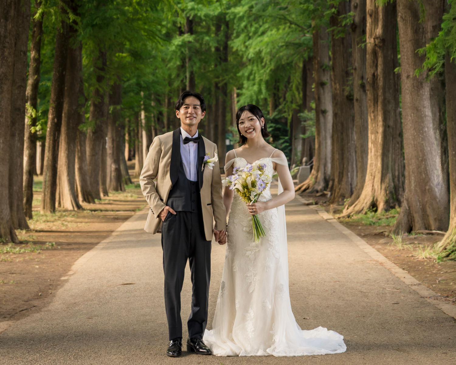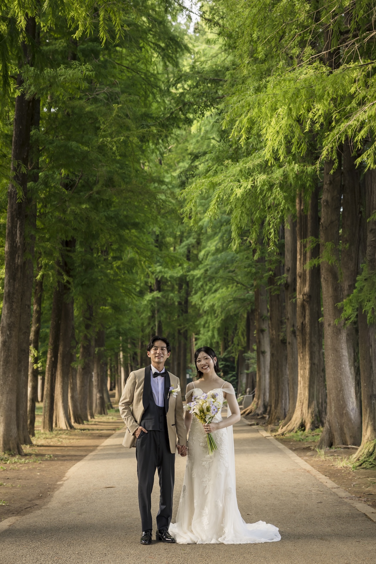 高く伸びる巨木の並木は、息をのむような美しい構図を生み出します。優しく降り注ぐ木漏れ日は、純白のドレスを一層輝かせ、最高の表情を引き出します。長いトレーンが広がるエレガントな姿は、まるで映画のワンシーンのよう。別所沼公園の並木道が、格調高い特別な一枚を約束します。