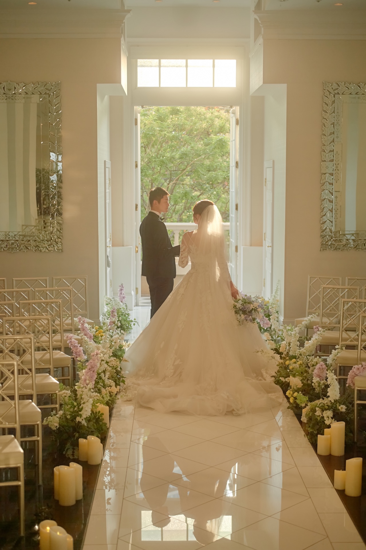 赤坂駅直結、赤坂サカスの丘の上に佇む「セントアクアチャペル赤坂」は、天井高7m、バージンロード15mのスケール感をもつ純白のチャペル。