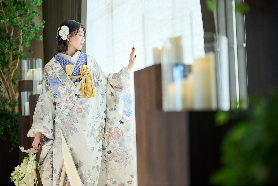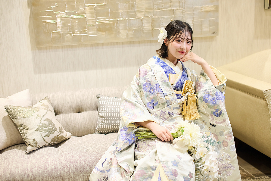 洗練された現代的な空間に和装が優しく馴染む、フォトジェニックなワンシーン。伝統とモダンが引き立て合う上質な時間を演出します。