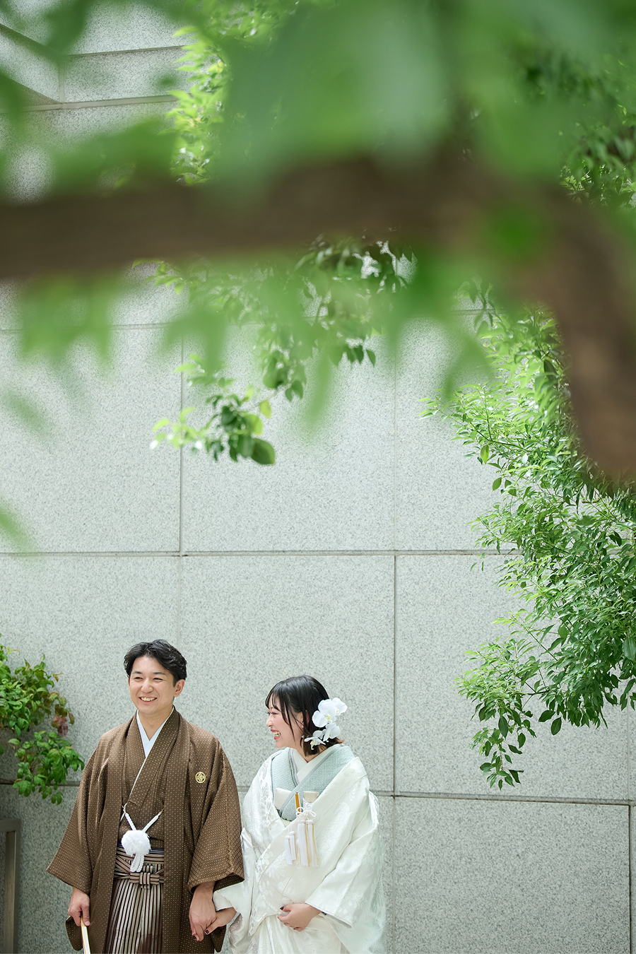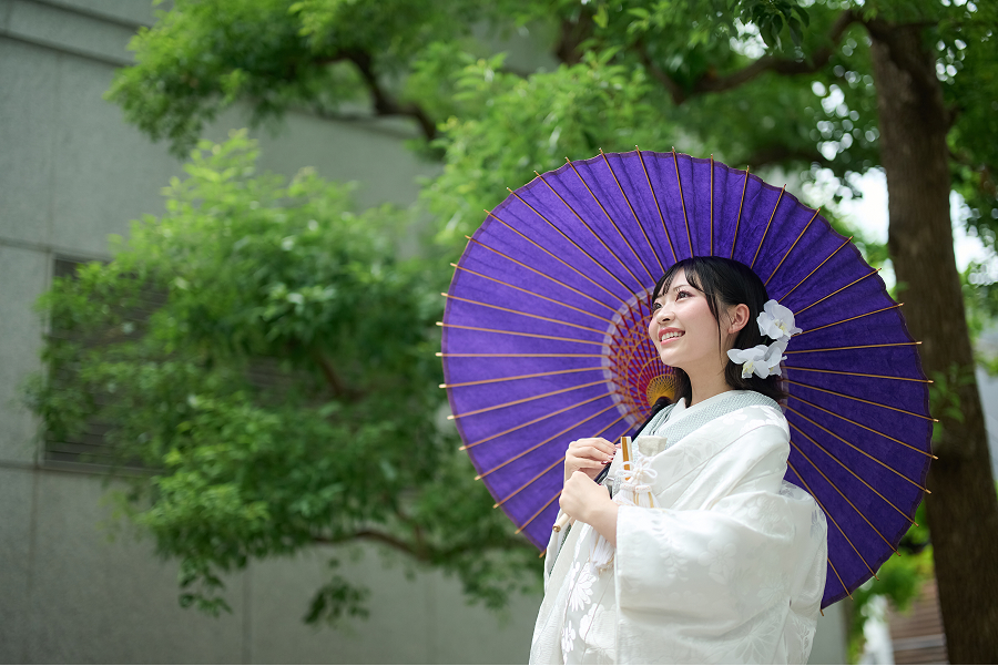 鮮やかな美しい濃緑と和装の華やかさをより一層引き立てます。和傘などの小物を使用して、特別感あふれるフォトシーンを演出します。