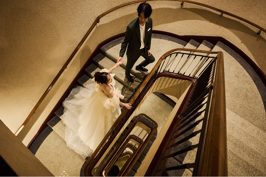 曲線美が美しい螺旋階段は、ドレスのバックスタイルをより印象的に引き立てます。 優雅なシルエットと階段の造形が調和し、シンプルで洗練された映画のワンシーンのような撮影を。