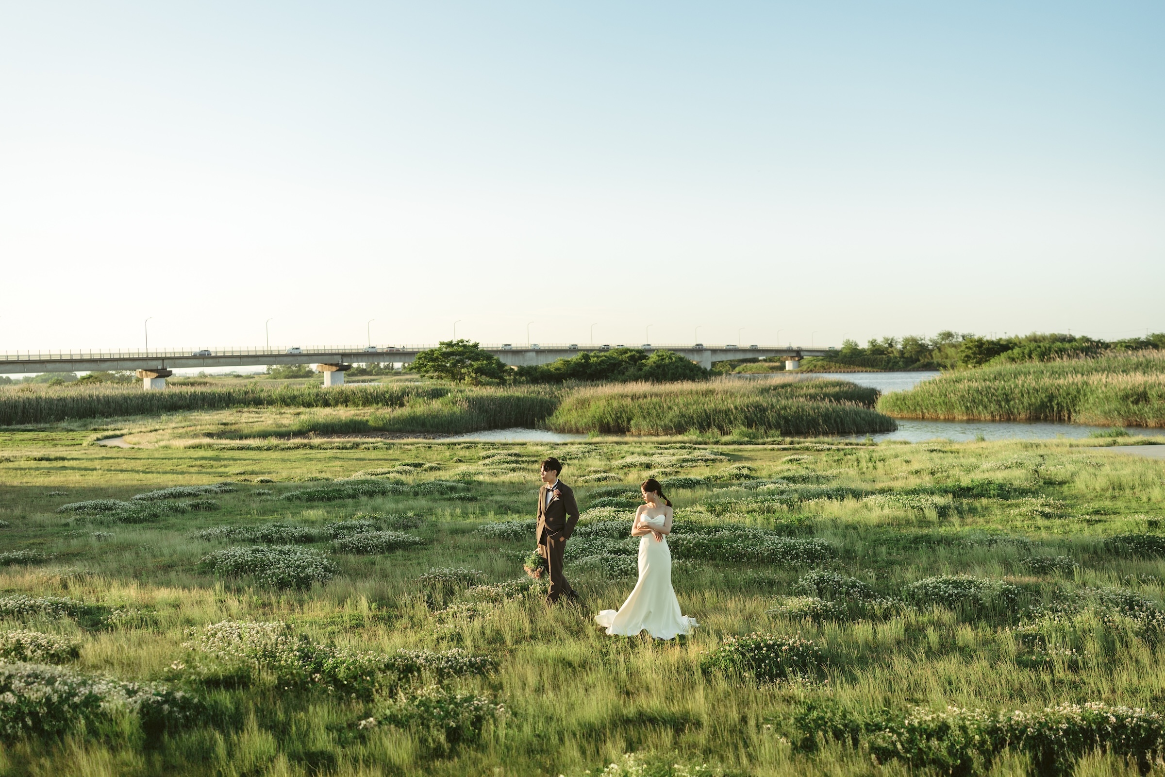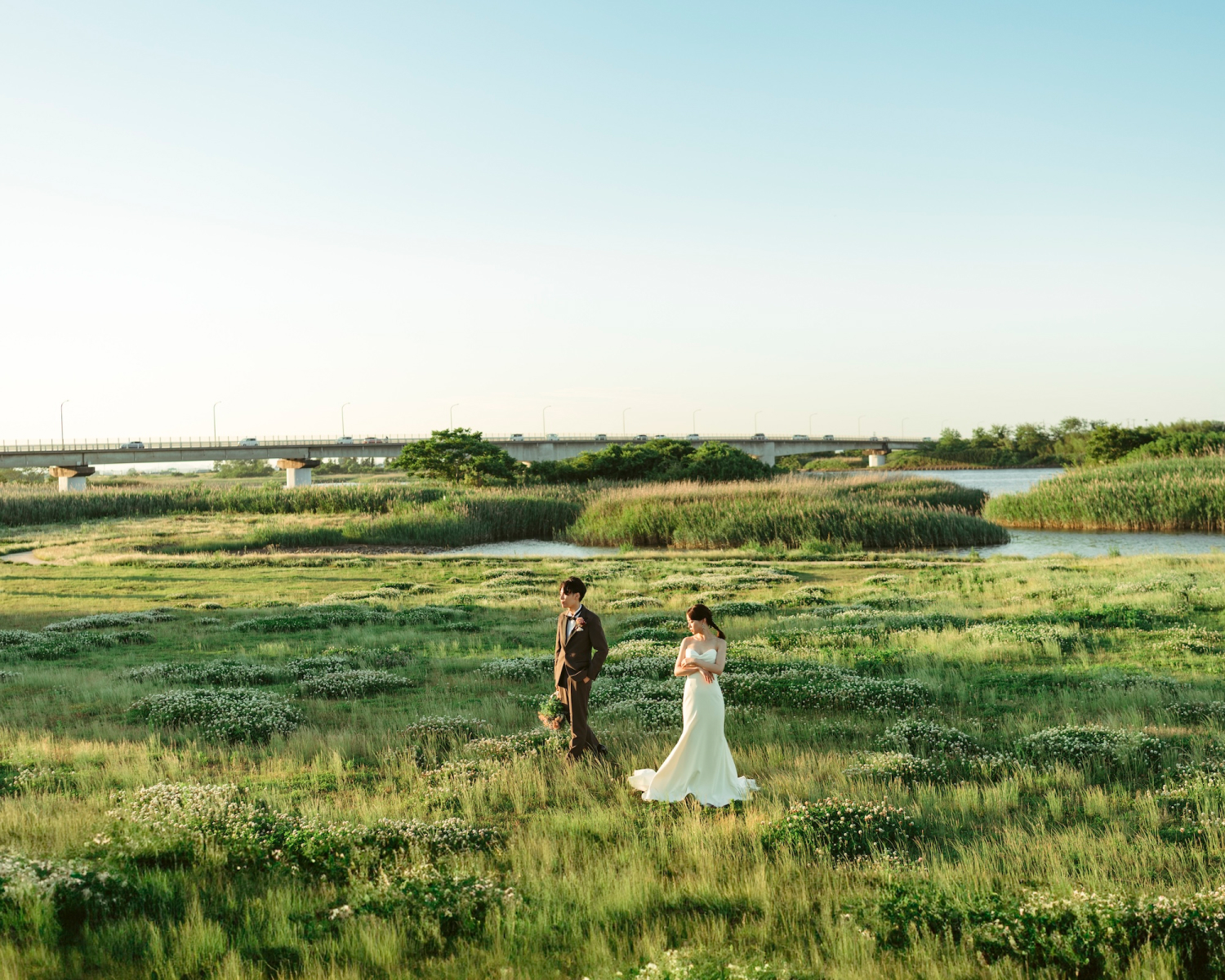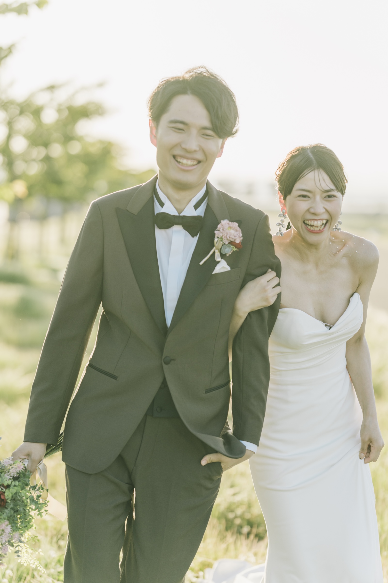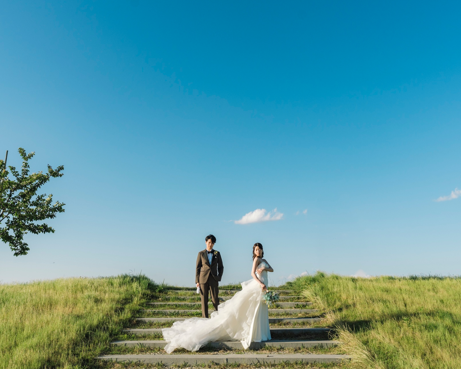 かわまちてらす閖上周辺の名取川沿いは、どこまでも続くような青空と緑の絨毯が広がり、遮るもののない開放的な河川敷では、自然と心も解き放たれていきます。川面を渡る風を感じながら歩けば、お二人の間に流れる穏やかな空気感そのものが写真に。深呼吸したくなるような心地よさの中で、美しさと温かさを感じる一枚を残します。