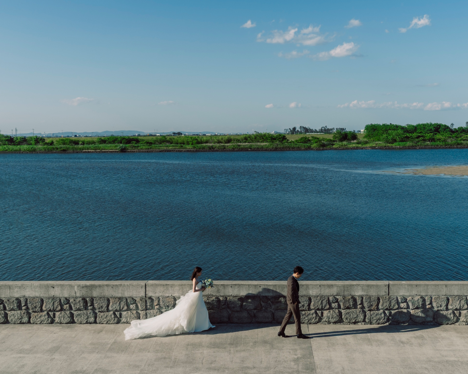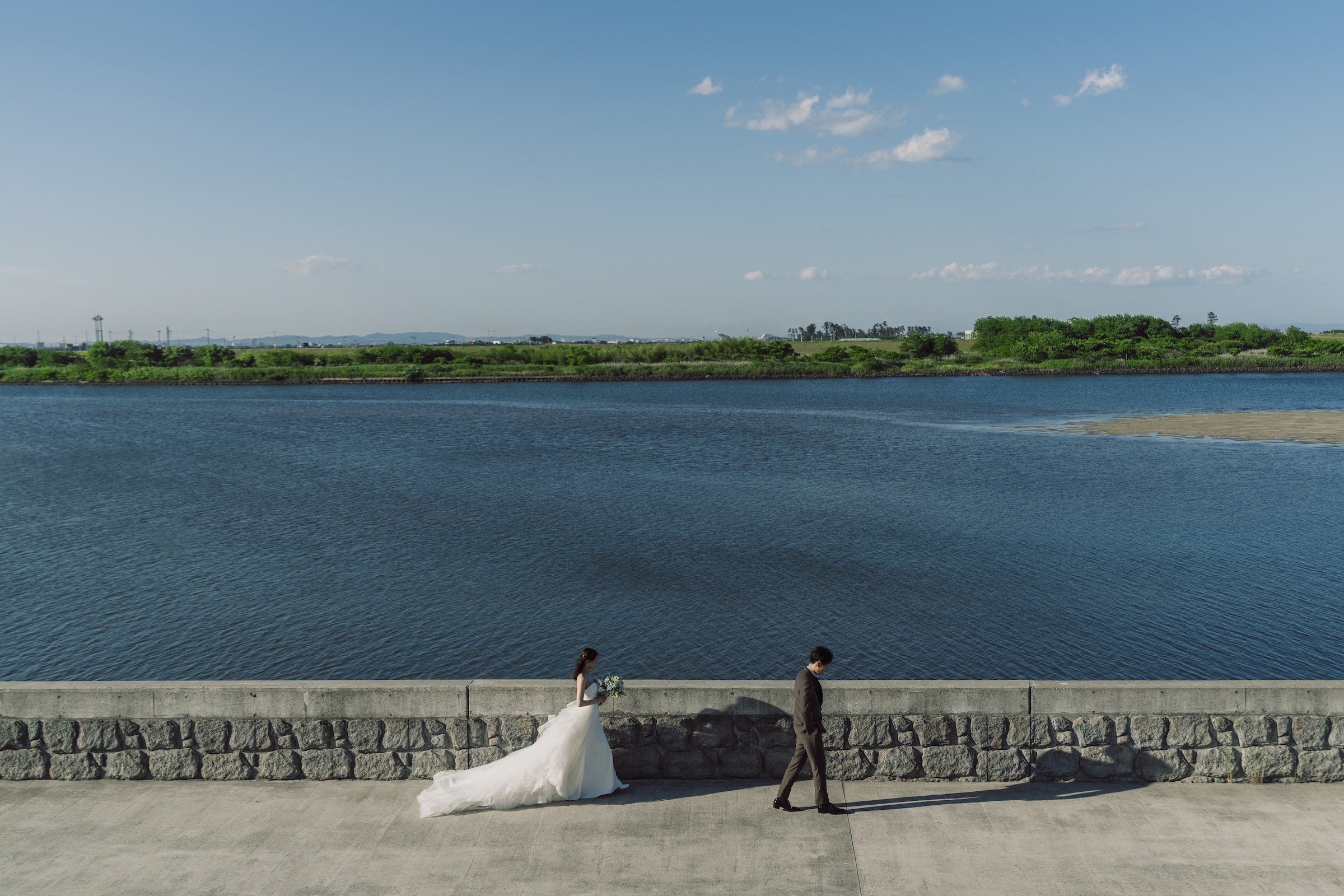 閖上漁港にほど近い名取川は、遊歩道を歩きながらの自然な撮影も楽しめます。広大な川と空の青を背景に、堤防の上を歩くお二人の姿はまるで映画のワンシーン。開放感あふれるロケーションは、周りの目を気にすること無く、のびのびとした気持ちで撮影を楽しめます。