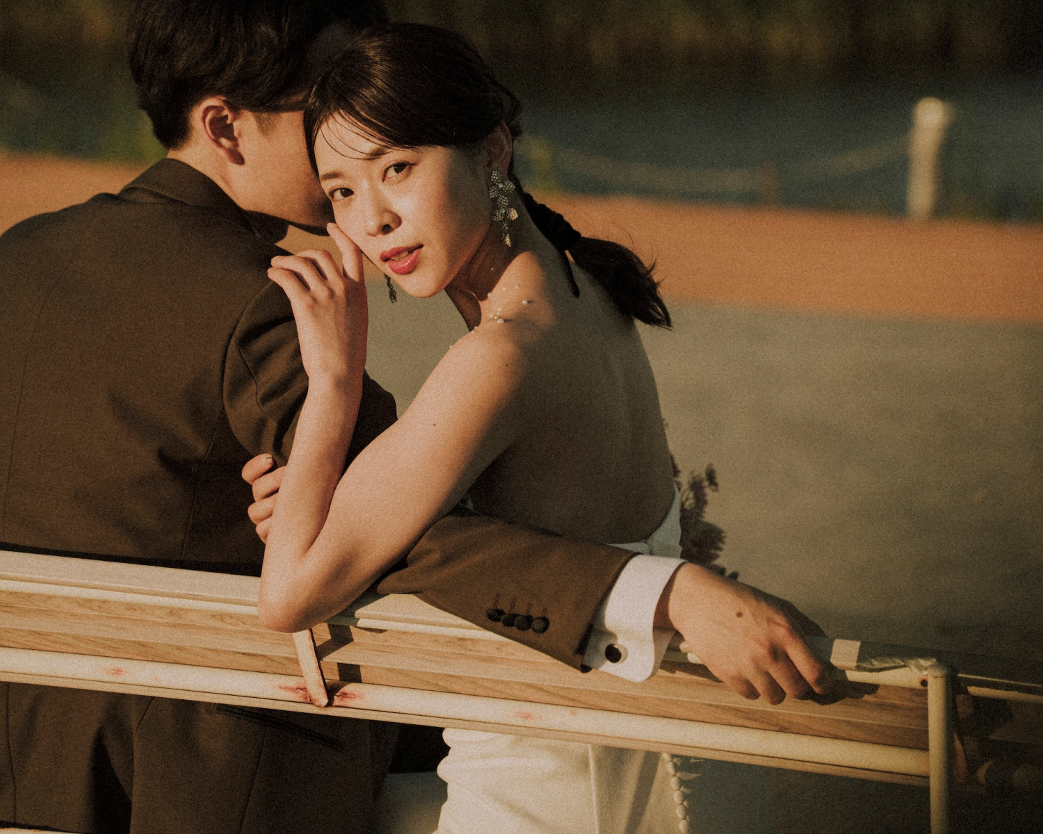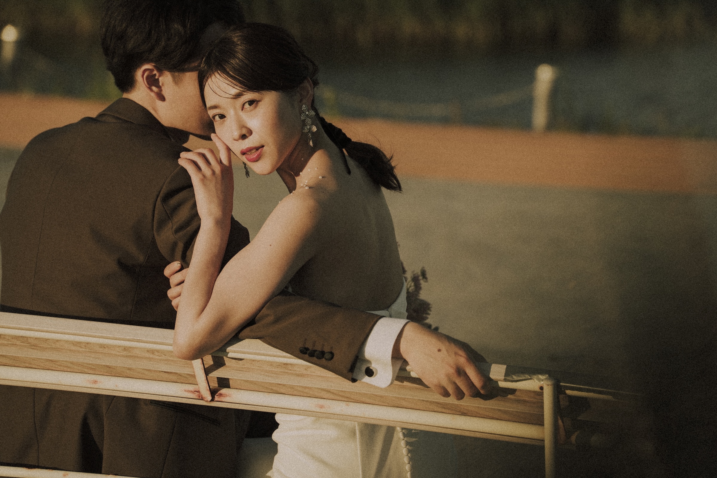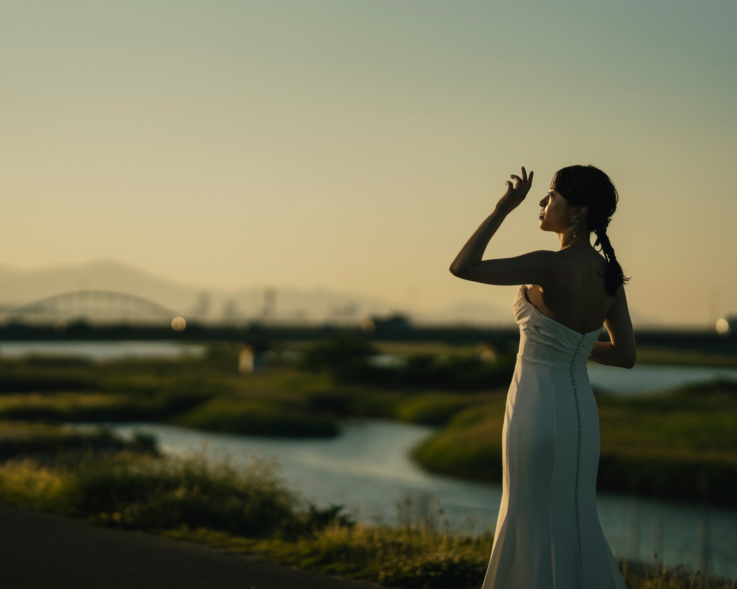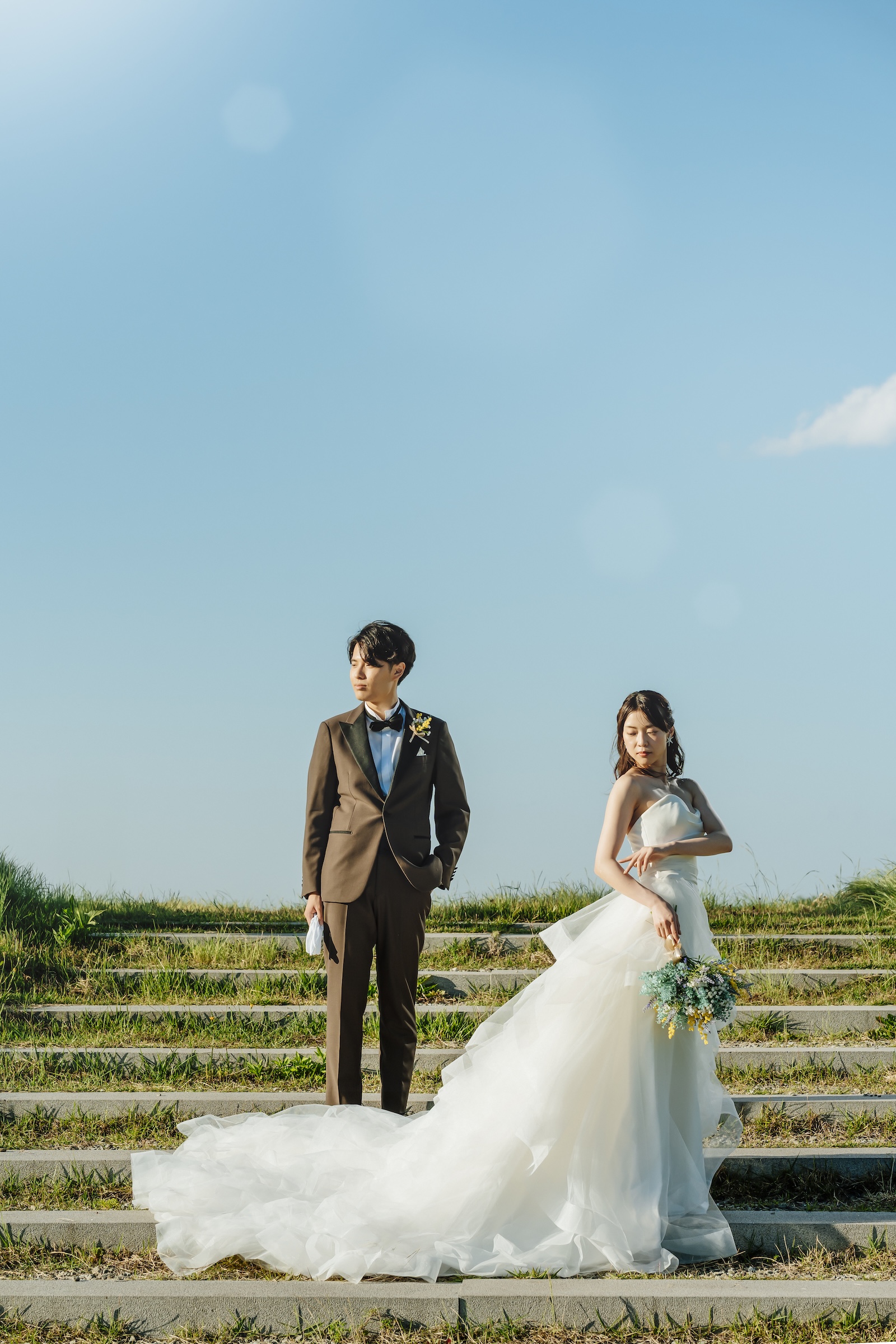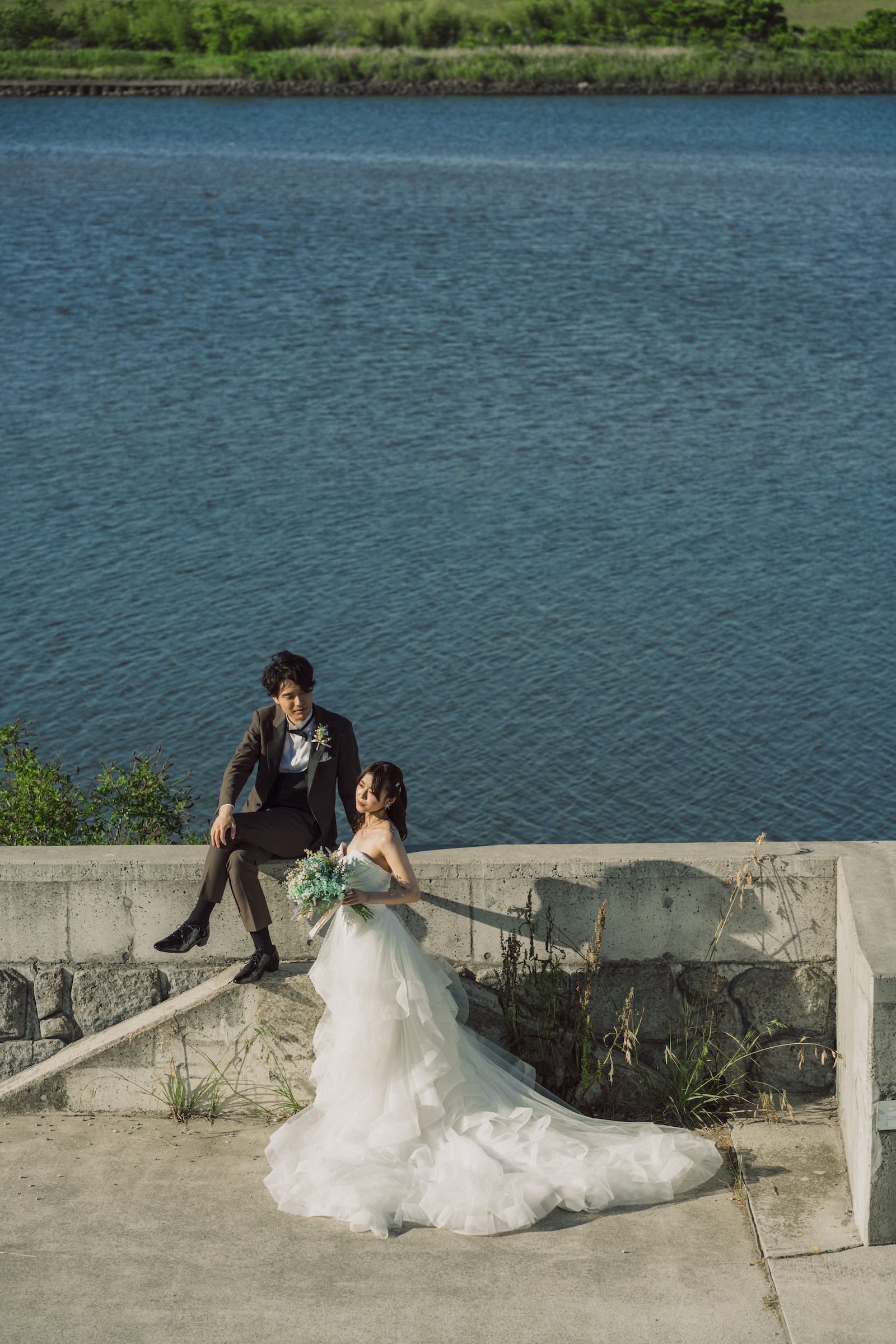 穏やかに流れる川面を眺めながらの、ゆったりとしたひととき。水辺の爽やかな風が頬を撫でる中、ふたりならではの自然な佇まいが写真に刻まれます。やわらかな自然光がお二人を照らし、温かみあふれる一枚に仕上がります。