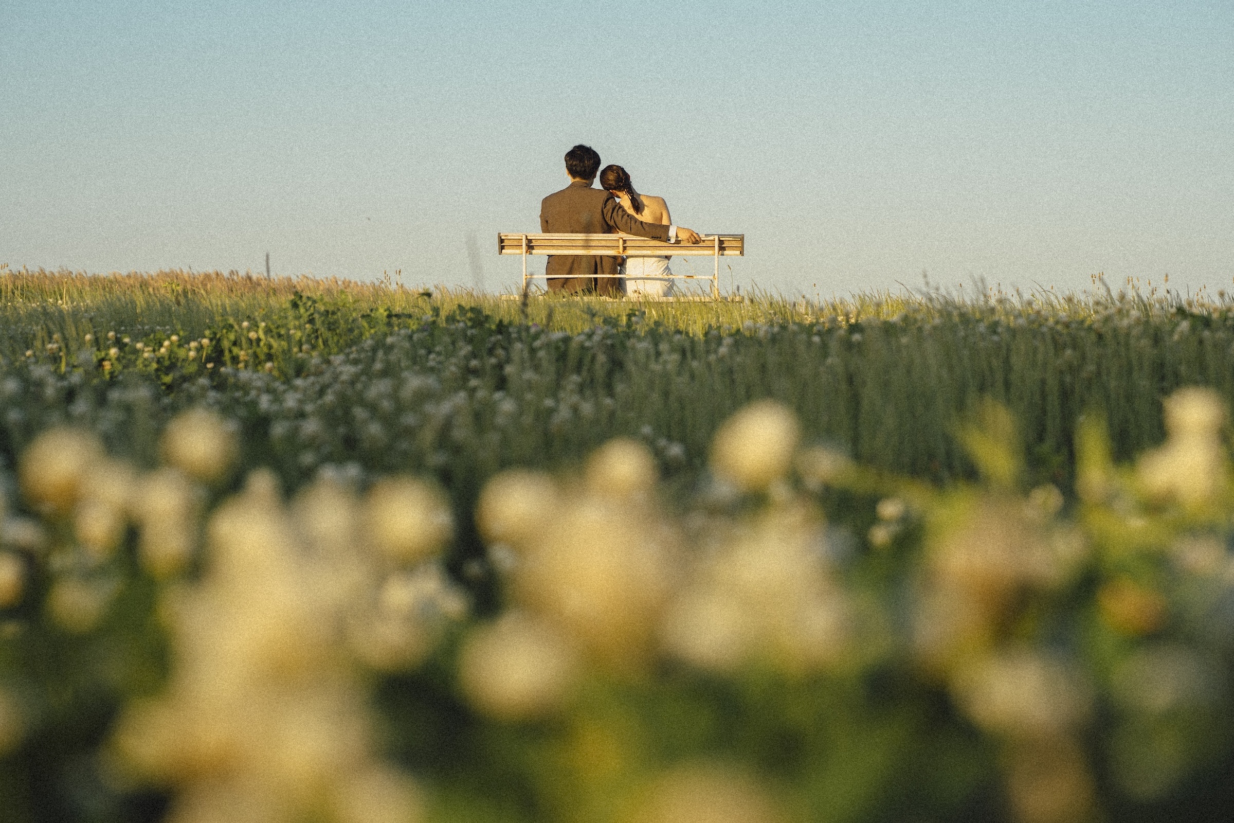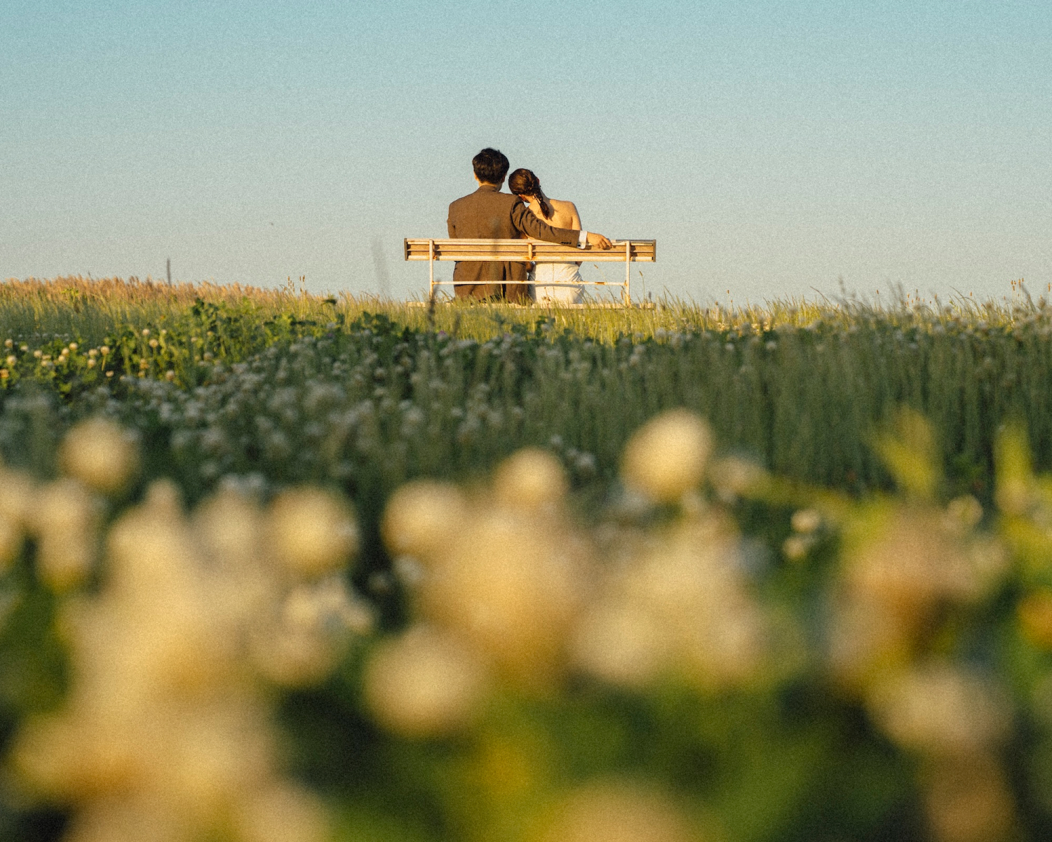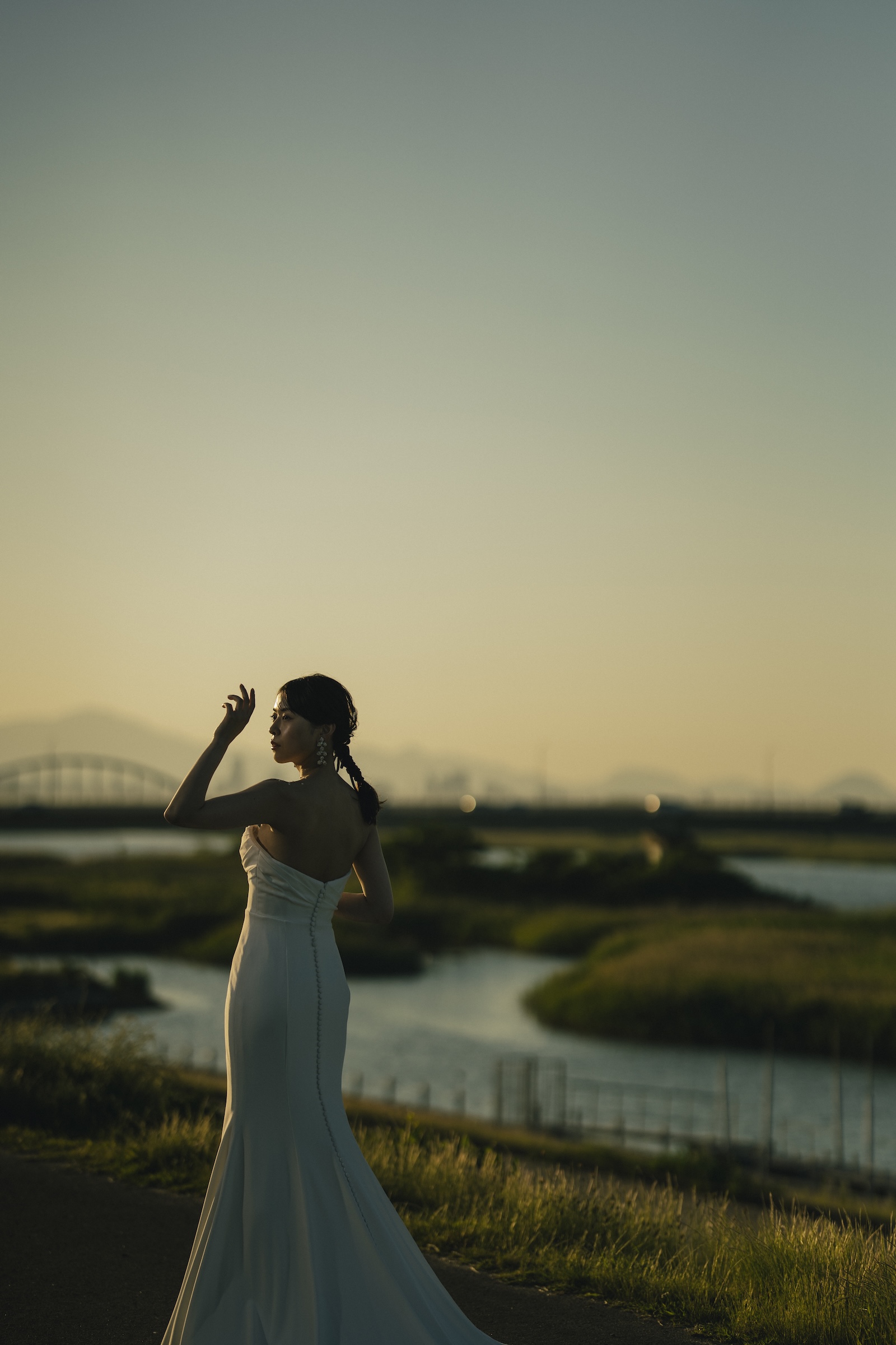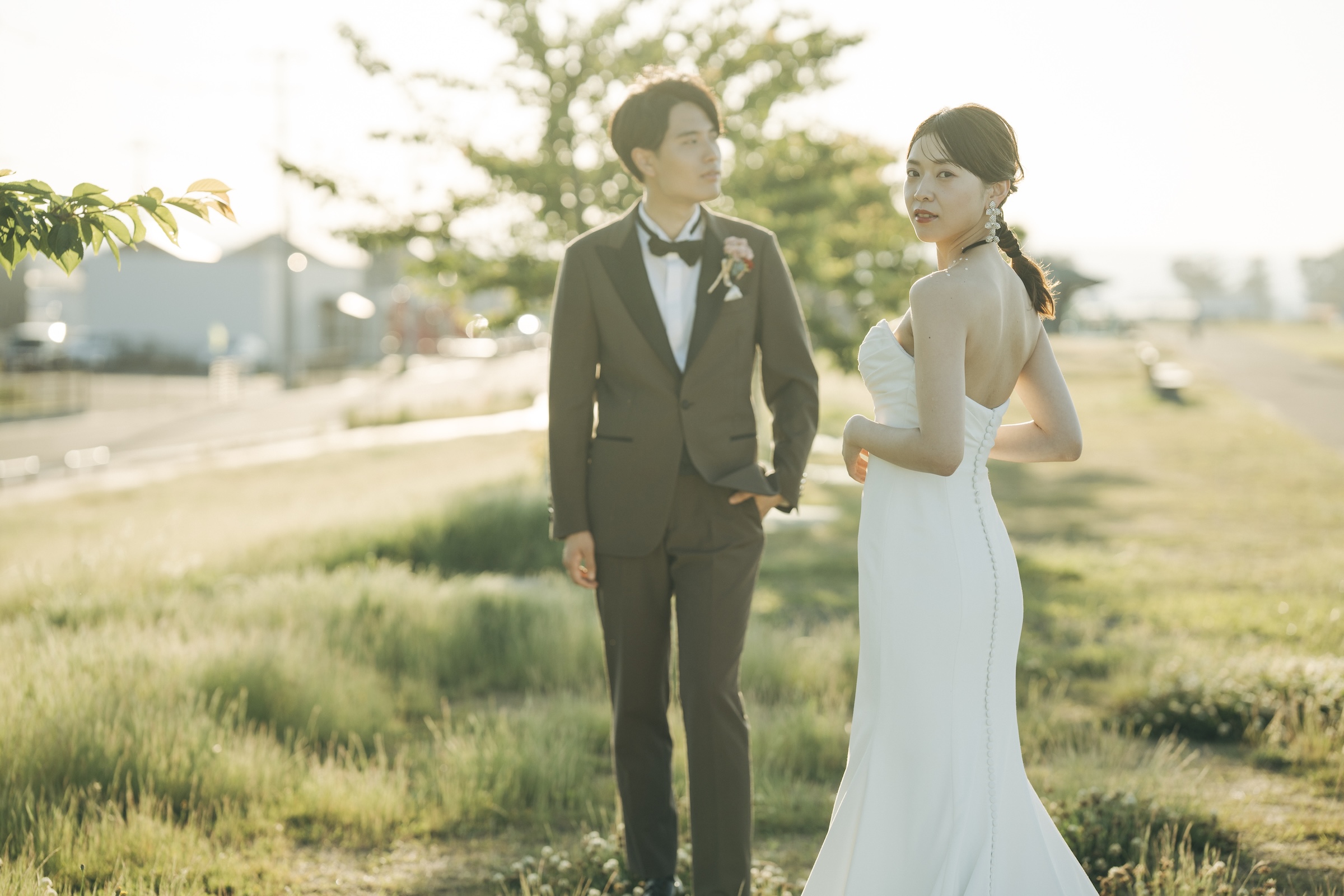 一日の終わり、空が黄金色から茜色へと表情を変えるマジックアワー。夕陽の柔らかな光は、不思議と心が落ち着き、どこか懐かしさを感じる写真に仕上がります。光の中に浮かぶお二人のシルエットは、この日の大切な記憶として、いつまでも色褪せることなく心に残る一枚となるでしょう。