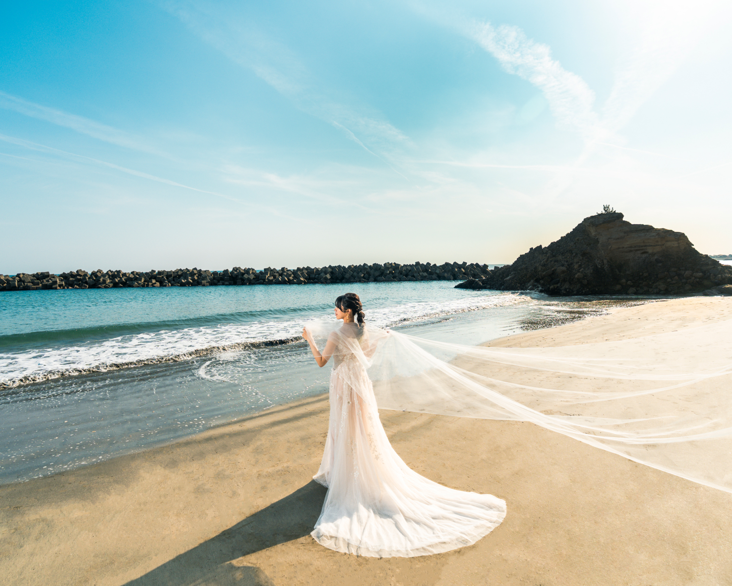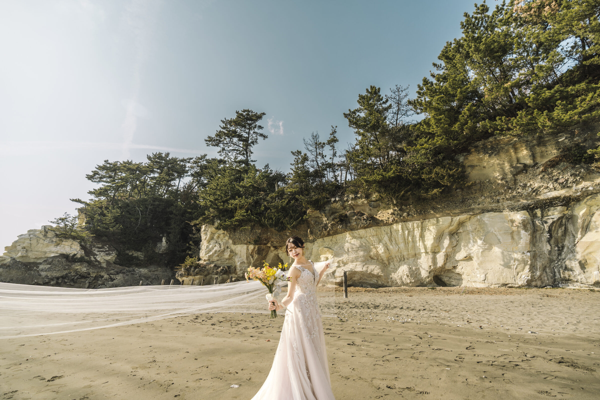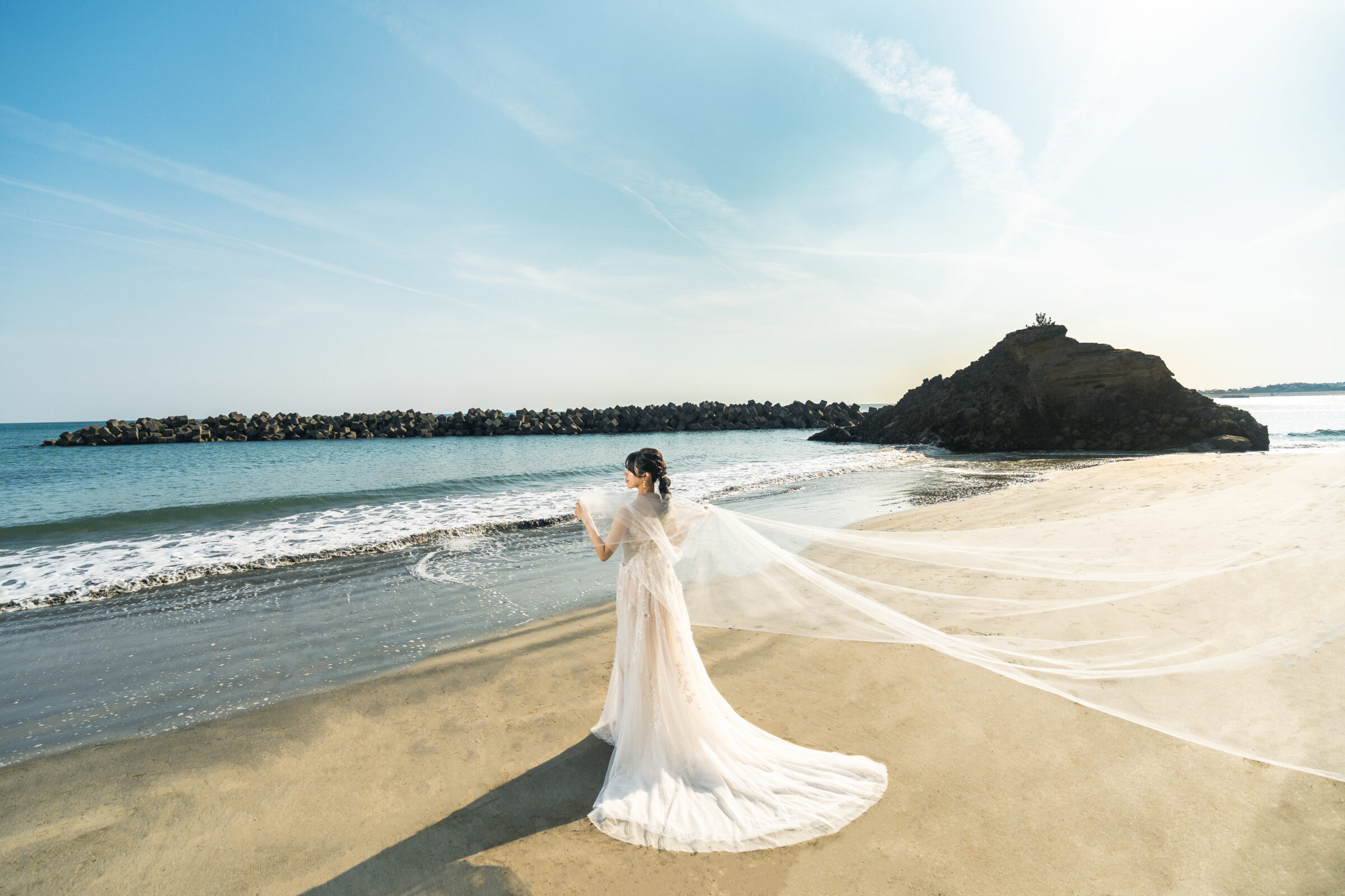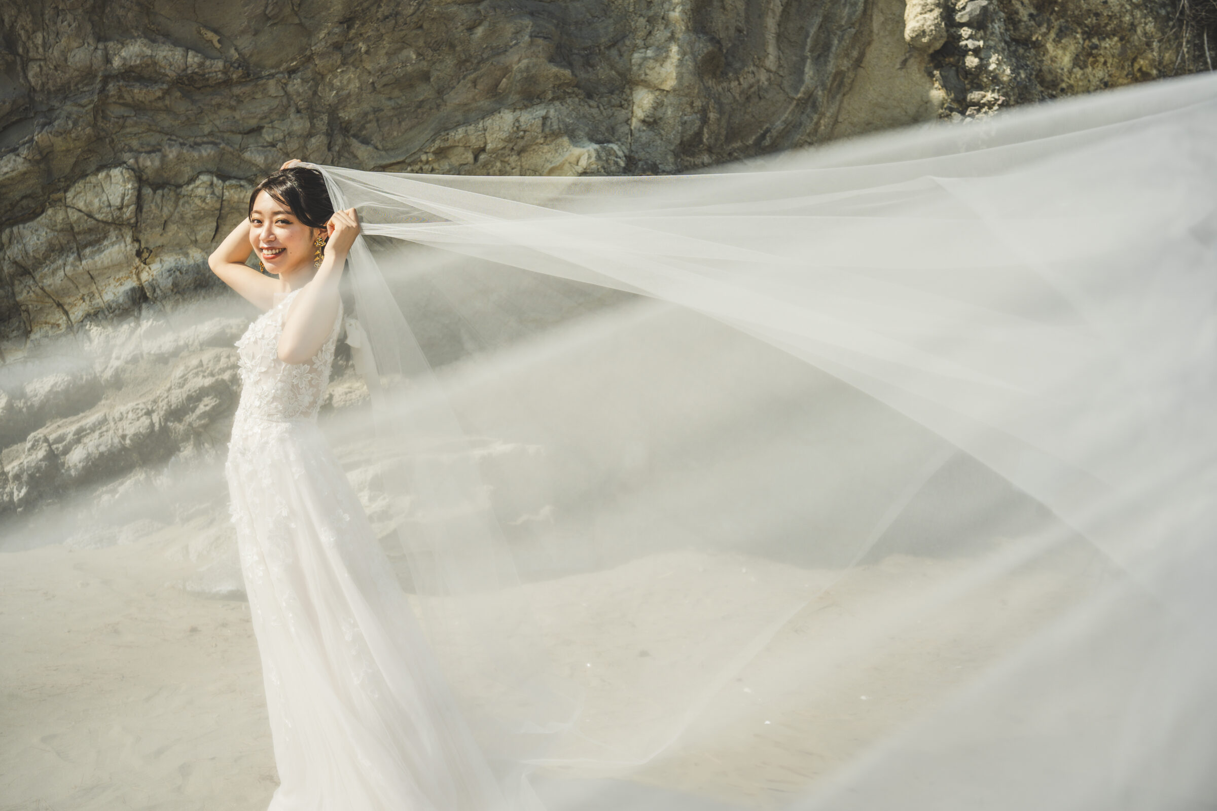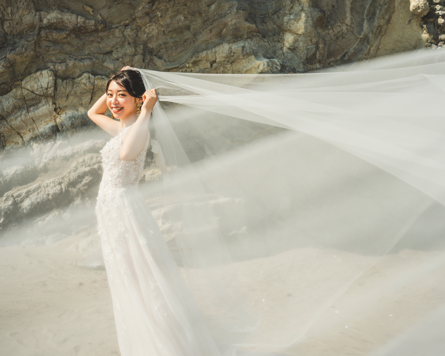 海辺の心地よい潮風がベールを美しく舞い上げ、幻想的な瞬間を演出します。風の力を利用したダイナミックな撮影は、静止画でありながら躍動感に満ちた1枚に。自然が作り出すこの一瞬の美しさは、計算では生み出せない輝き放ちます。