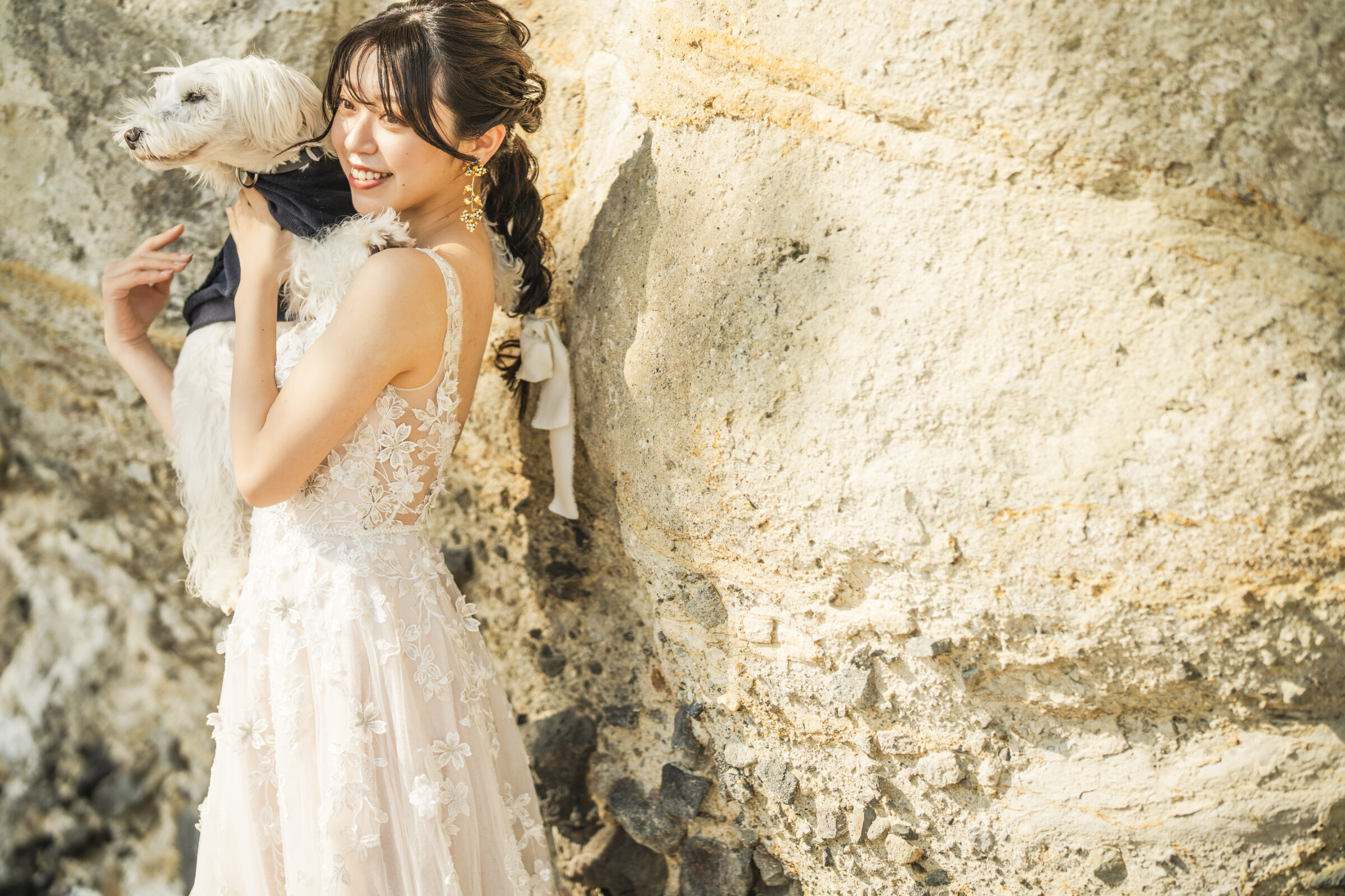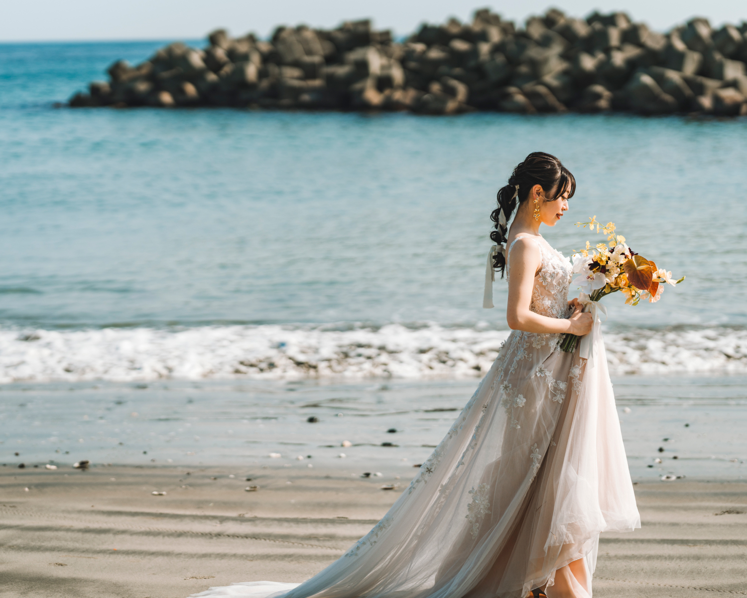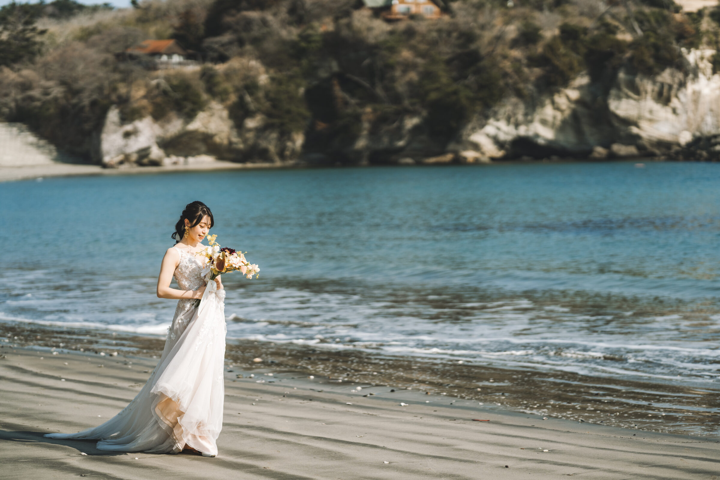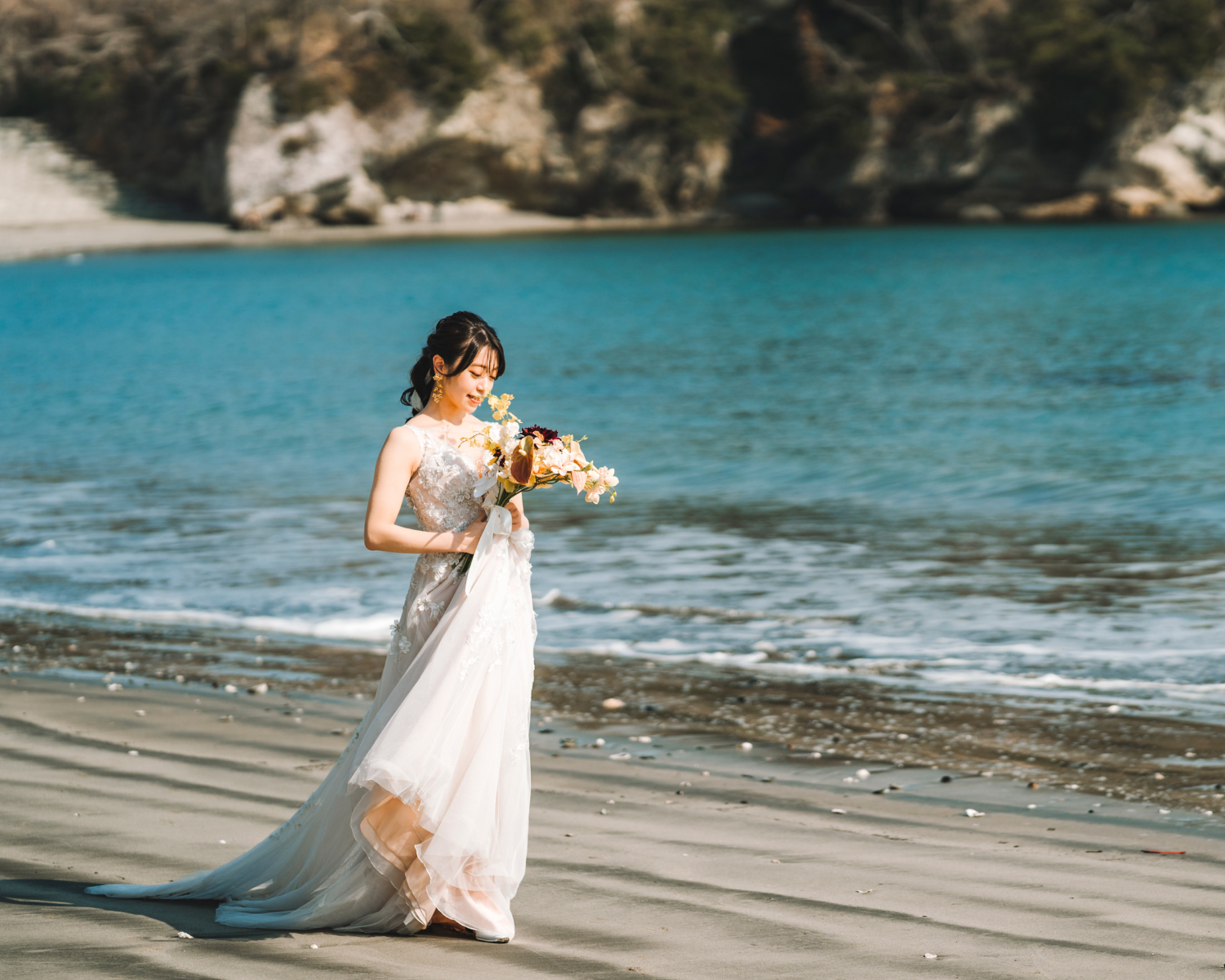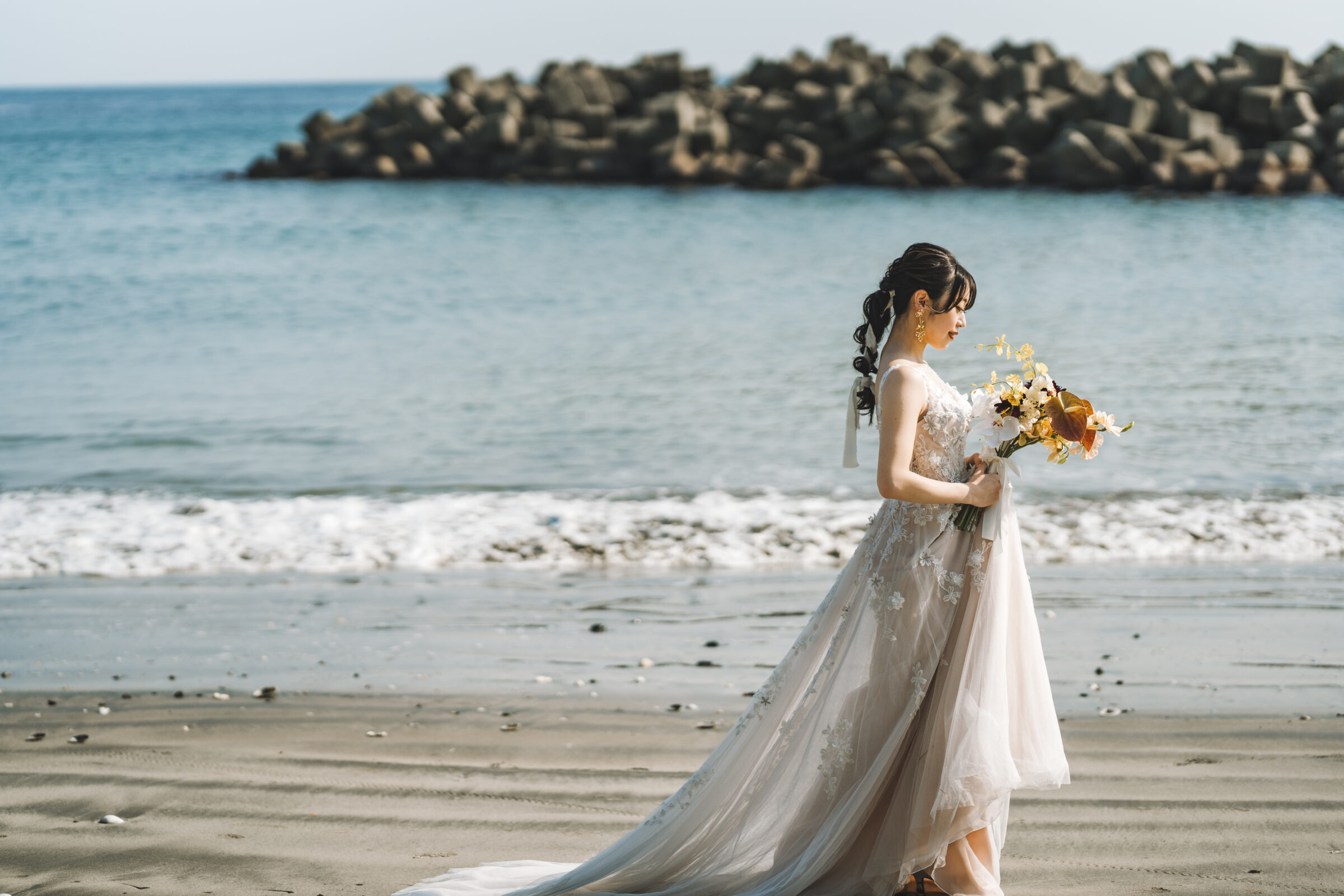海辺の心地よい潮風がベールを美しく舞い上げ、幻想的な瞬間を演出します。風の力を利用したダイナミックな撮影は、静止画でありながら躍動感に満ちた1枚に。自然が作り出すこの一瞬の美しさは、計算では生み出せない輝き放ちます。