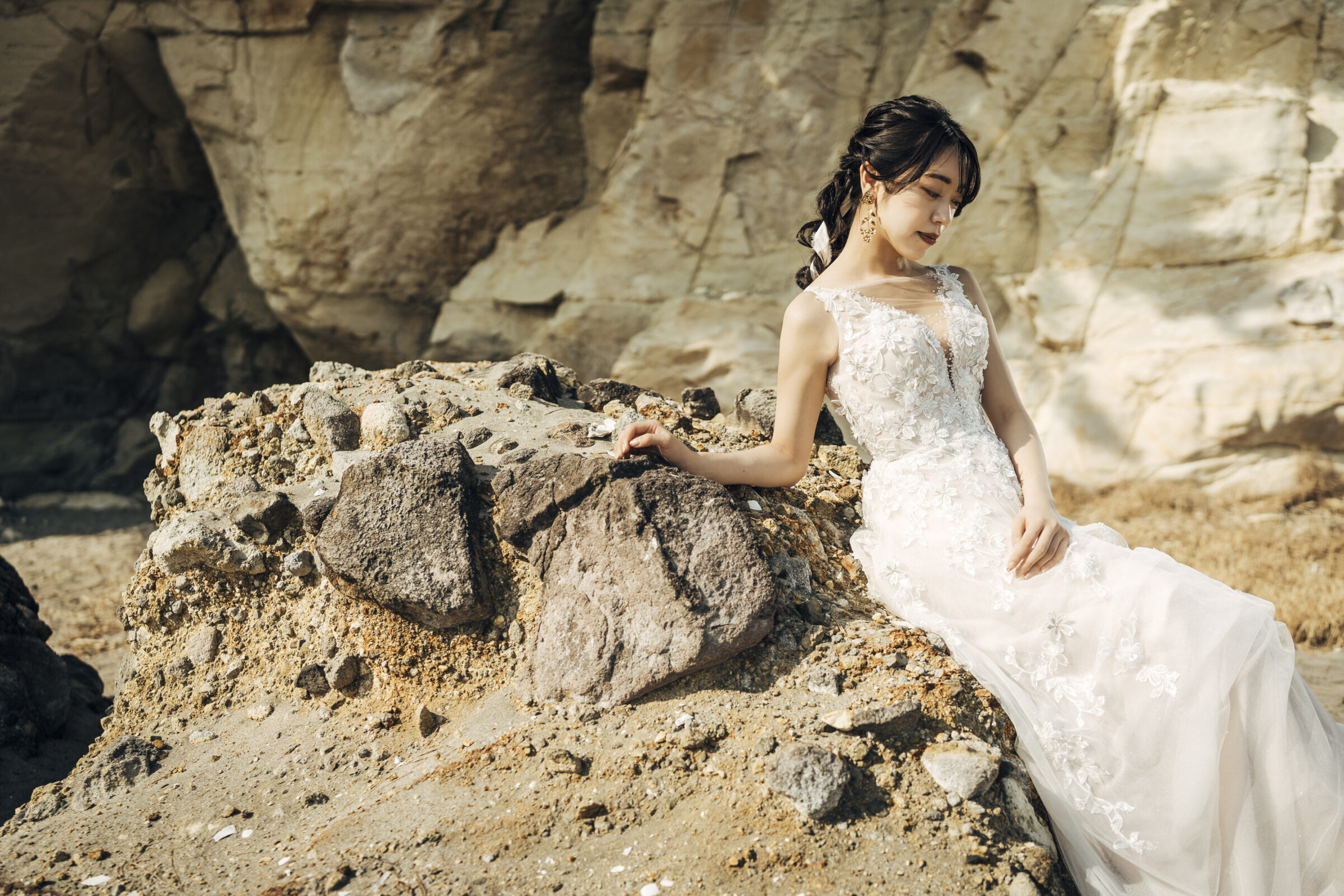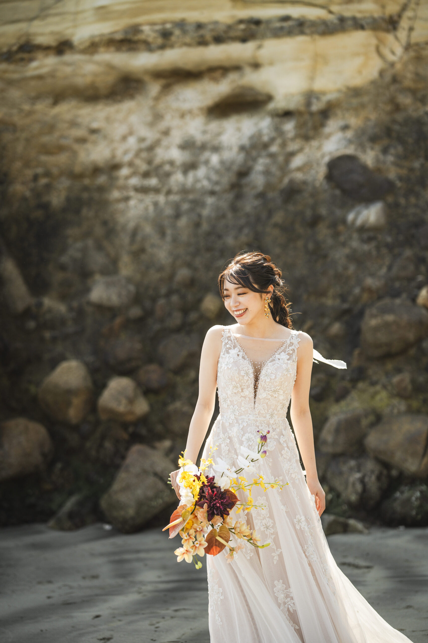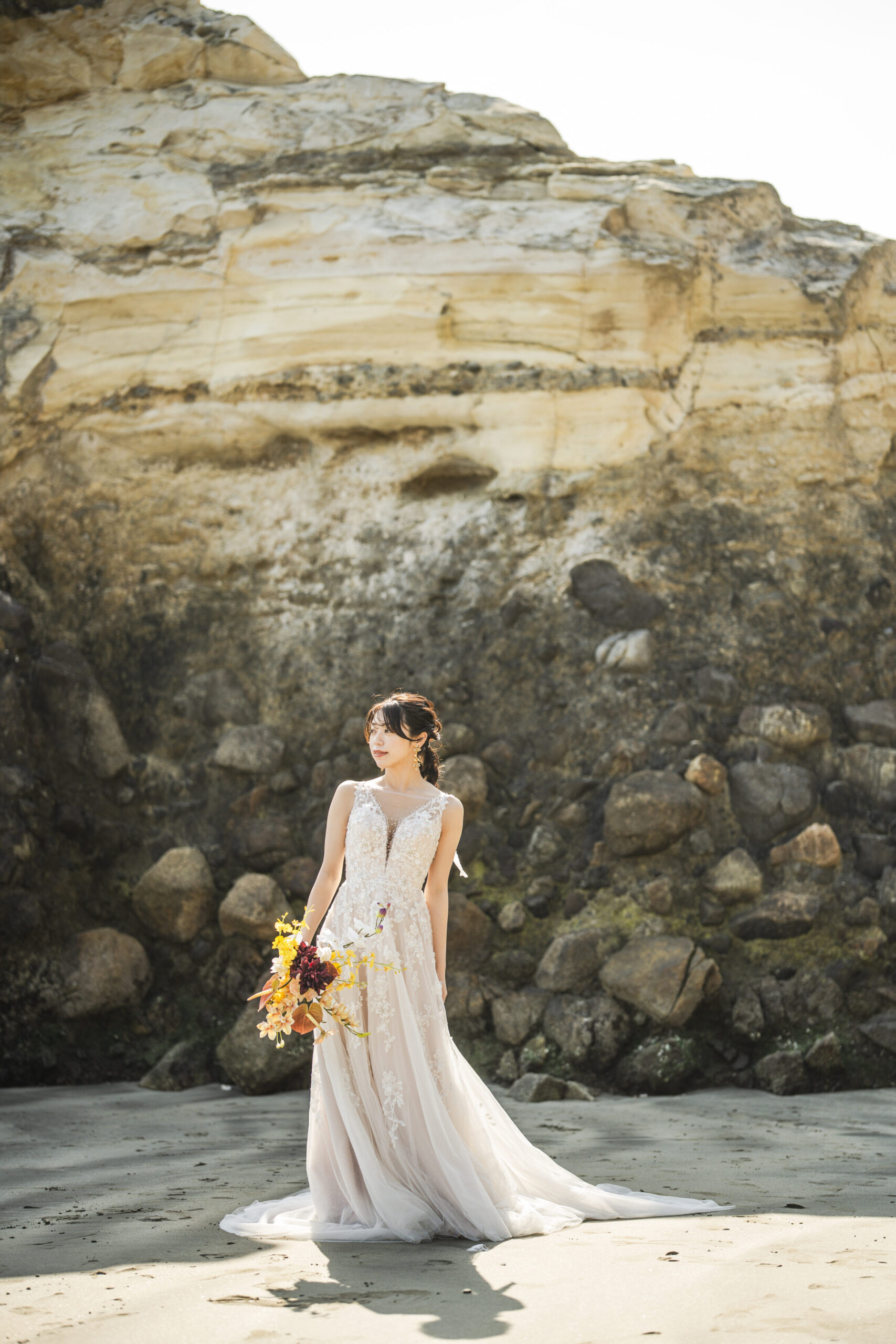 海岸に佇む、迫力ある岩壁。その荒々しくも美しい造形美は、ウェディングフォトにドラマティックな深みを与えてくれます。悠久の歴史を刻む自然の力強さが、これから新しい歴史を刻むお二人を祝福しているかのよう。大自然を舞台にした、映画のワンシーンのような一枚が実現します。