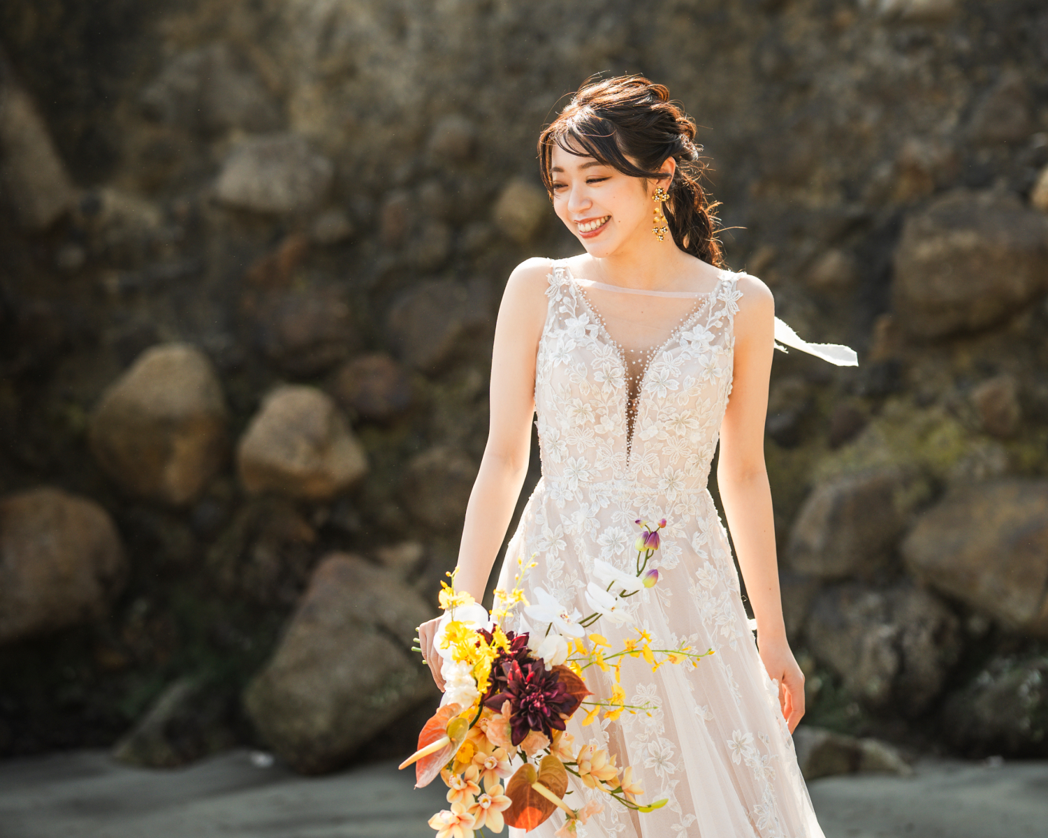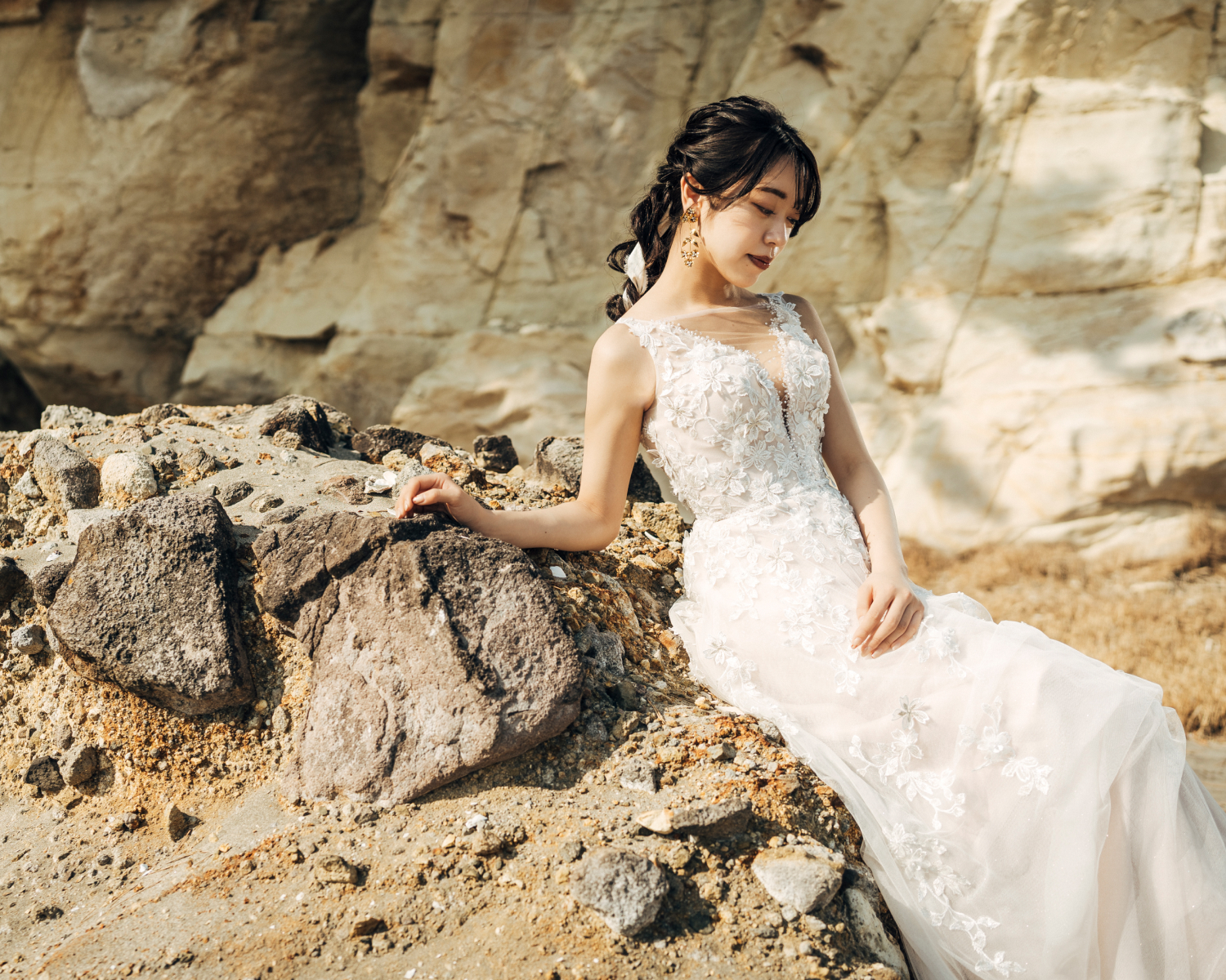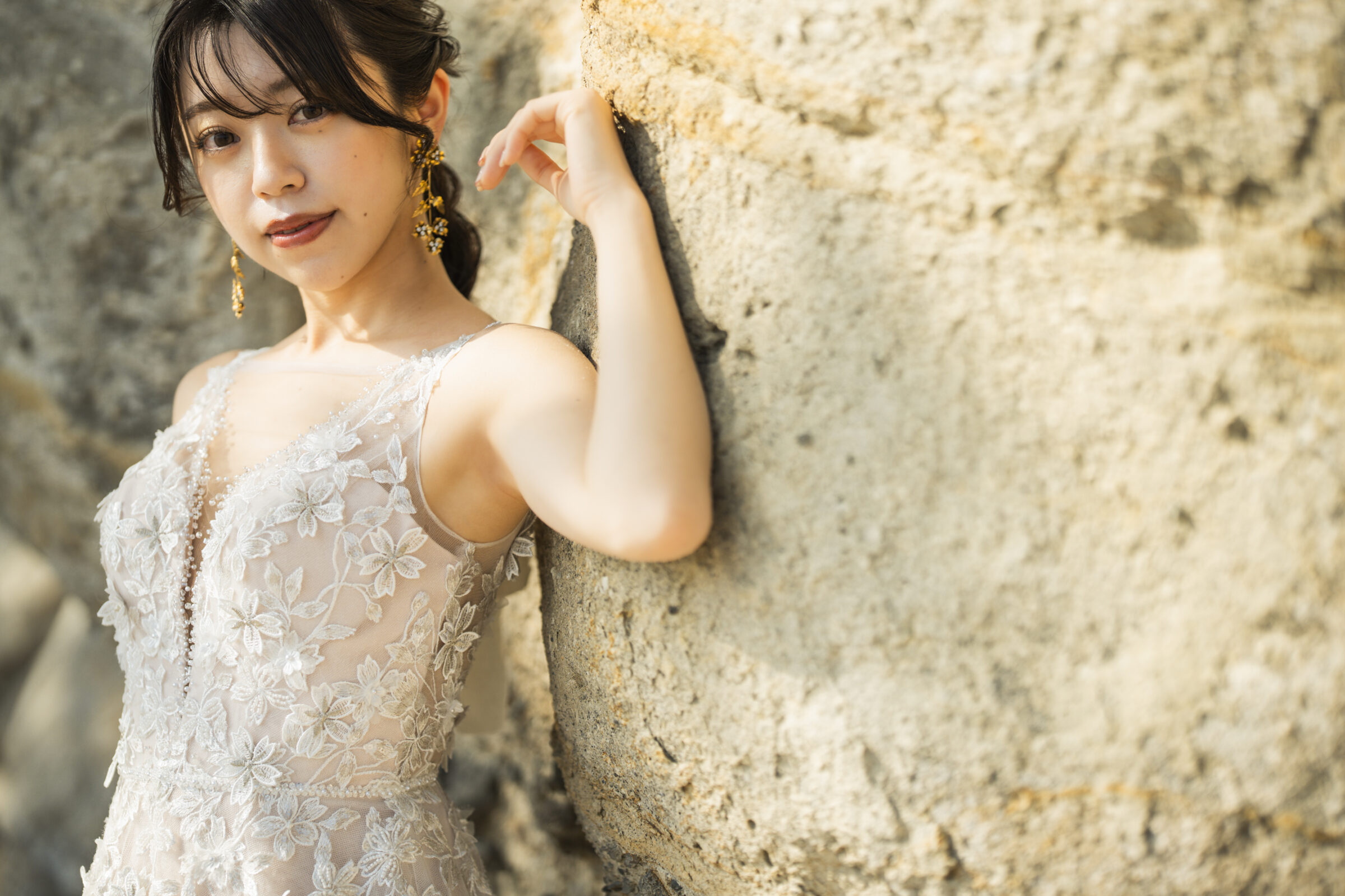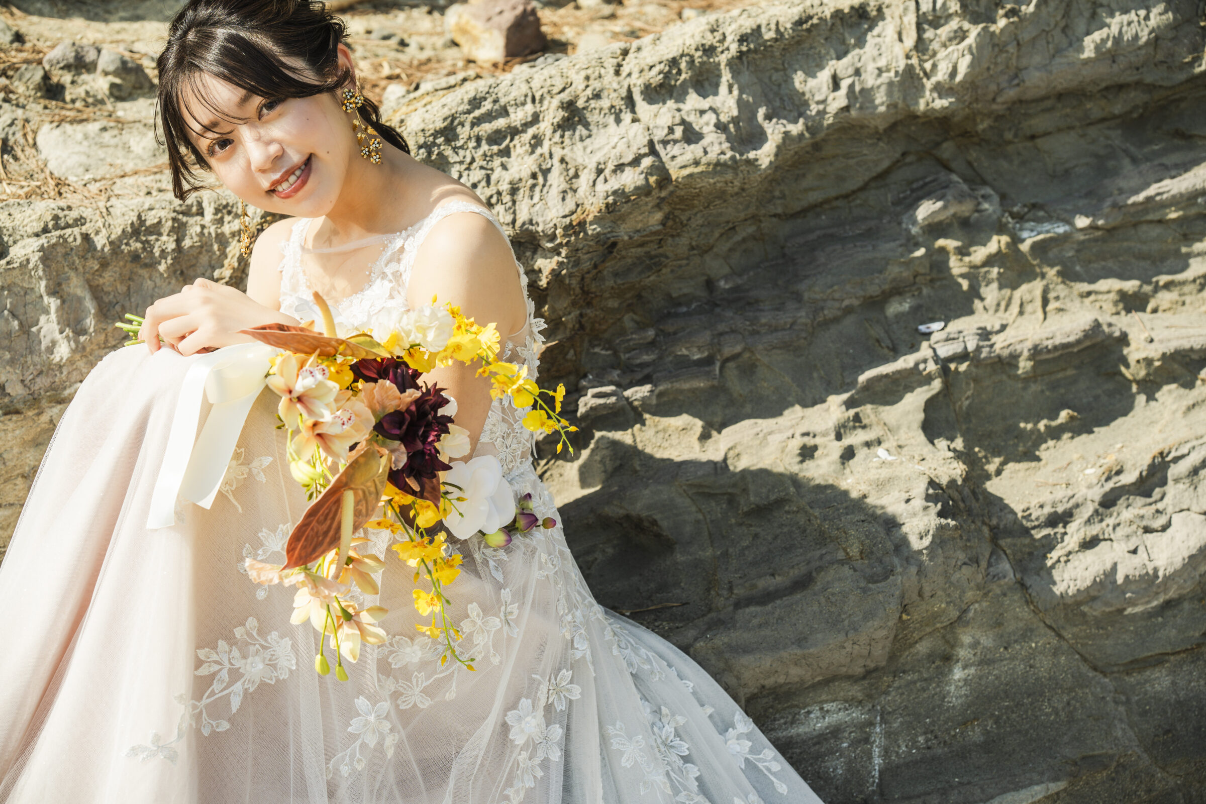 海岸に佇む、迫力ある岩壁。その荒々しくも美しい造形美は、ウェディングフォトにドラマティックな深みを与えてくれます。悠久の歴史を刻む自然の力強さが、これから新しい歴史を刻むお二人を祝福しているかのよう。大自然を舞台にした、映画のワンシーンのような一枚が実現します。