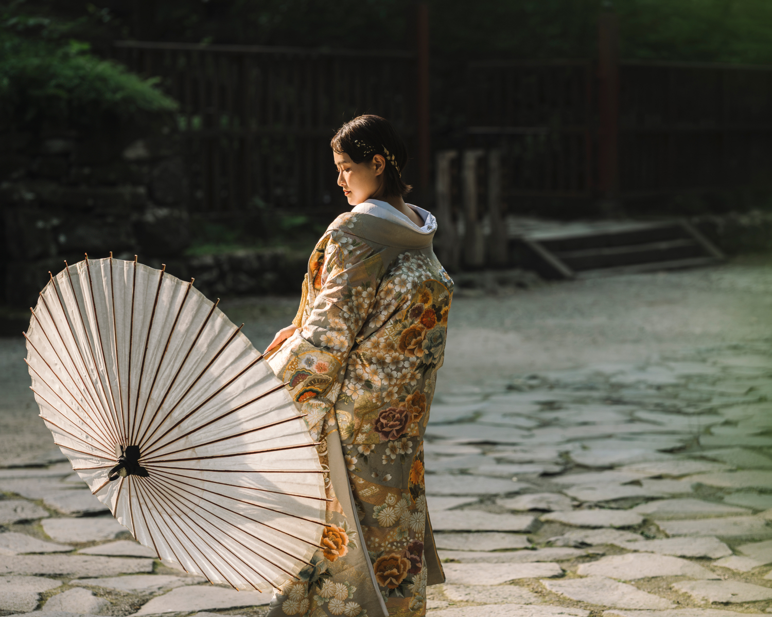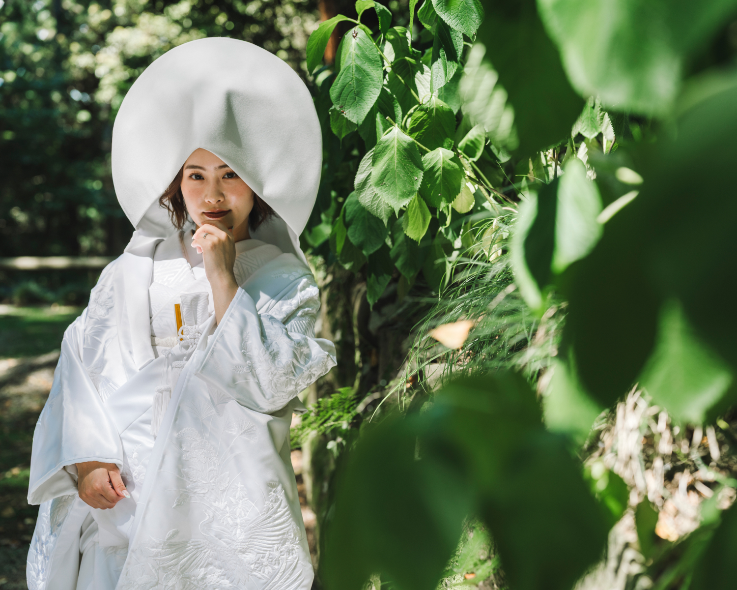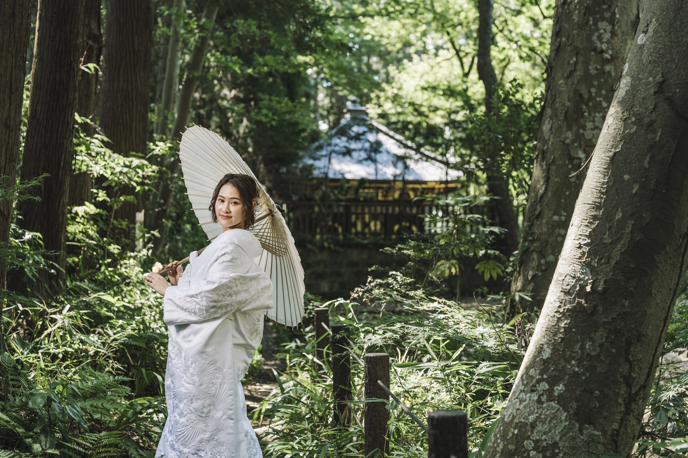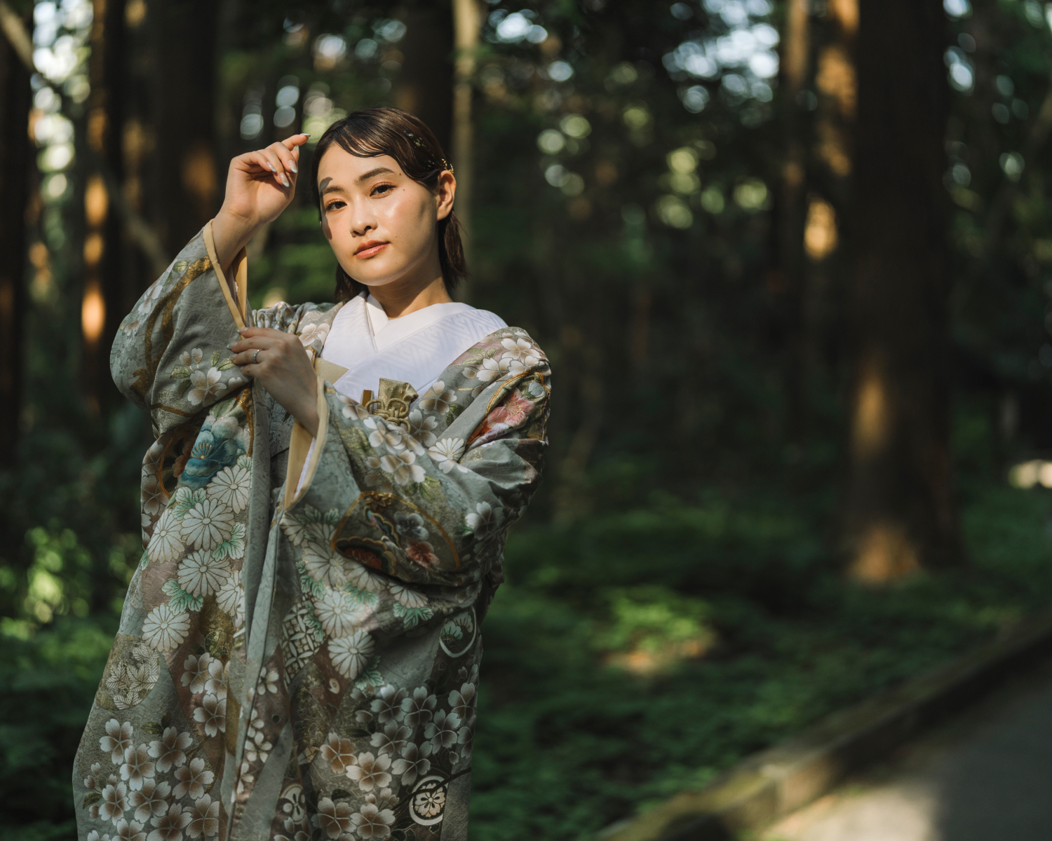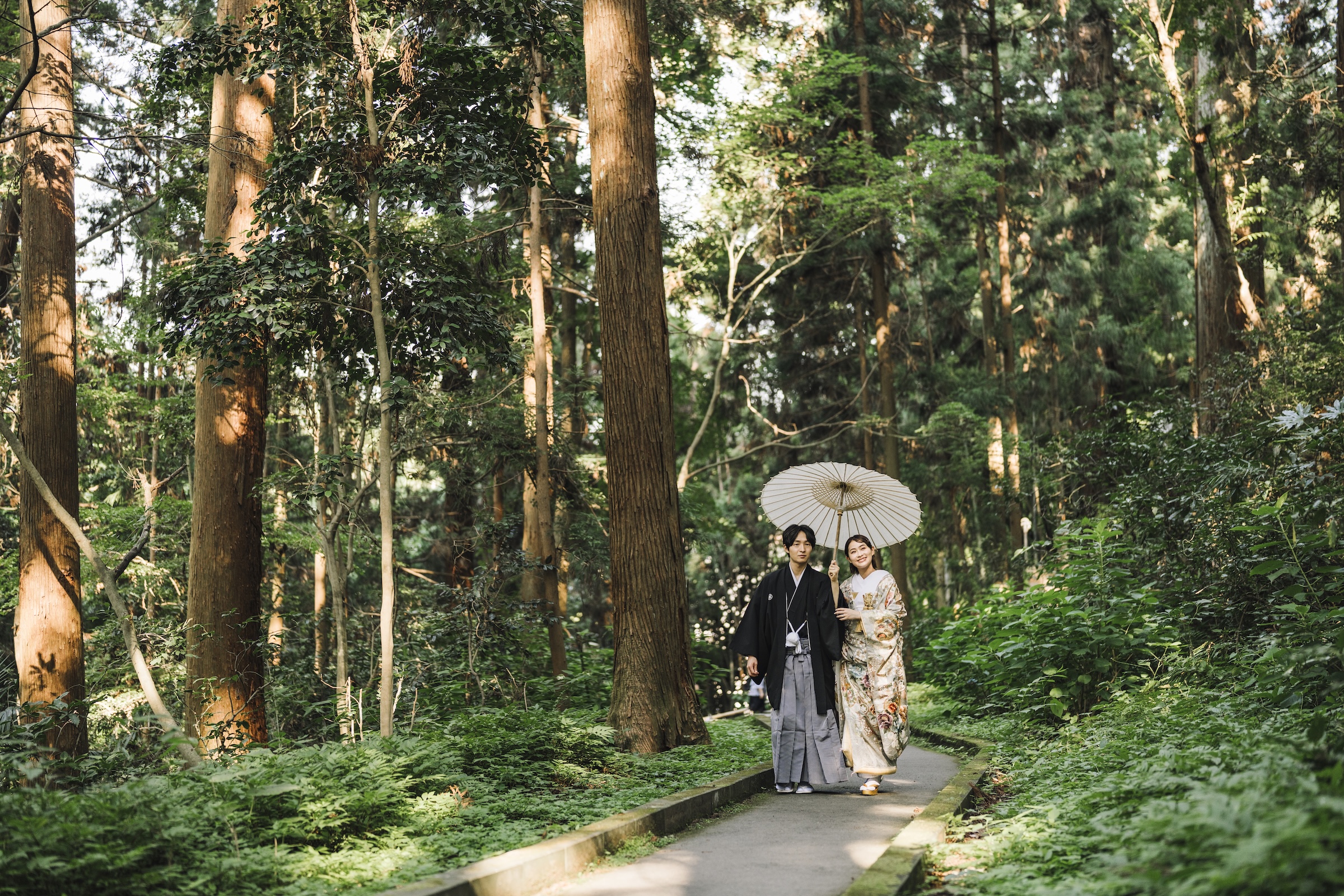 高くそびえる杉木立から差し込む木漏れ日は、まるで自然のスポットライトのよう。その清らかな光が、色打掛の繊細な刺繍や白無垢の美しい織りといった、和装ならではのディテールを立体的に浮かび上がらせます。お二人の姿はもちろん、新郎様・新婦様それぞれの凛としたソロショットにも最適なロケーションです。