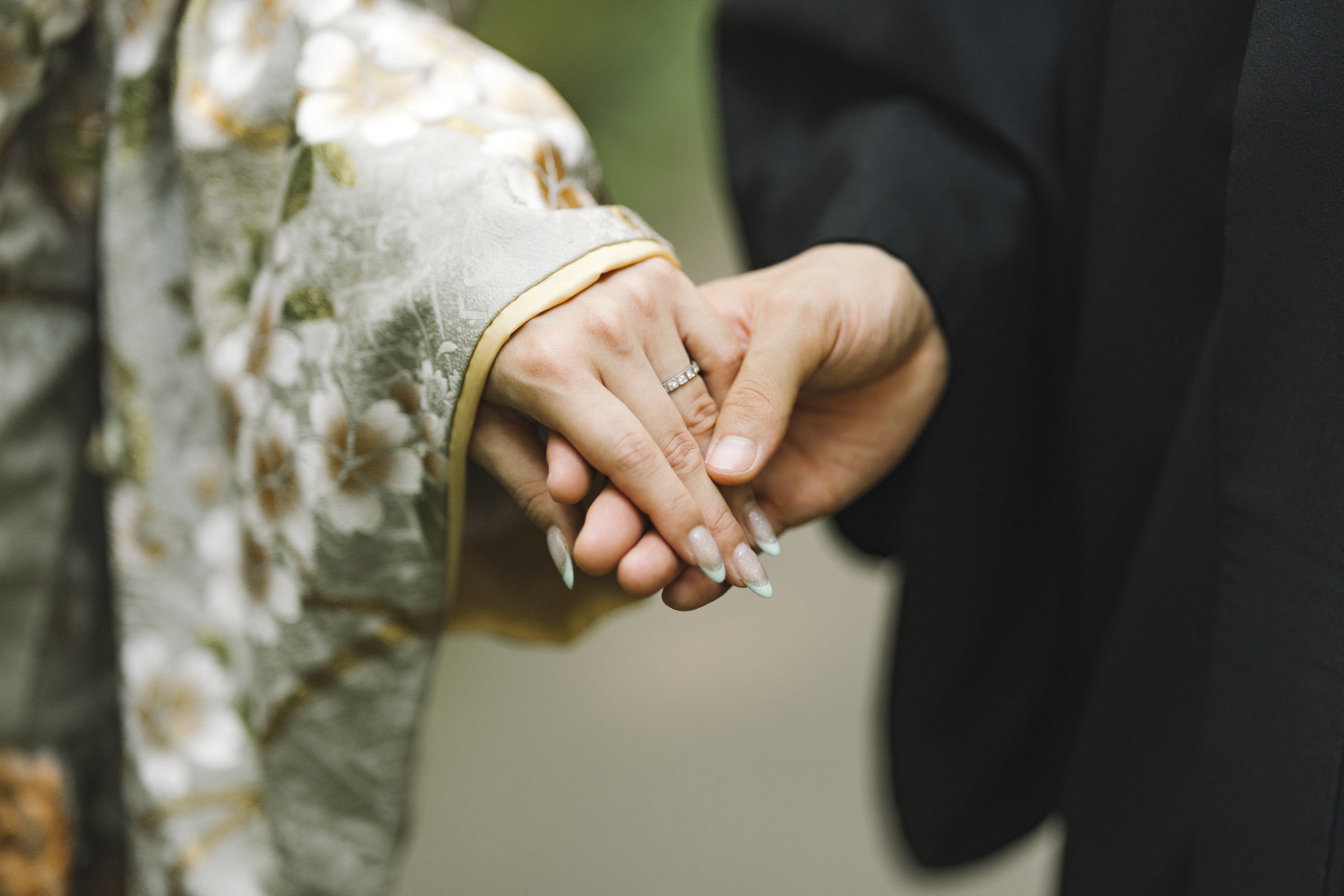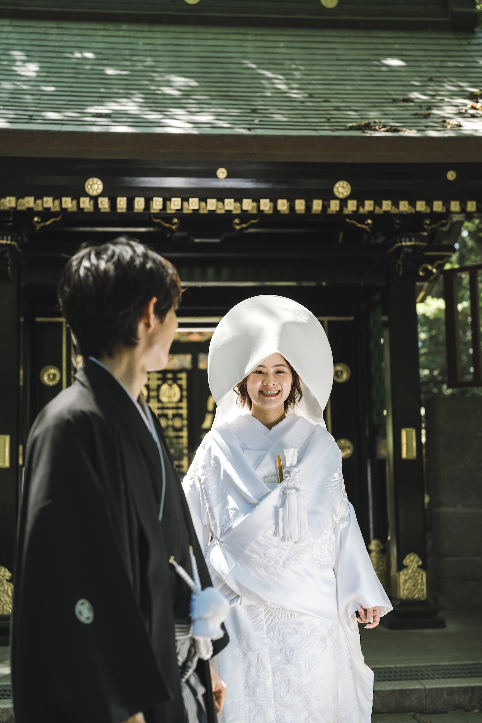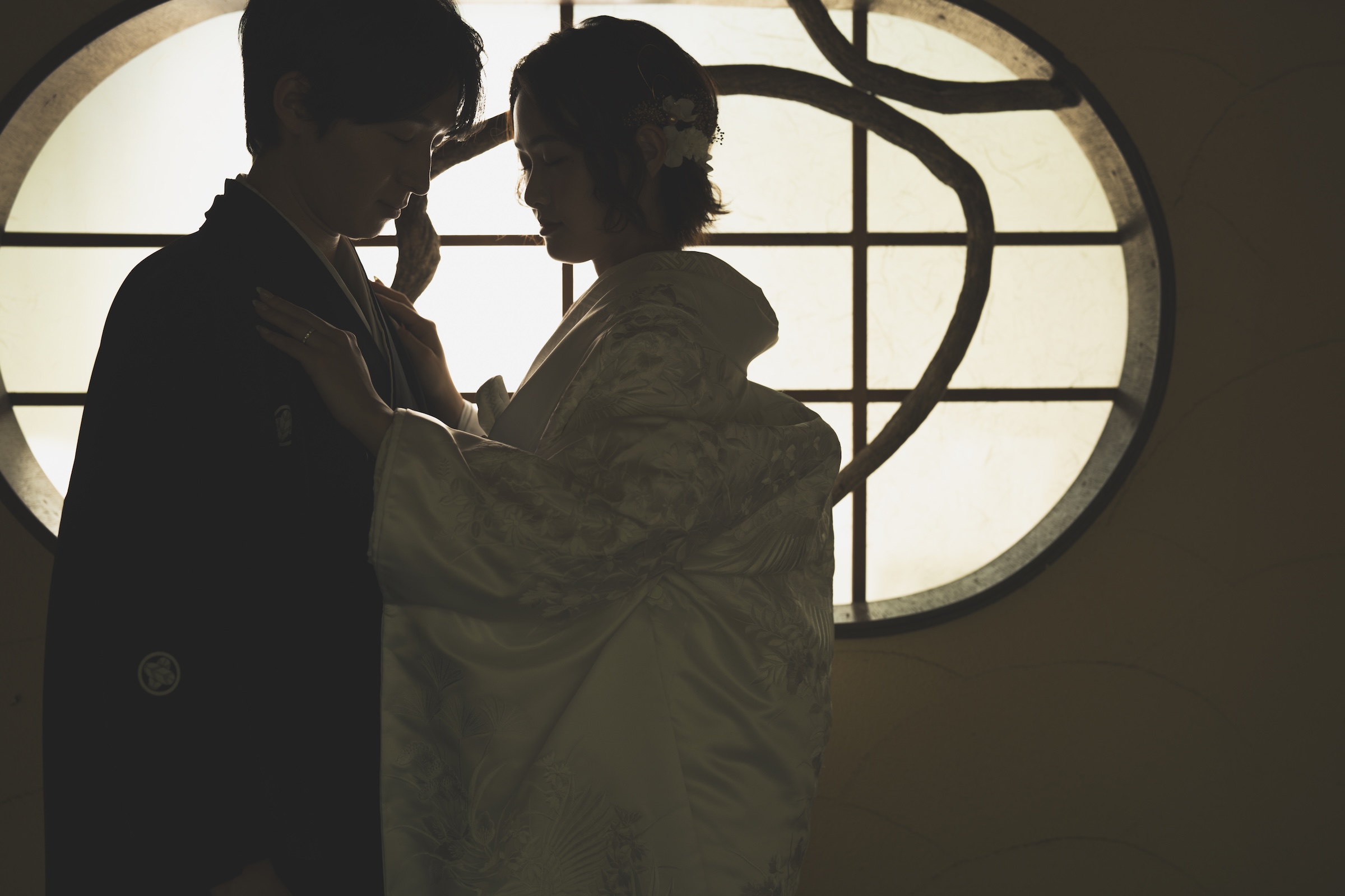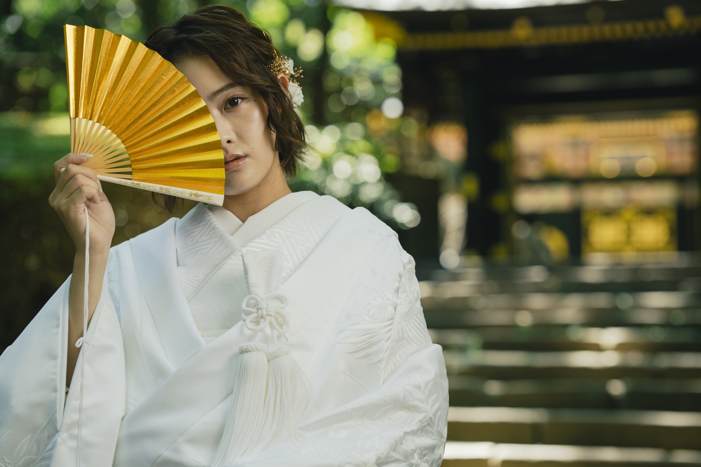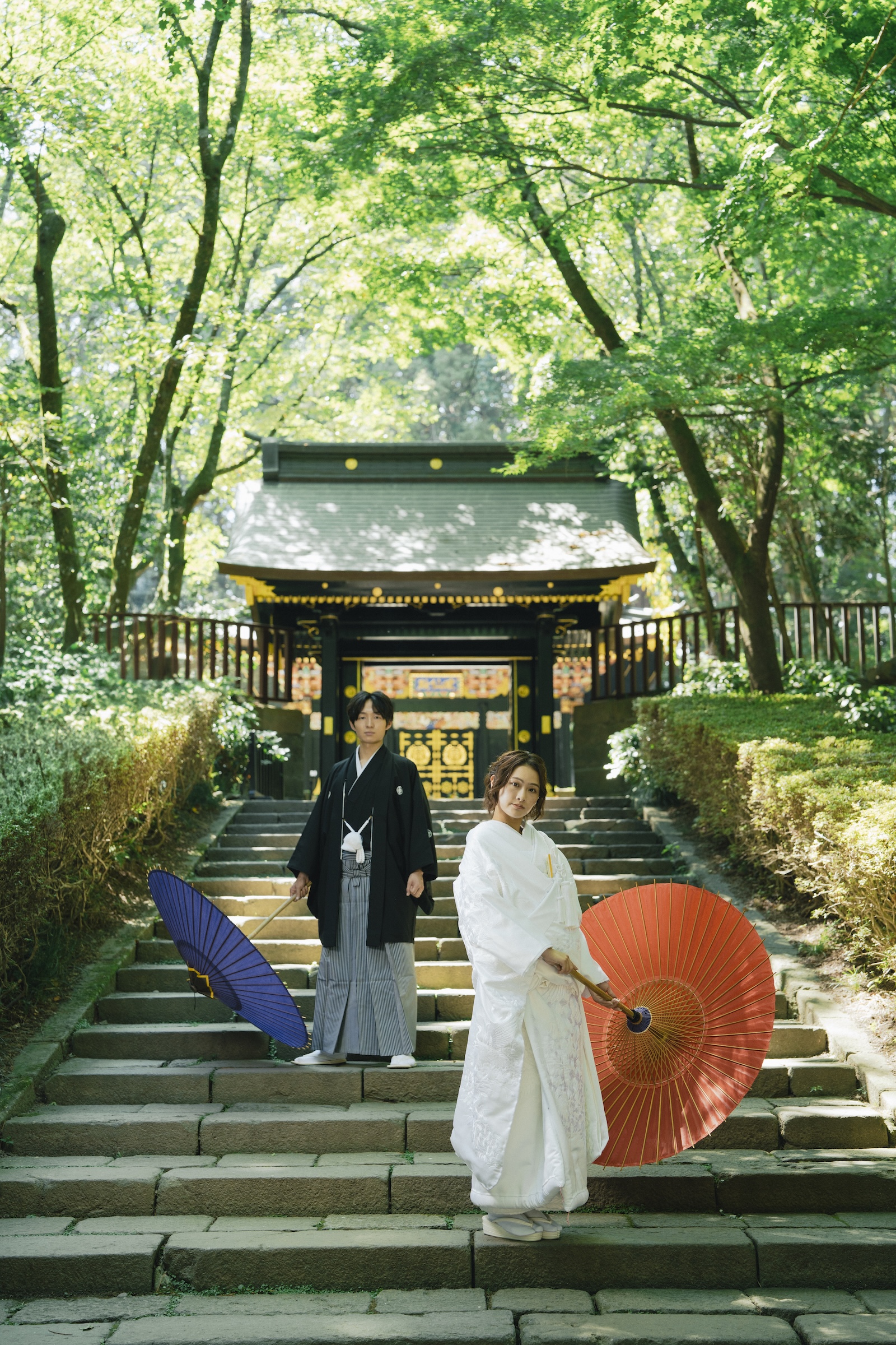 高くそびえる杉木立から差し込む木漏れ日は、まるで自然のスポットライトのよう。その清らかな光が、色打掛の繊細な刺繍や白無垢の美しい織りといった、和装ならではのディテールを立体的に浮かび上がらせます。お二人の姿はもちろん、新郎様・新婦様それぞれの凛としたソロショットにも最適なロケーションです。