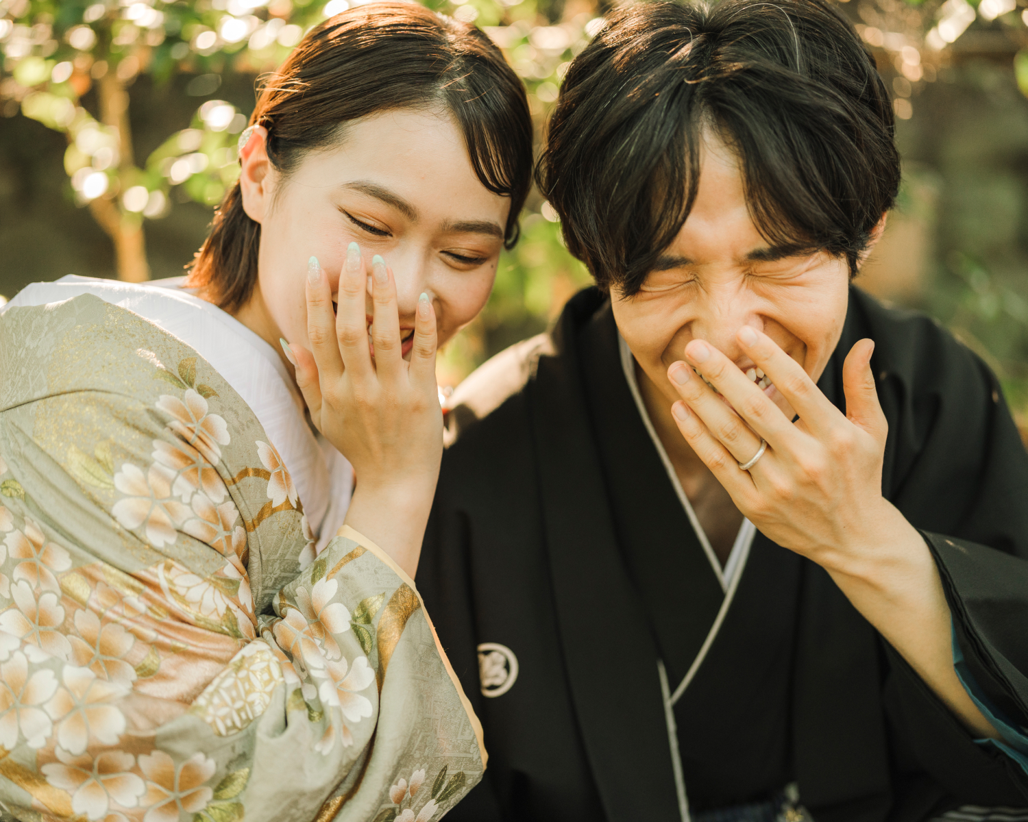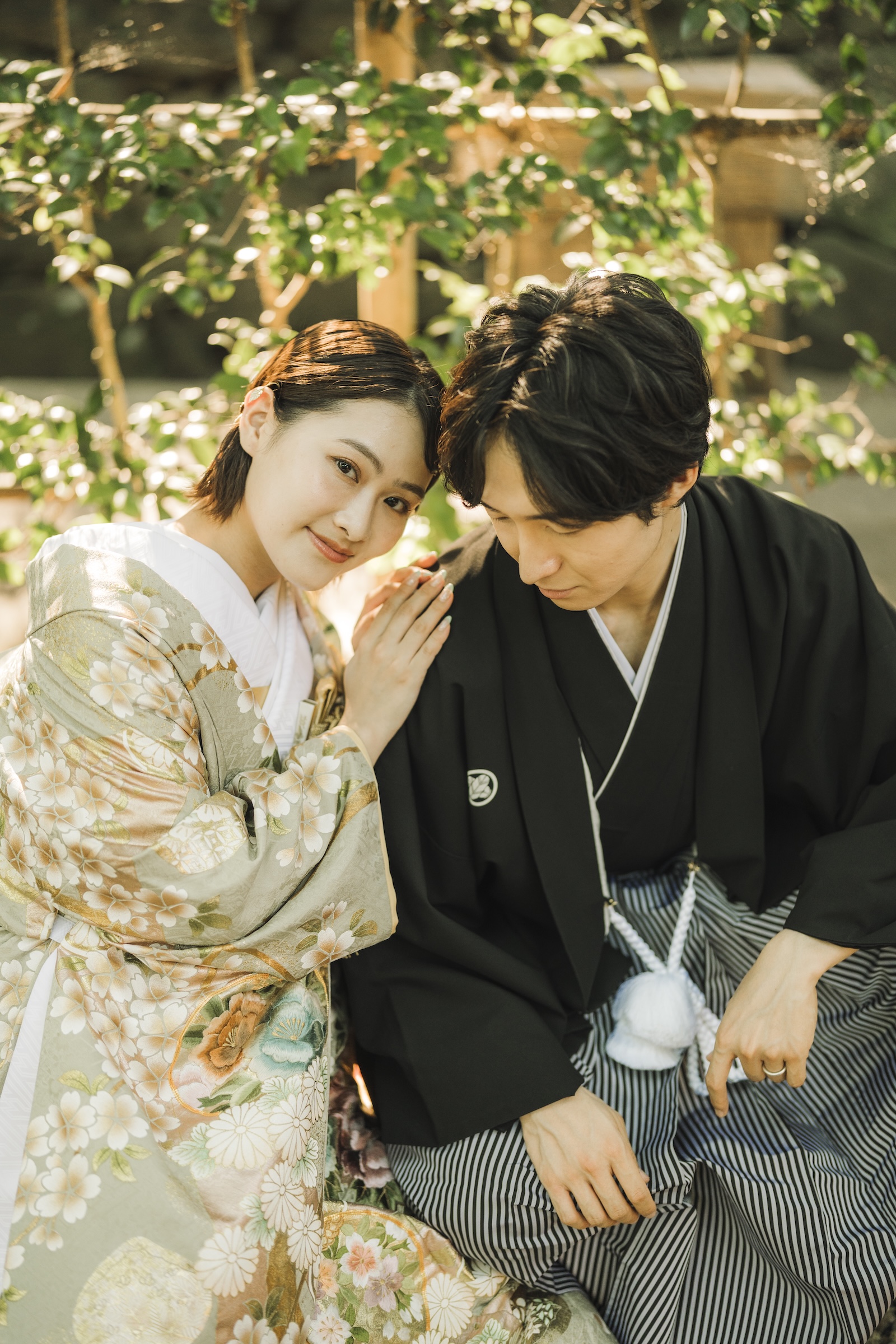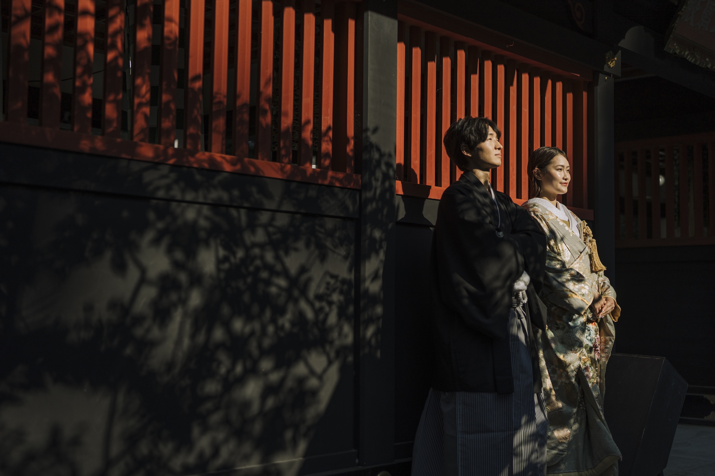 長い年月を経てきたものだけが持つ、静かで趣き深い「わびさび」の風情が漂う参道。すべてが調和した空間の中で、石畳に下駄の音が響く時間は、おごそかながらも温かみも感じます。ただそこに佇むだけで、凛とした和装姿が風景に溶け込む、日本ならではの奥ゆかしい美しさを写真に収めます。