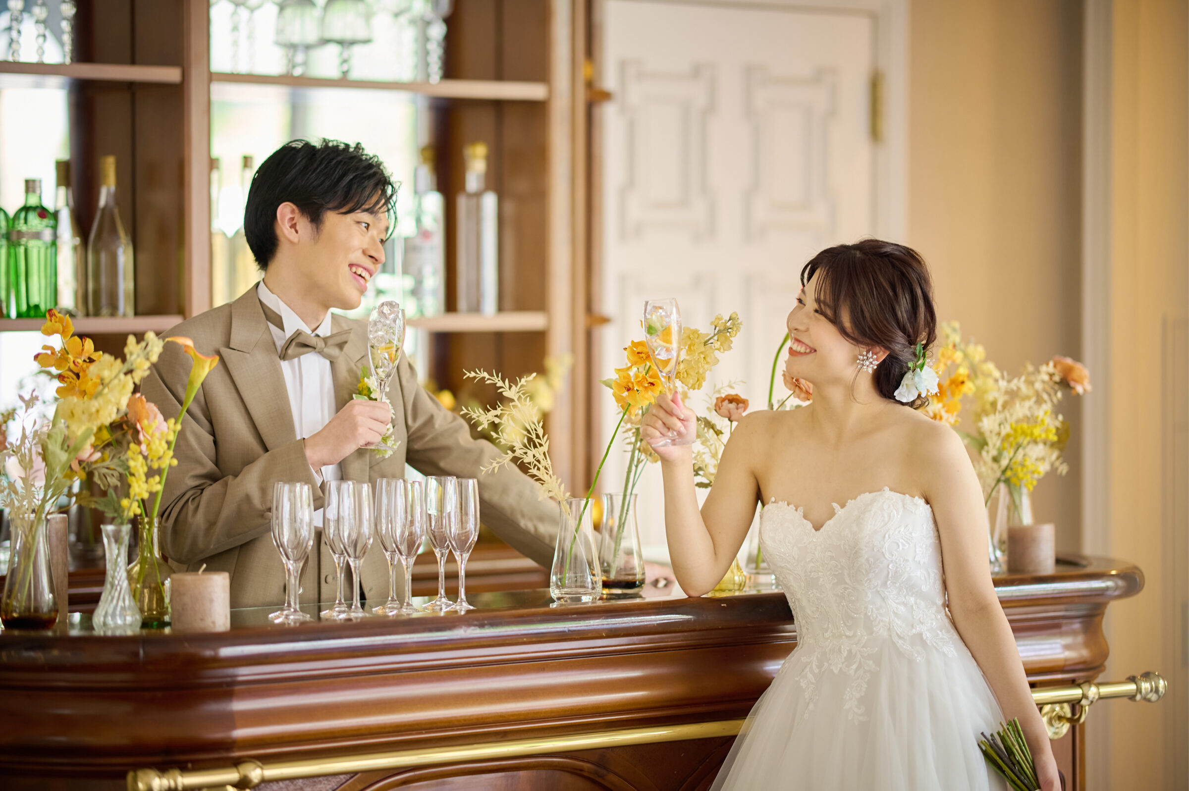 ナチュラルな木目が広がるバーカウンターで、リラックスしたひとときと自然な笑顔がこぼれる、心温まる撮影が楽しめます。