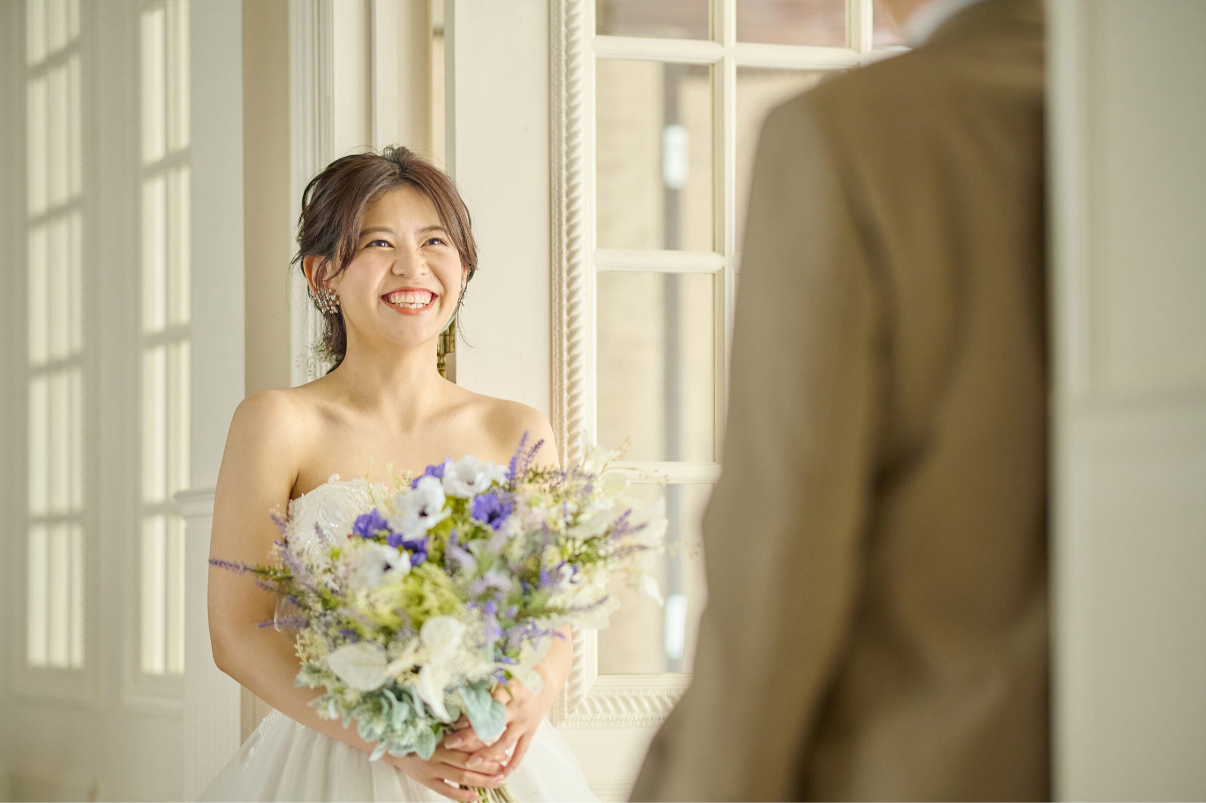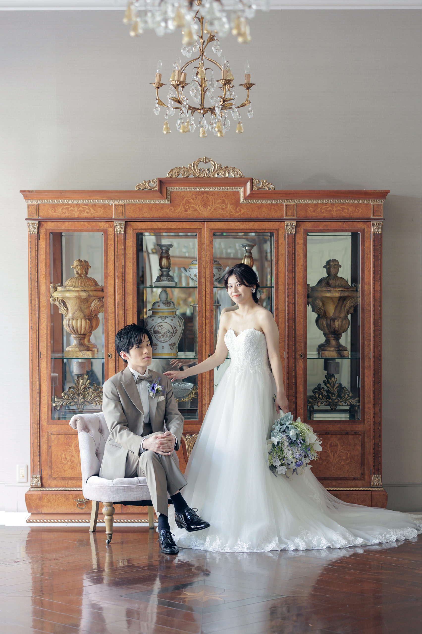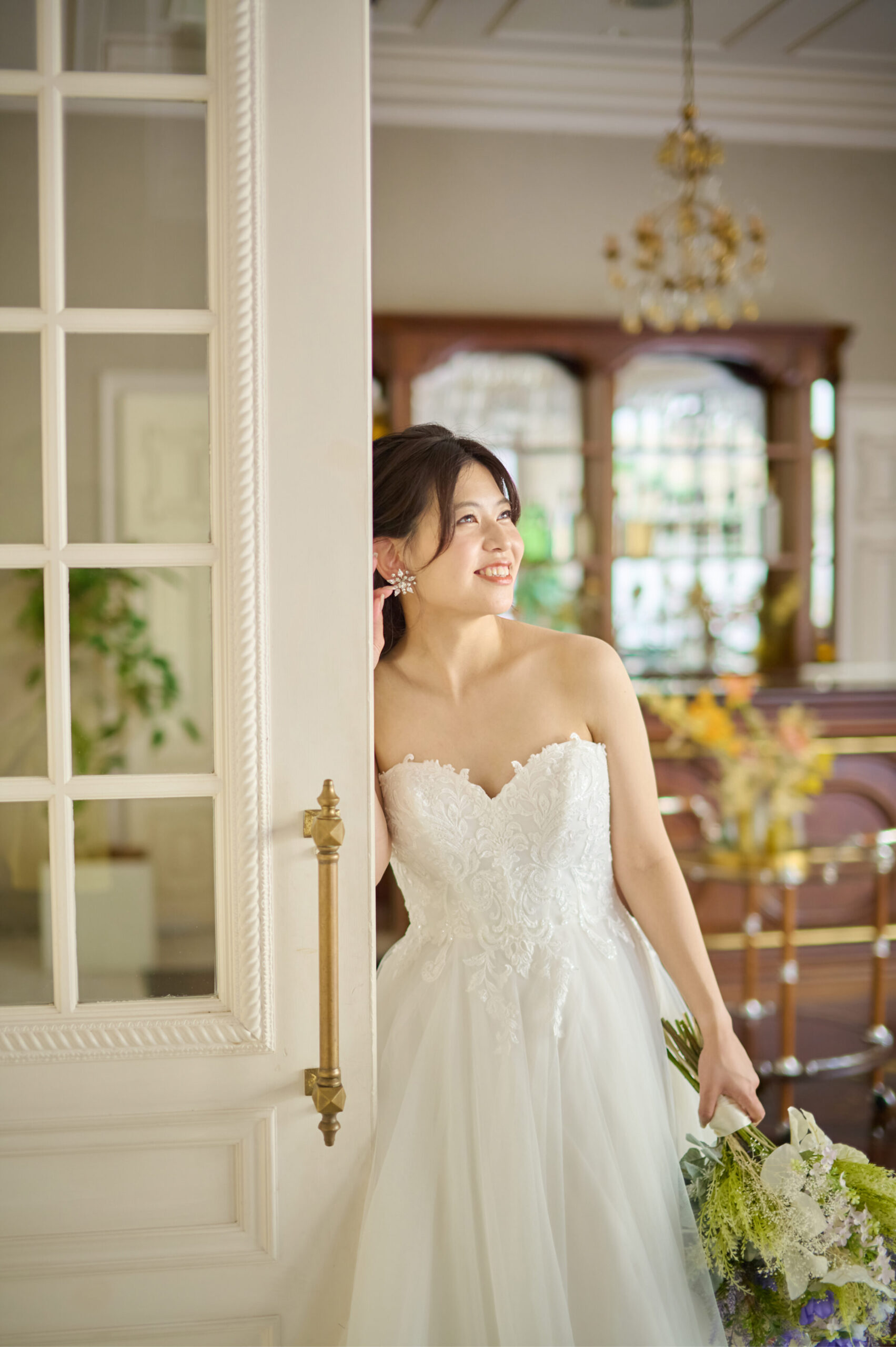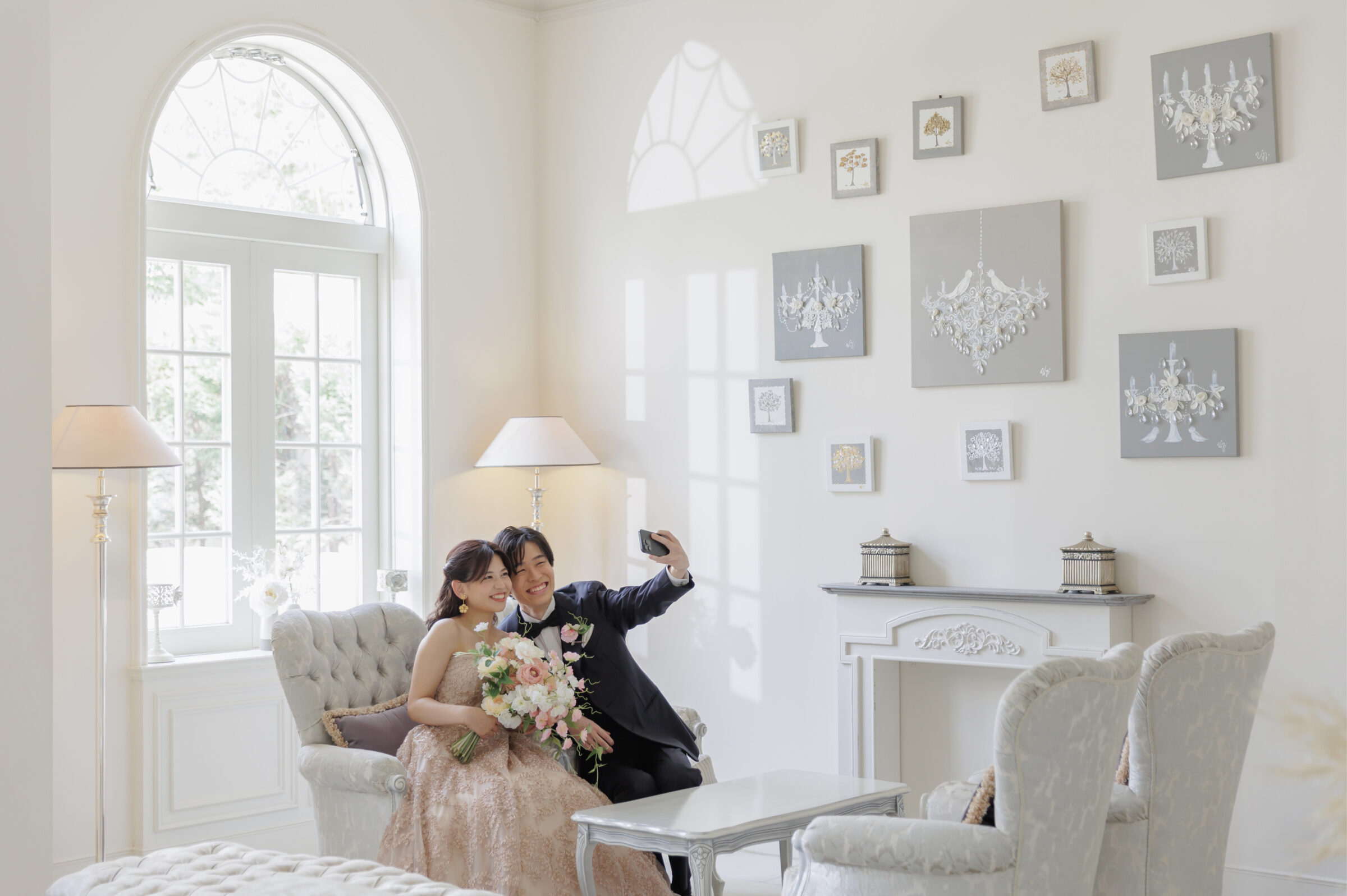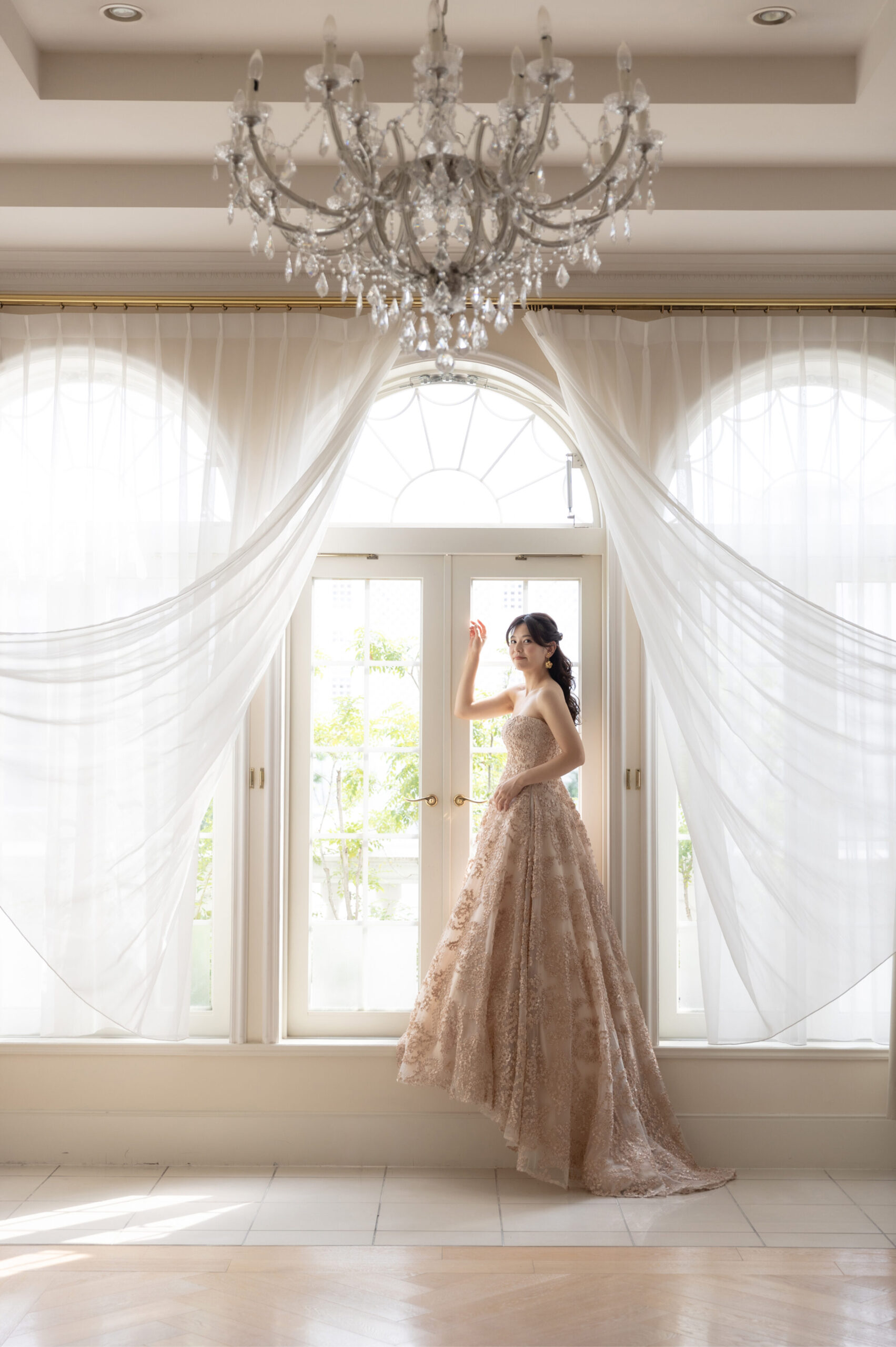 シャンデリアのきらめきと風にそよぐカーテンが、差し込む自然光と溶け合うドラマティックな空間。映画のワンシーンのような写真が叶います。